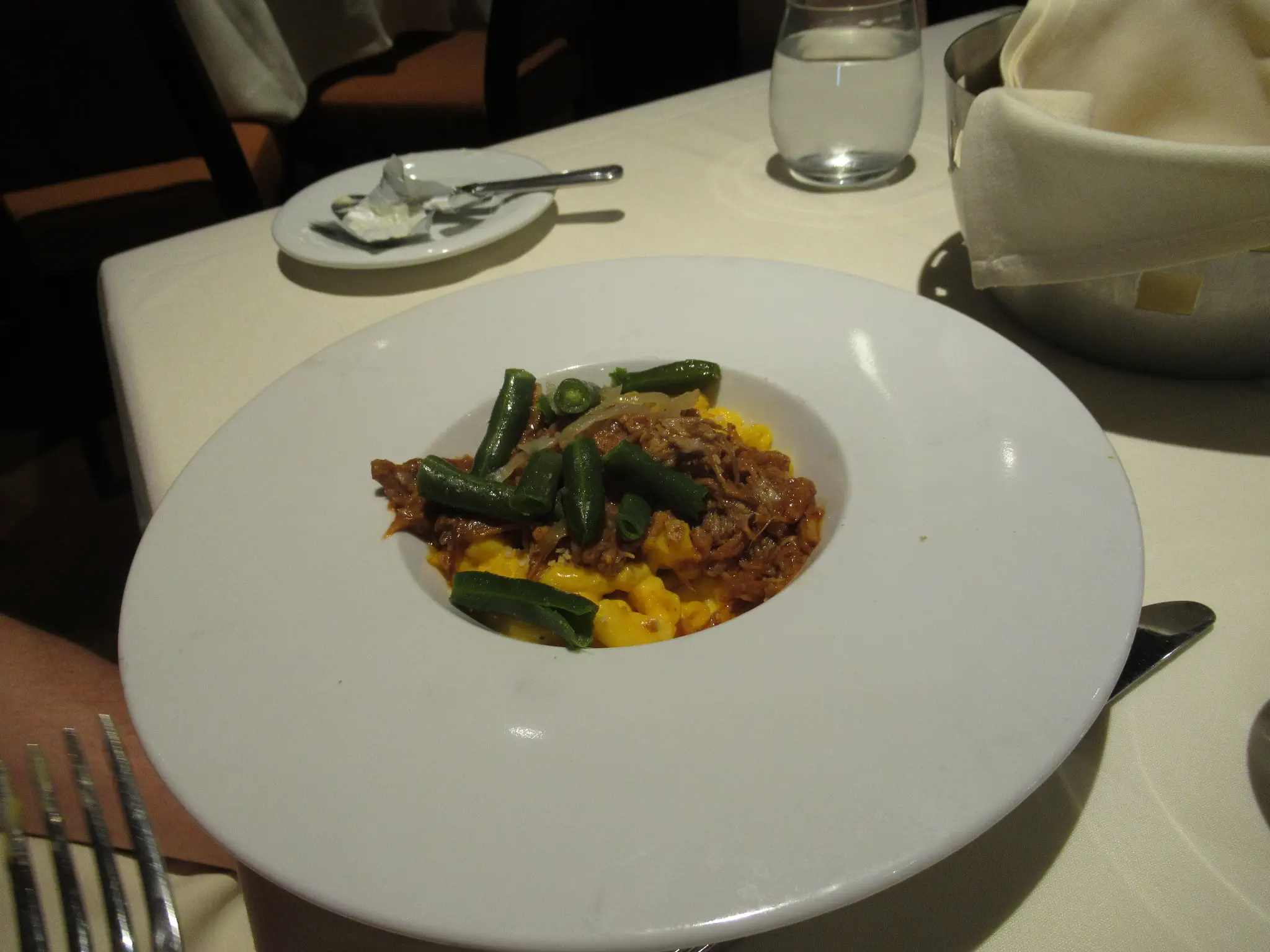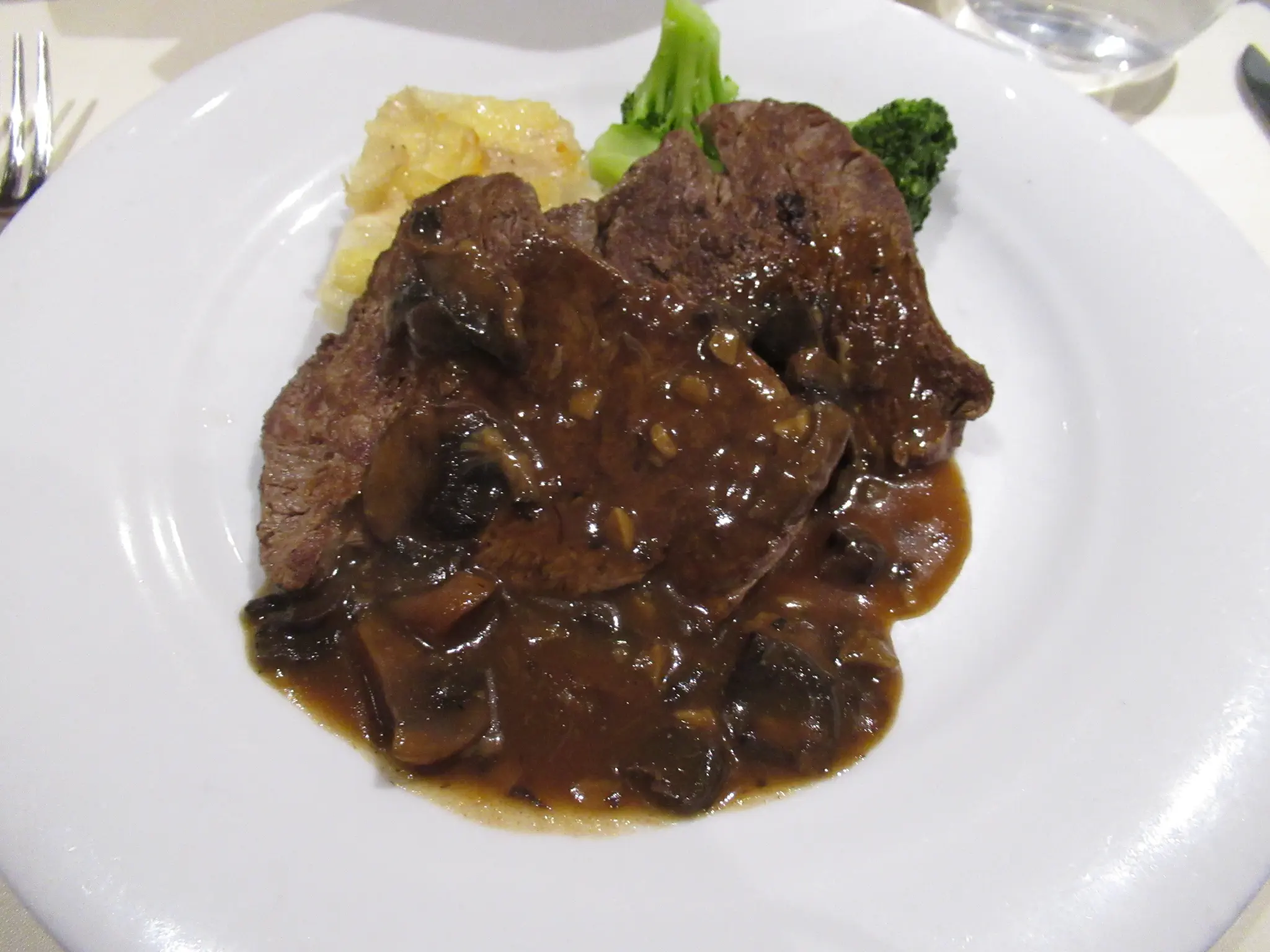 Travis ordered clam and linguini, but Ramon noted the pasta being too soft that day, so Travis changed it to the shrimp, noting going back and forth between the two options. Ramon brought both without the $5 charge. I only have a picture of the linguini. The shrimp was really good and the linguini okay. We noticed the next table sending it back. Ramon was right. My Steak Diane was pretty good (again not the same as the paid steakhouse). The kids got pulled pork and mac & cheese that Joel thought was very good and Owen did not like much.