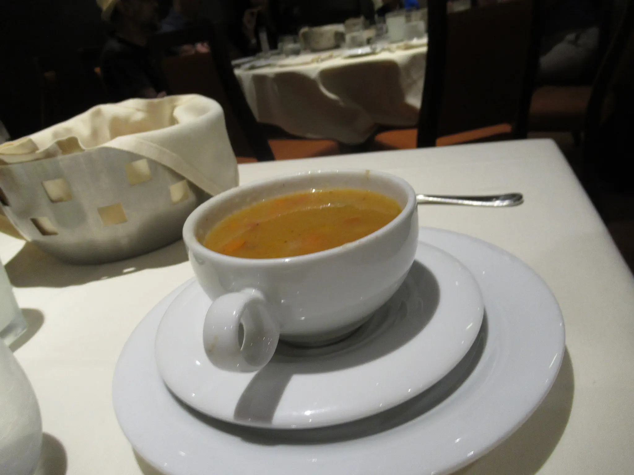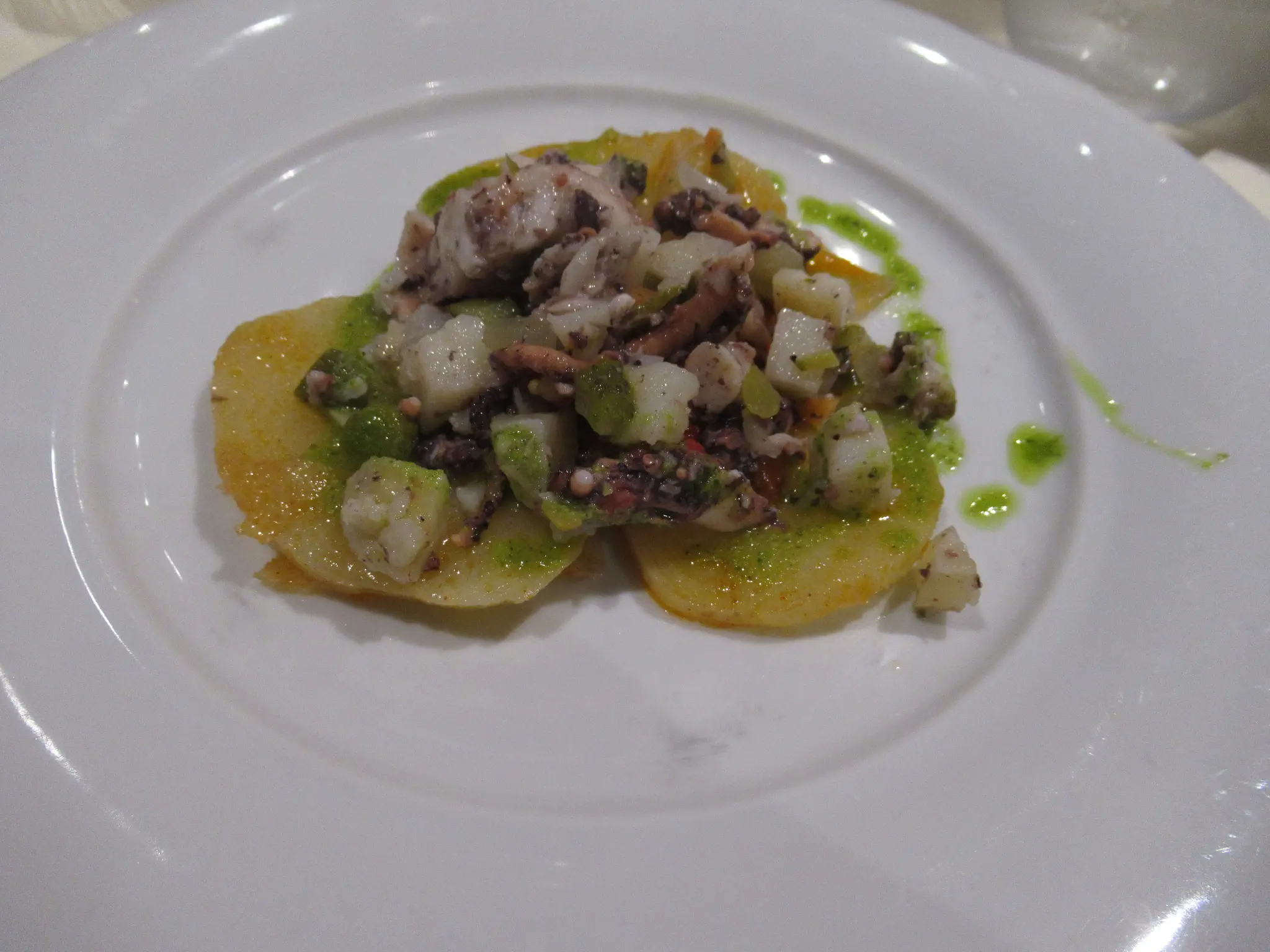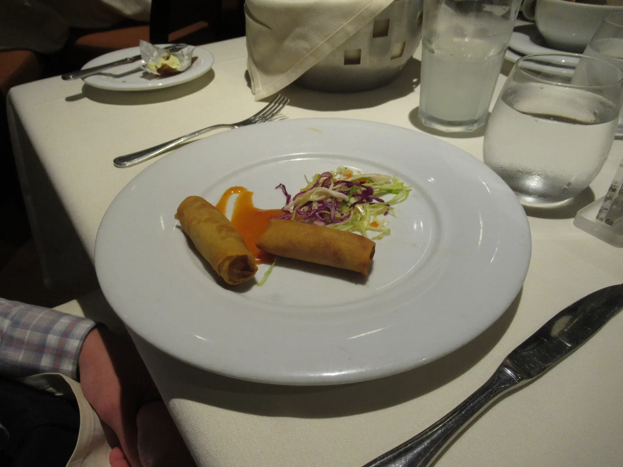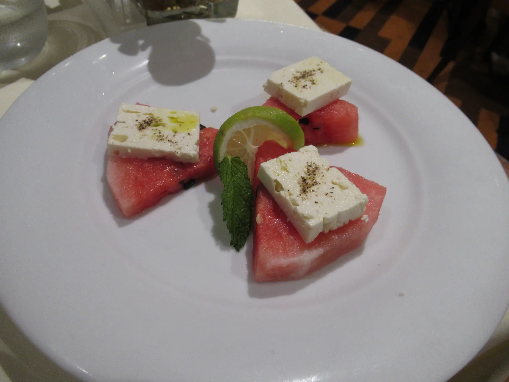 Owen's beef and barley soup without much beef. Travis's marinated octopus and watermelon and feta. Joel got the vegetable spring roll that he said was good but small.