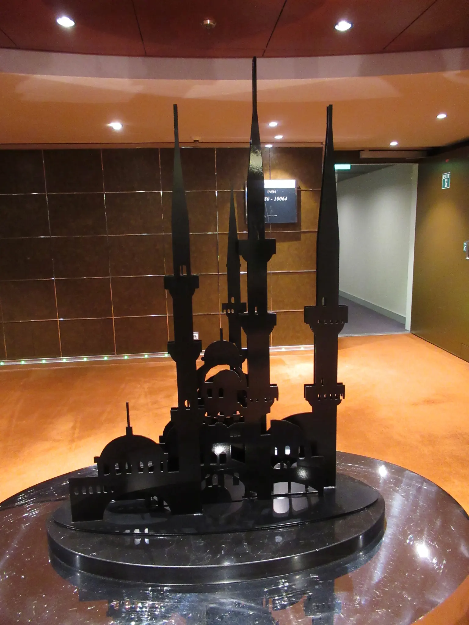Each deck had a place name with nice pictures from that place and a metal statue like this. We stayed on 10 - Hagia Sophia, so I got a picture of it. Today we played a chilly trivia by the pool, and the kids each won an MSC baseball cap.