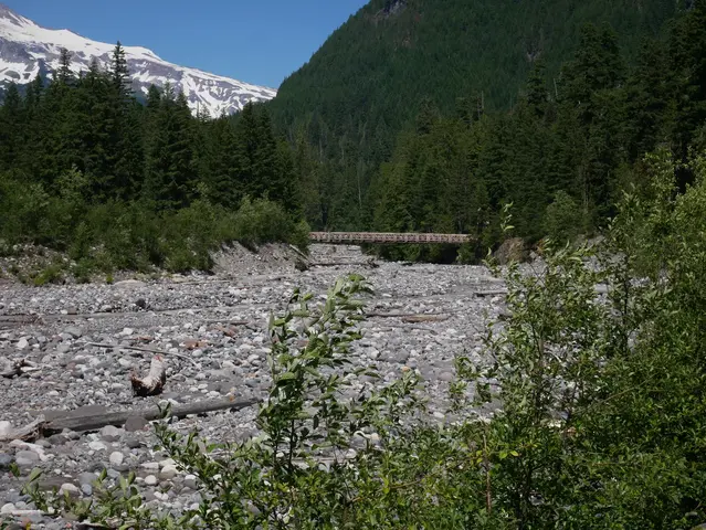 We were very luckily the mountain was out the full time that we were there. Our first stop was Longmire seeing the Wilderness Access Center (NP Passport stamp, wifi, and asking about the snow on the Skyline trail), visited the historic gas station, we missed the museum, and the historic one lane bridge -- good view of Mt. Rainier and the Nisqually river. We were planning to hike the Skyline trail the next day, and it had snowed June 17th and 25th with online maps of the snow coverage and snow hiking prep. I was asking about snow cover at WAC, and she recommended asking in Paradise instead that they would be more up to date since they are closer. However, Visitor Centers do not open early enough for when we need to start early hikes.