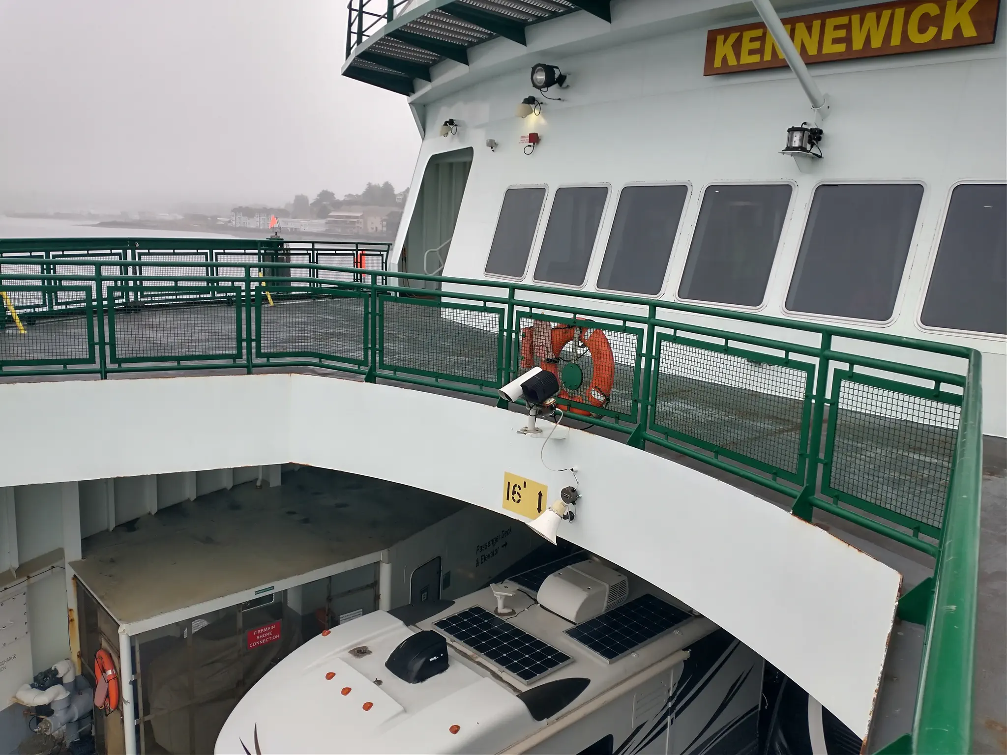 We were on the Kennewick. We went up for a view; it was windy and chilly. Then we found an inside front view. Here are some views from the ferry and the big vehicle/RV in front. It was also a foggy morning. I overheard some locals talking and noting that it would burn off pretty quickly.
