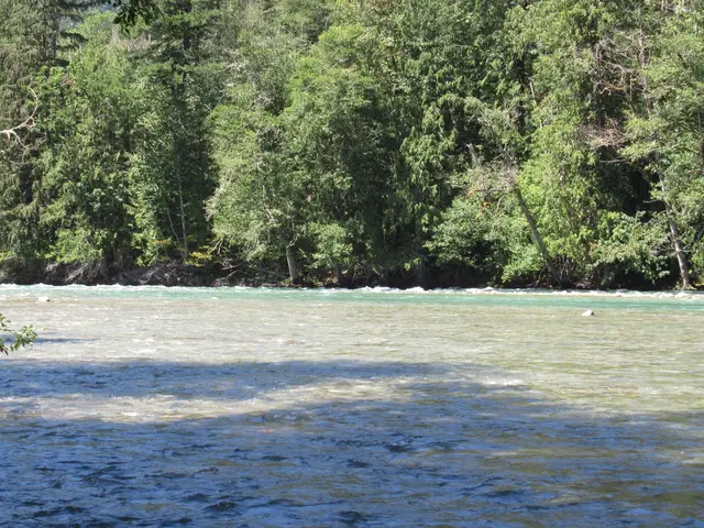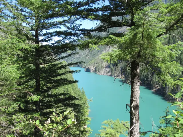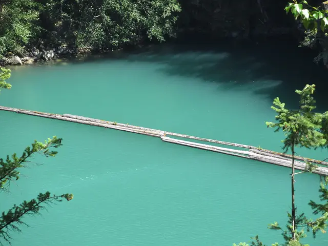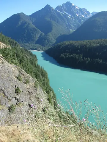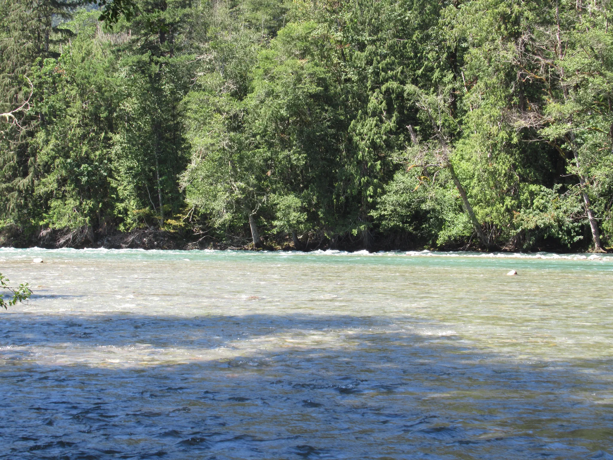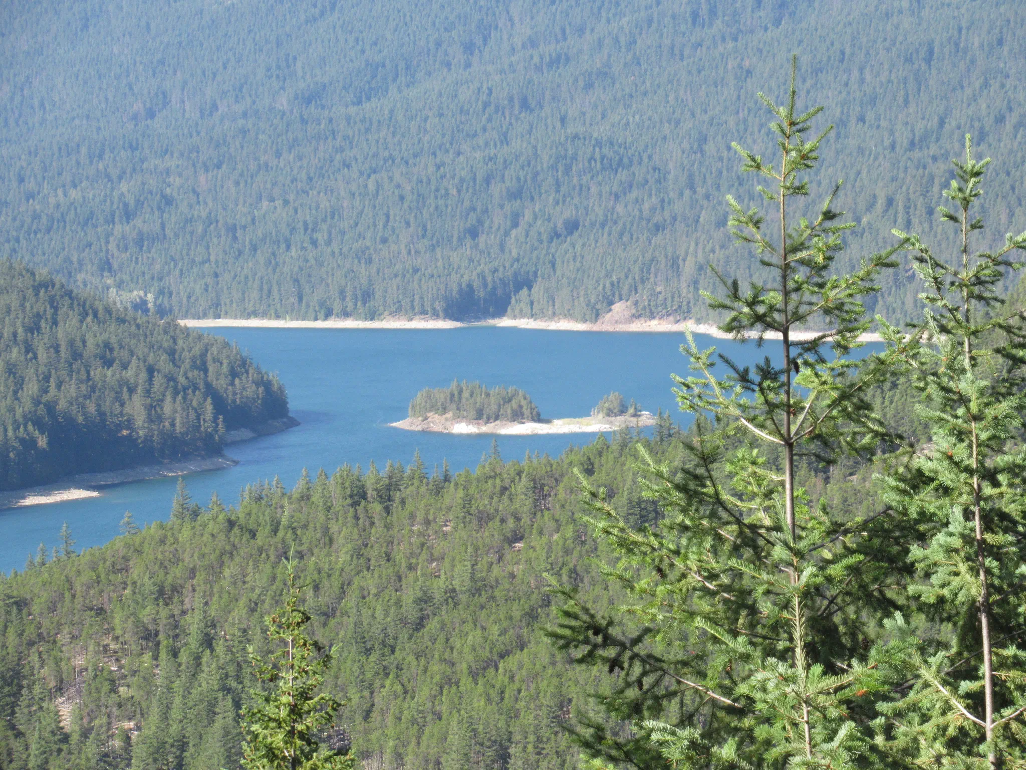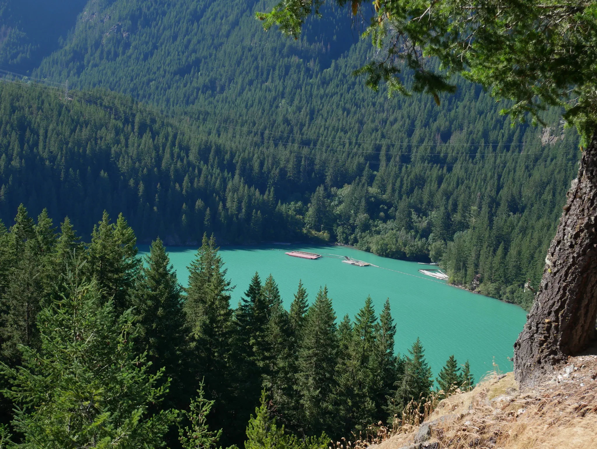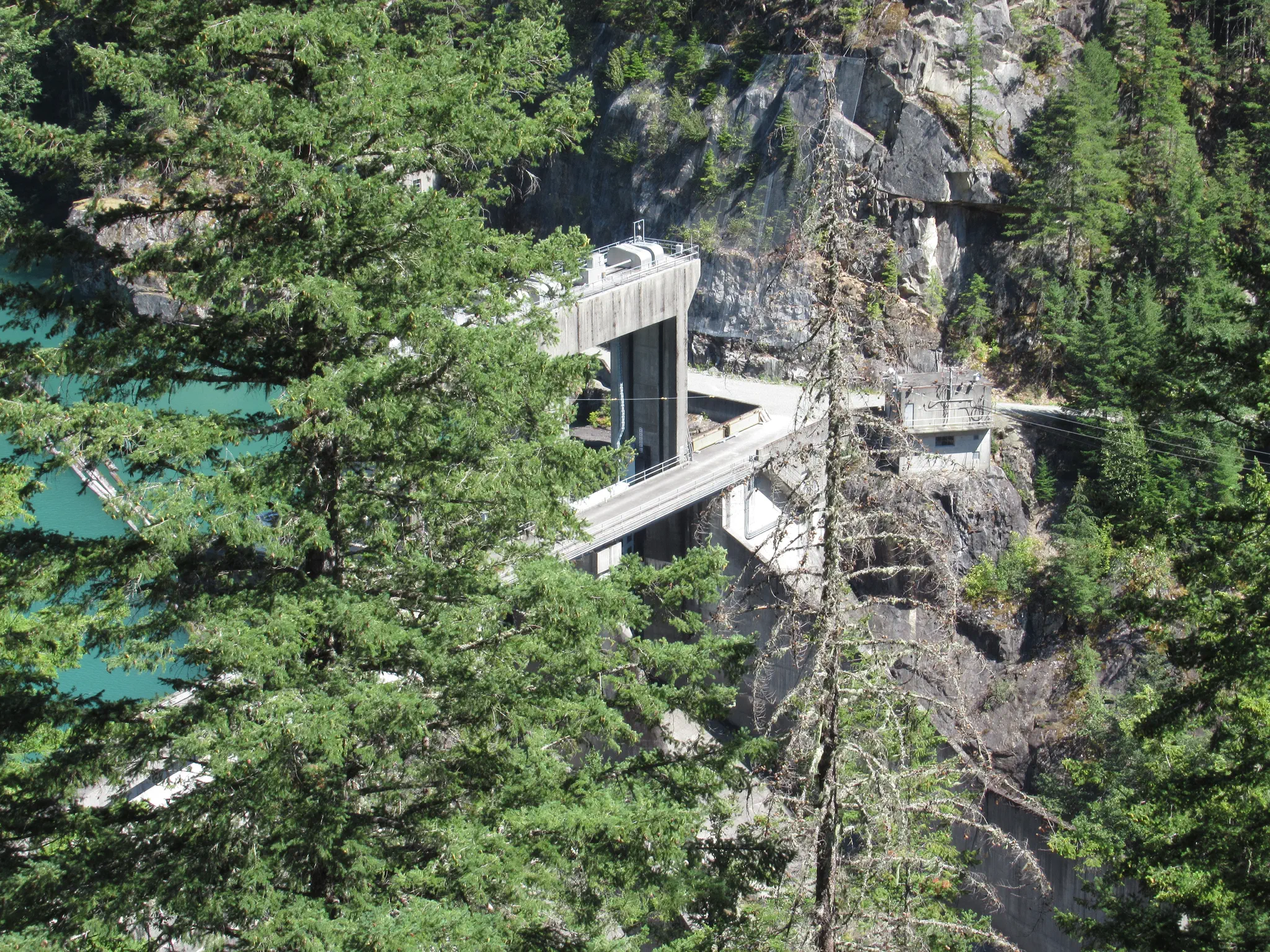 We were close to the Gorge Dam, so we stopped here though Travis was eager to get to the campsite. It was not just a pull off but a longer hike, but we did it because I did not realize that it was going to be longer. Look at that pretty turquoise, glacial flour water. They used logs to keep debris from getting into the dam operations. Then a picture of the dam.