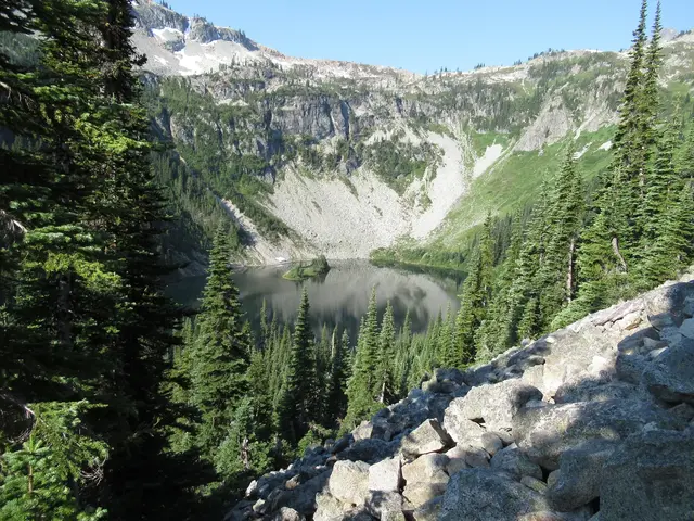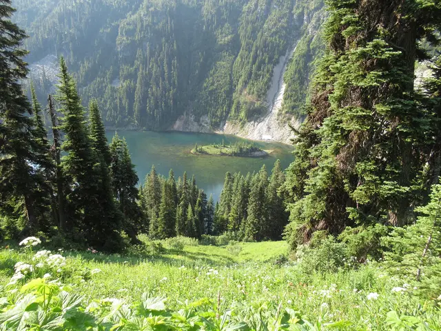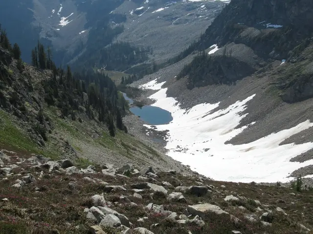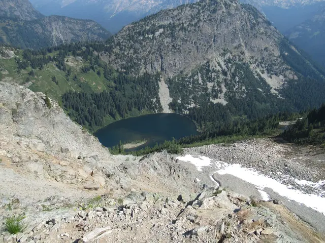 Then we found the second lake, could see Rainy Lake from Maple Pass Loop, with snow up to it. You also see the trail back down. Some of the Rainy Lake trail was part of our trail down; it was paved. However, we did not do the trail. Now that I realize that this is Rainy Lake, we should have. On the hike, Travis's bird app identified a sooty grouse. We heard it going up and down at the lower elevations. Travis saw two weasels that I just saw/heard some movement but never found them. I did see a pika with a green stem in his mouth.