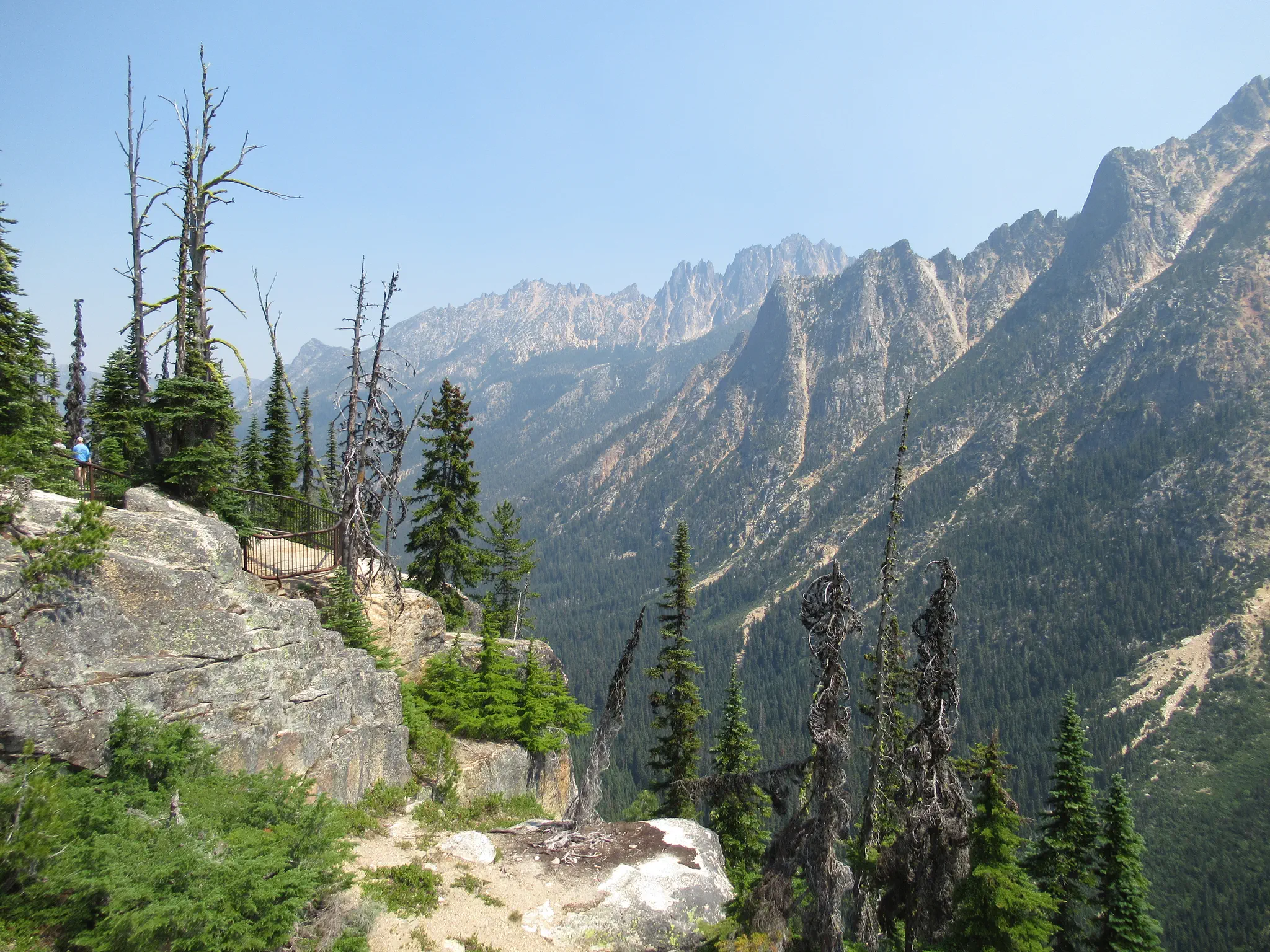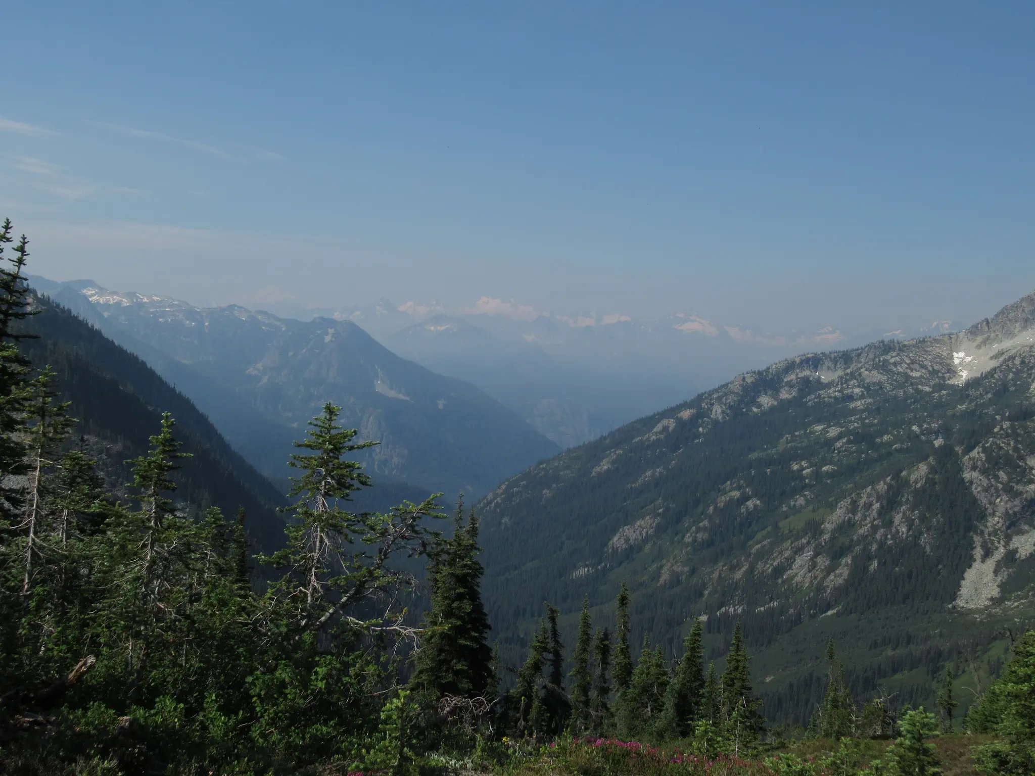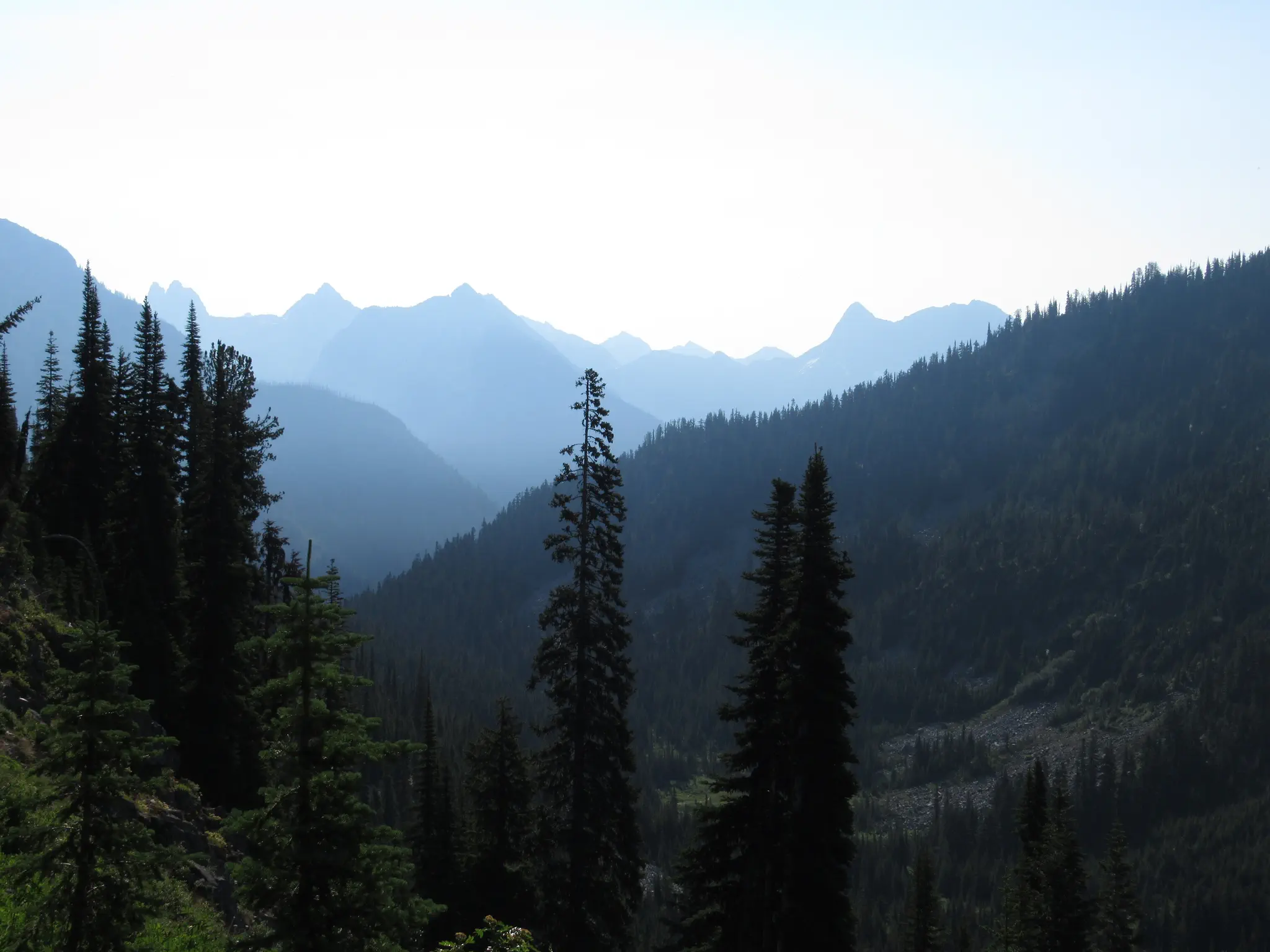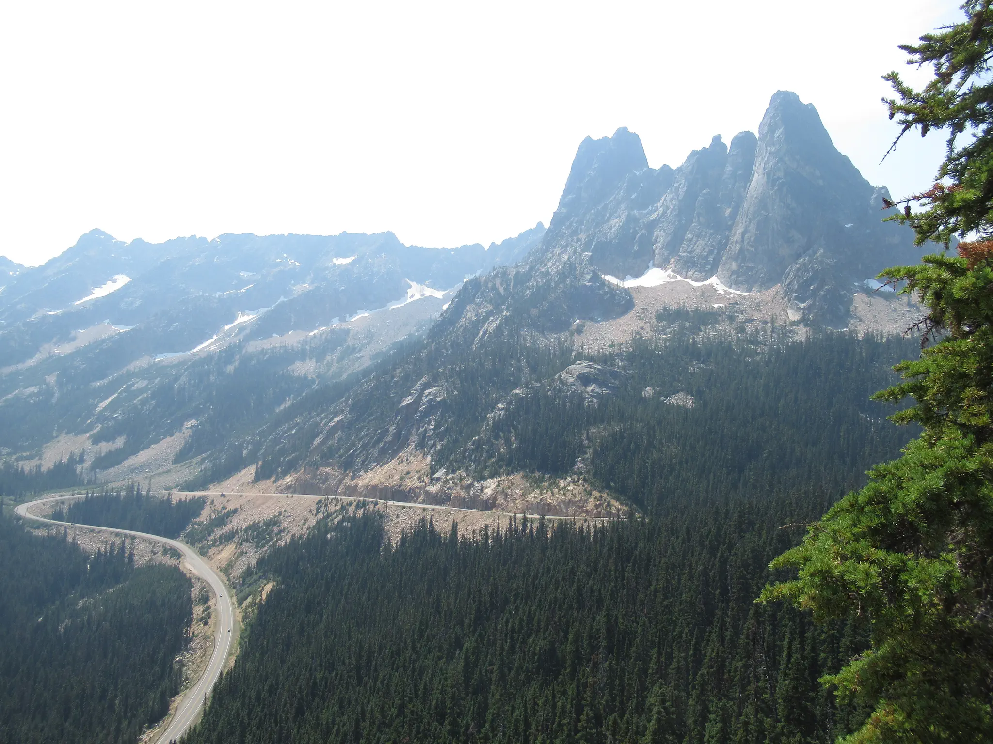 After Maple Loop, we went further east to Washington Pass and then on to Winthrop (a cut Old West Town) where we got some gas and ice cream. None of the parks had gas for sale (though Olympic does not have many roads through it where you will be inside the park for a long distance). The gas pumps were right on the main street with spinning dials/no credit card slot, so we had to go in to pay and get ice cream. In the picture is the big downhill road toward Winthrop and more on the haziness later.