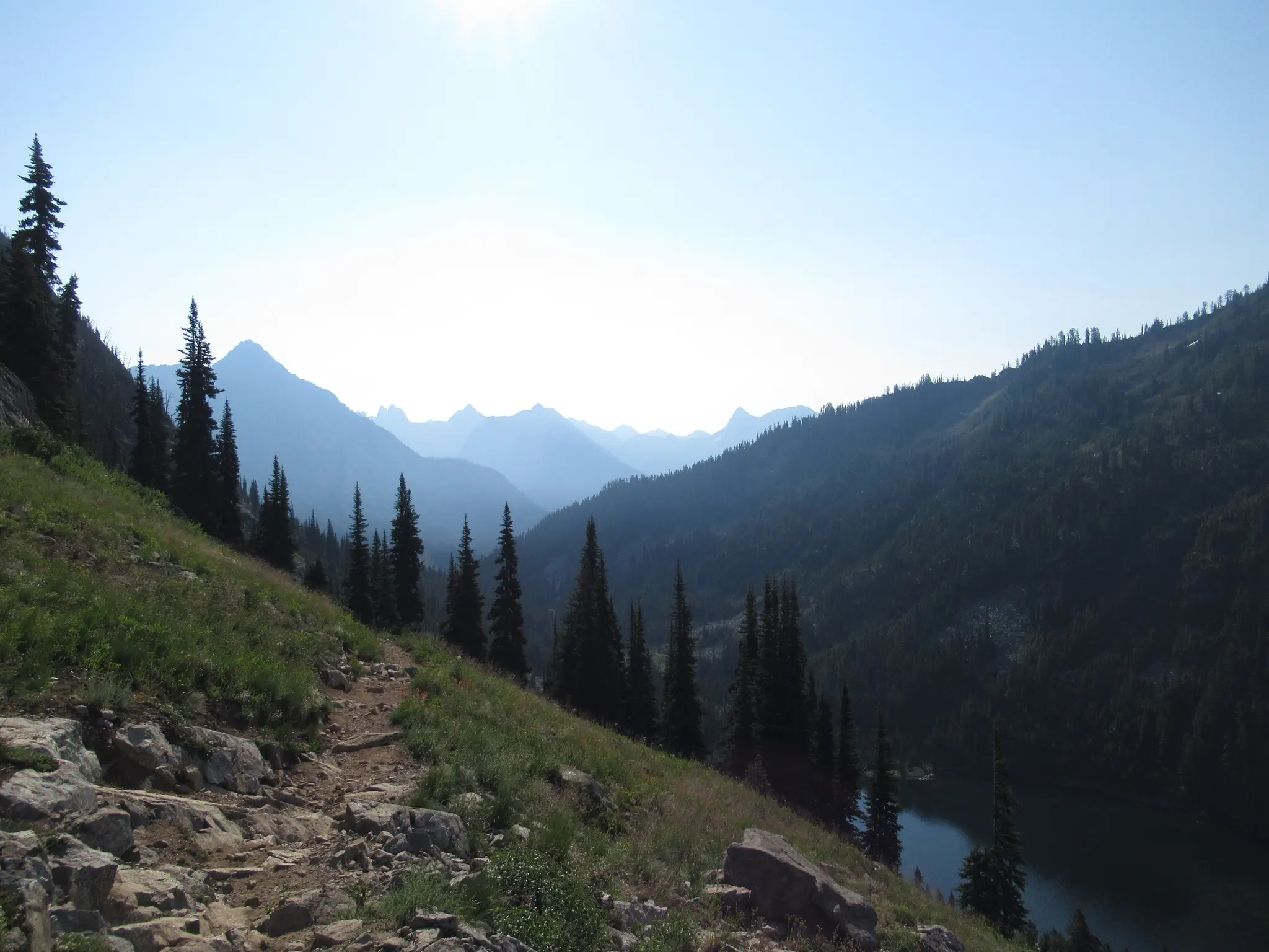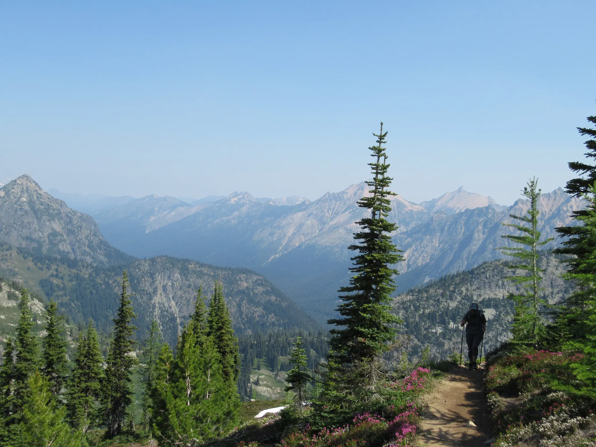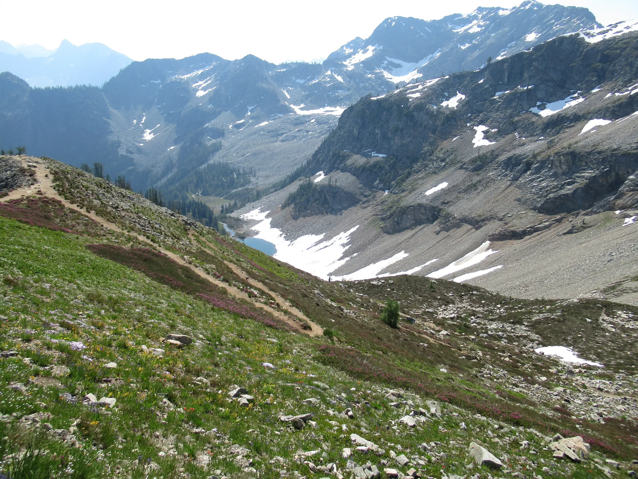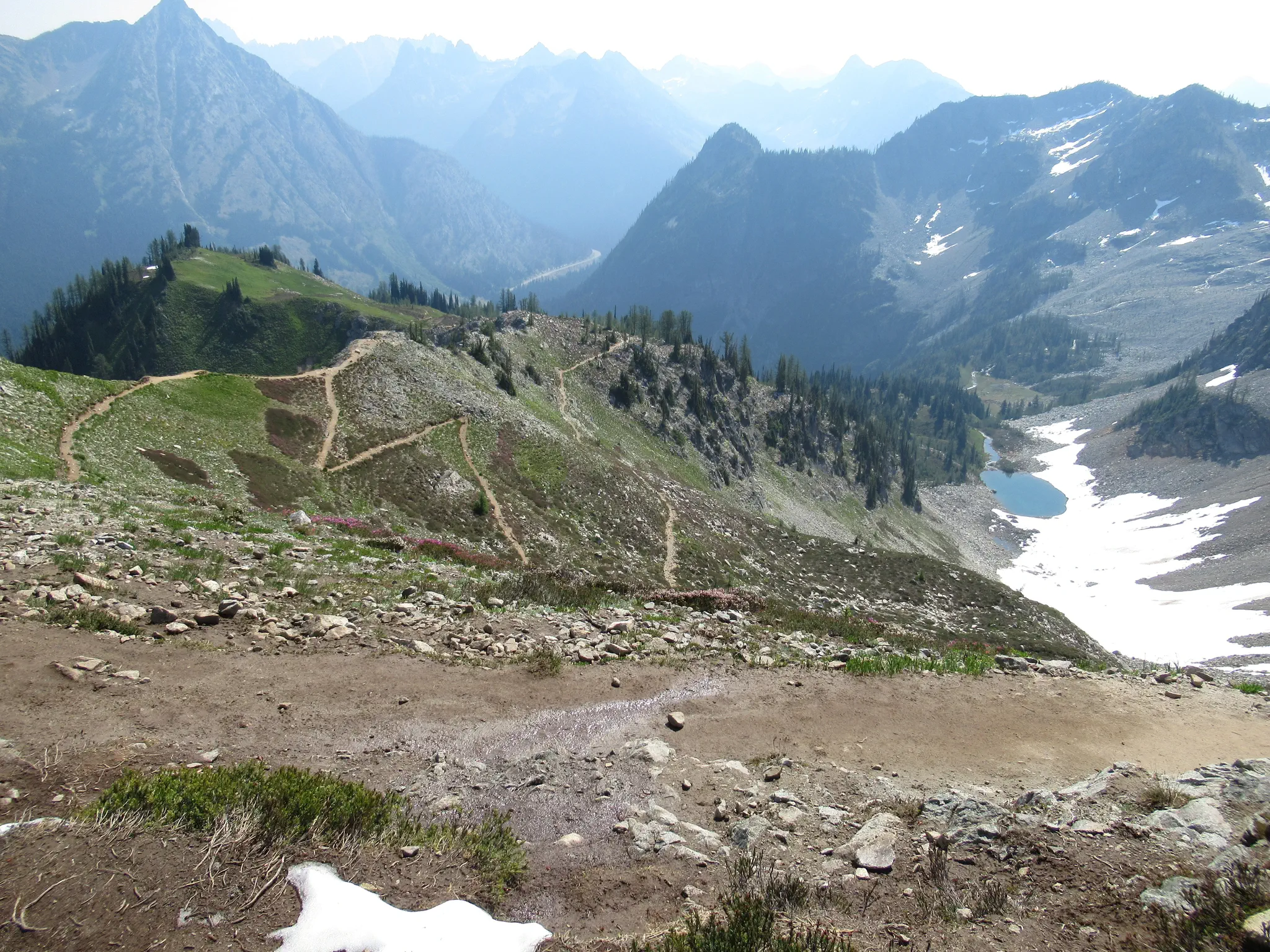 We hiked the main trail counter-clockwise, which was recommended on the internet. Though I was shocked/disappointed that there was a lot of uphill after what I thought was Maple Pass, thinking it was all downhill after the Pass. Maple Pass was the second heavily mosquito area; we stopped for a snack there. Travis said that we had to climb out of the Pass. Downhill was steep, so would have been steep uphill, if hiked the opposite direction, so I think still a good recommendation. Also, the views were supposed to be better going down if hiked counter-clockwise. It was pretty. Okay, some pictures.