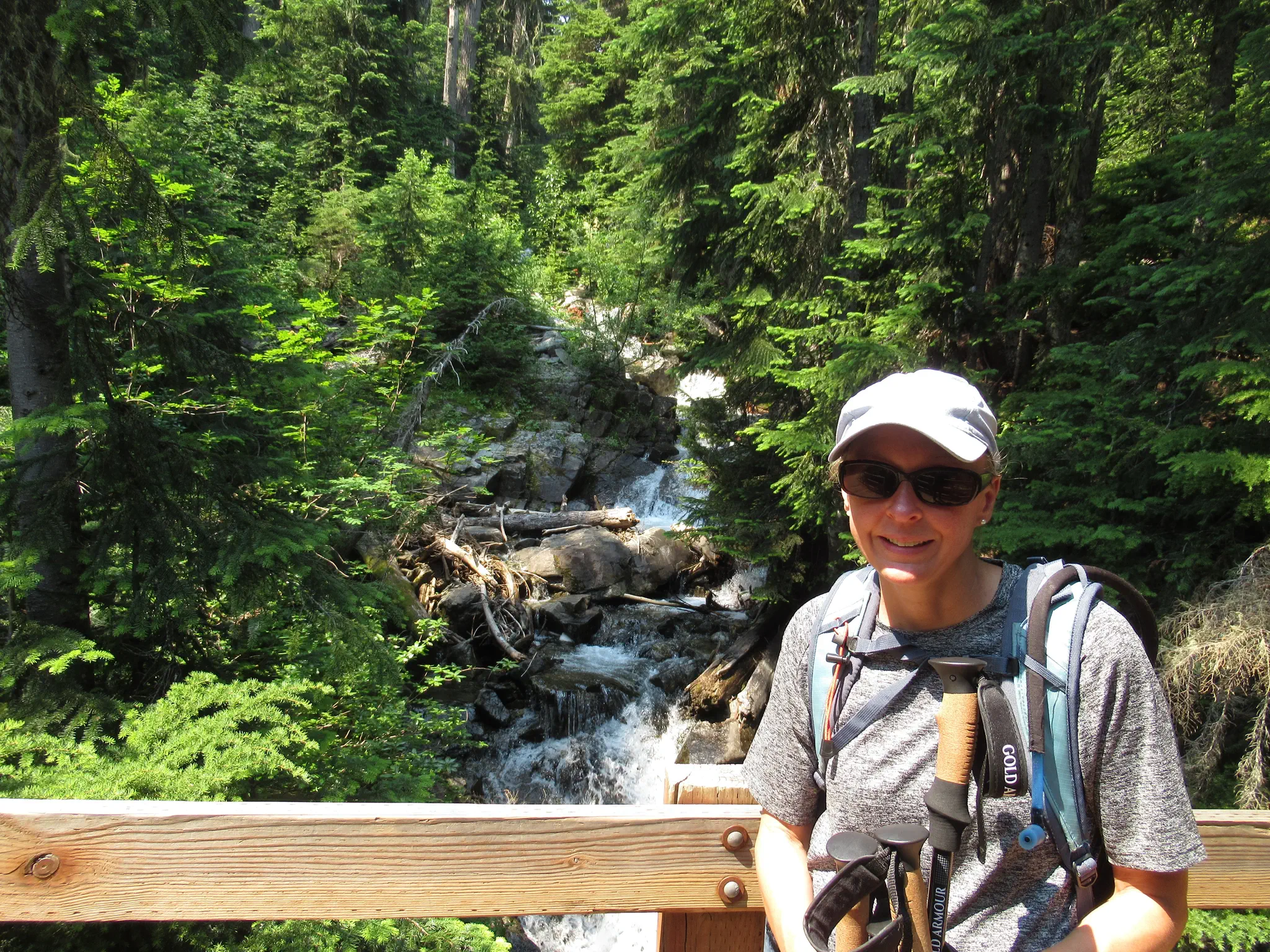 We grabbed everything for the hike, and the mosquitos were already out and about even in the parking lot. No restroom in this parking lot, so the restroom break back at the campsite had to last. I coated on bug spray and sunscreen, which since returning home, I saw an article that you are not supposed to put them both on at the same time. I believe that it recommended sunscreen and then 15 minutes later add bug spray. We both took our hiking poles.