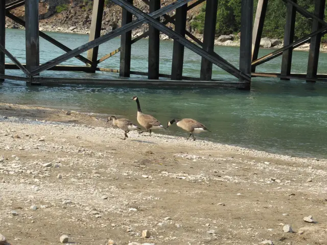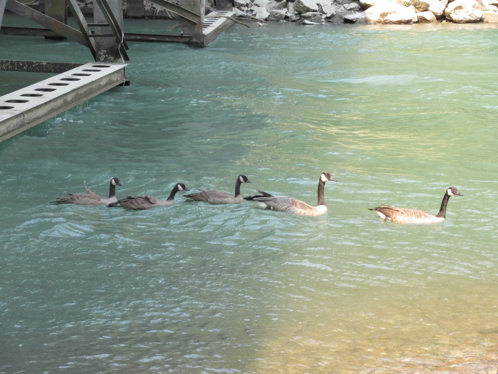 Lastly, we went to the Ranger talk in Colonial Creek South Campground that I mentioned the walk earlier. He covered a range of topics. At first, he had about 5 little girls in bicycle helmets and walkie talkies to parents sitting in the front. They were very participatory. Then all just got up to leave in the middle. I guess they were called back to camp. He reacted as there goes his important audience :). He took questions at the end. During our Maple Loop hike, we overheard someone mention already seeing smoke from the fire. I guess it was hazy, but we really did not have any point of comparison. So, I mentioned this and asked if there was a fire and where. The fire was northeast of Stehekin (in the south portion of North Cascades); he said that area communities were at a level 1, not required to evacuate now. After the talk, we walked along the beach back to our campsite. Found some Canada geese with a juvenile and then all in a row.