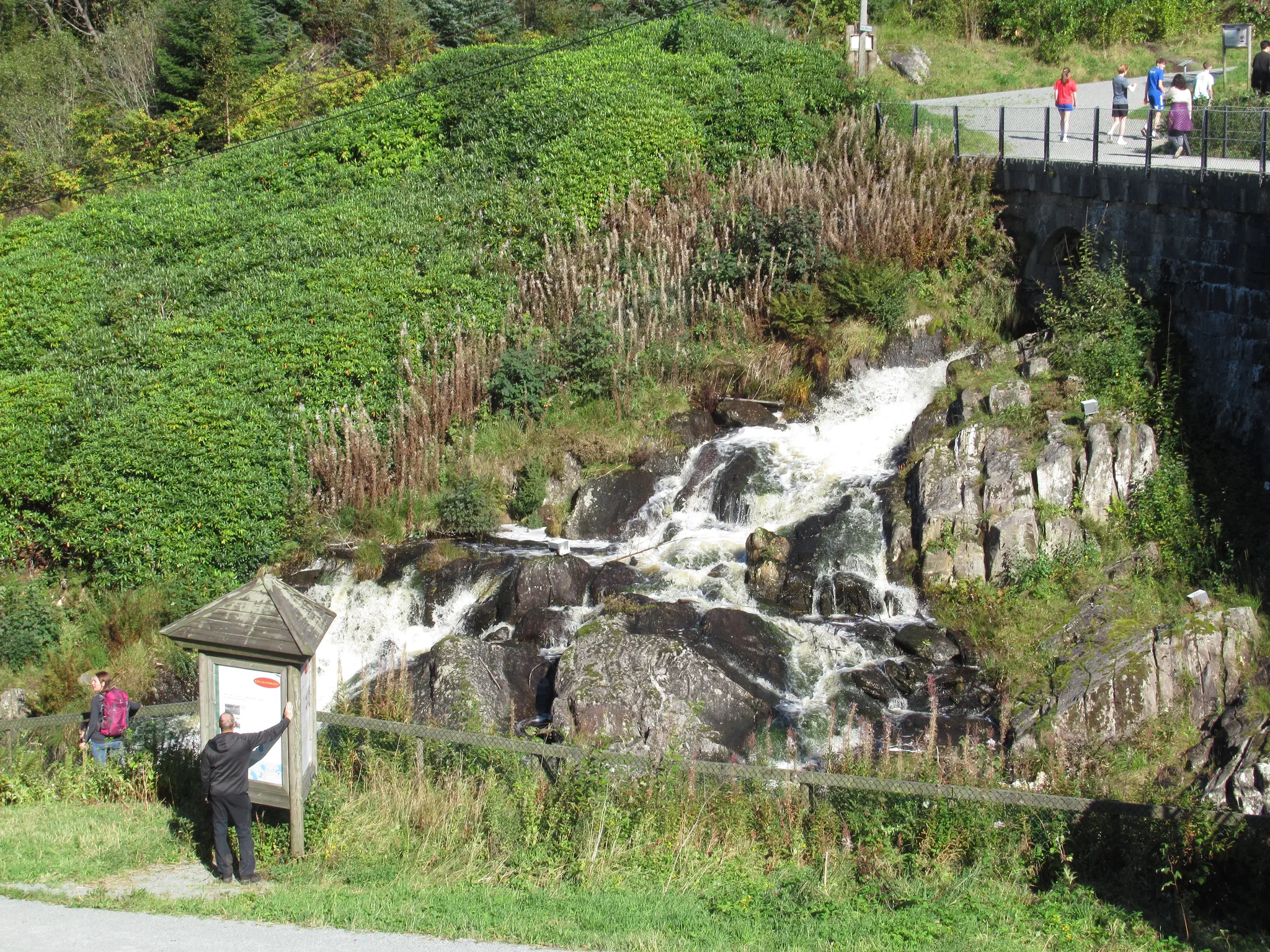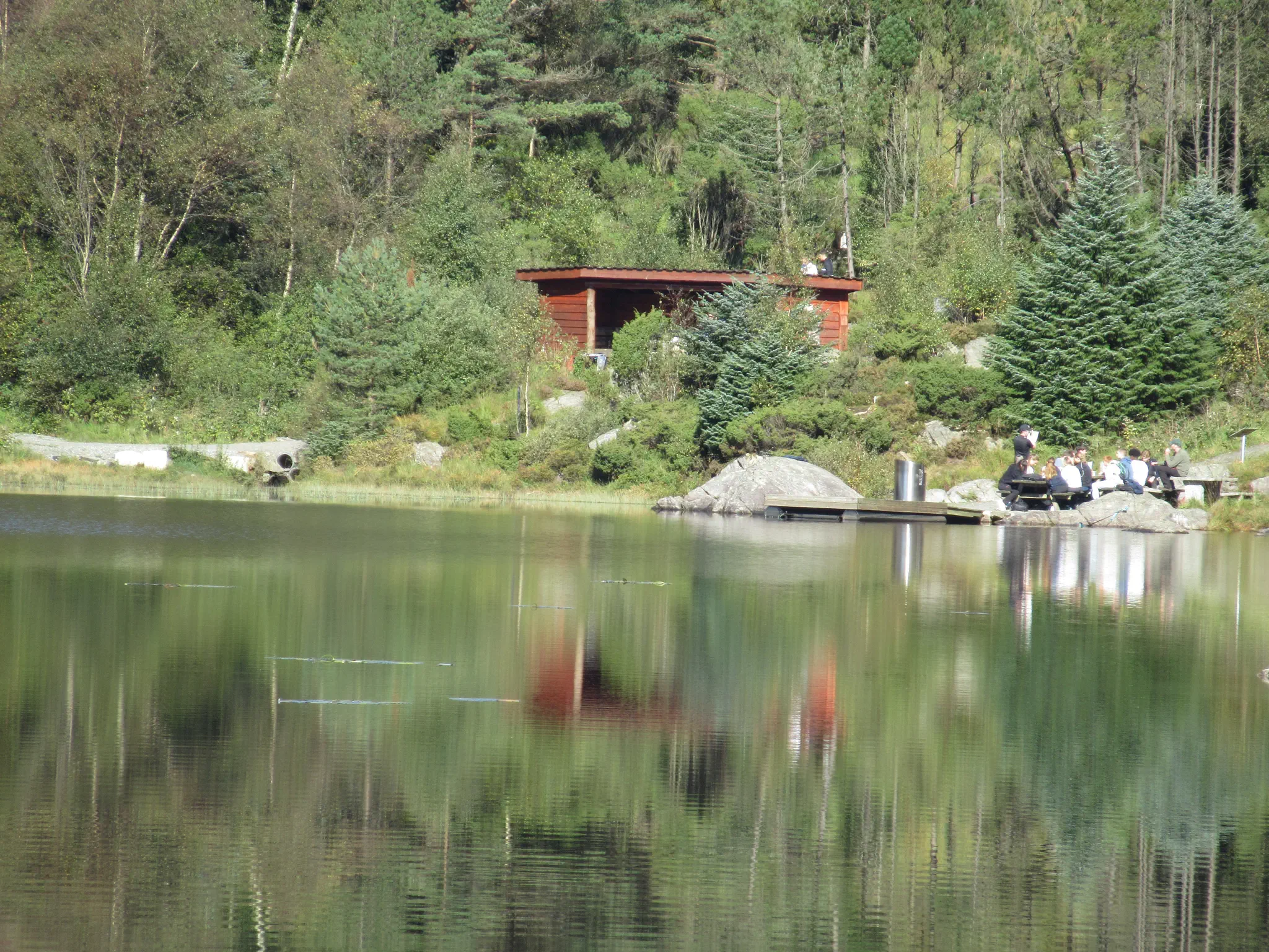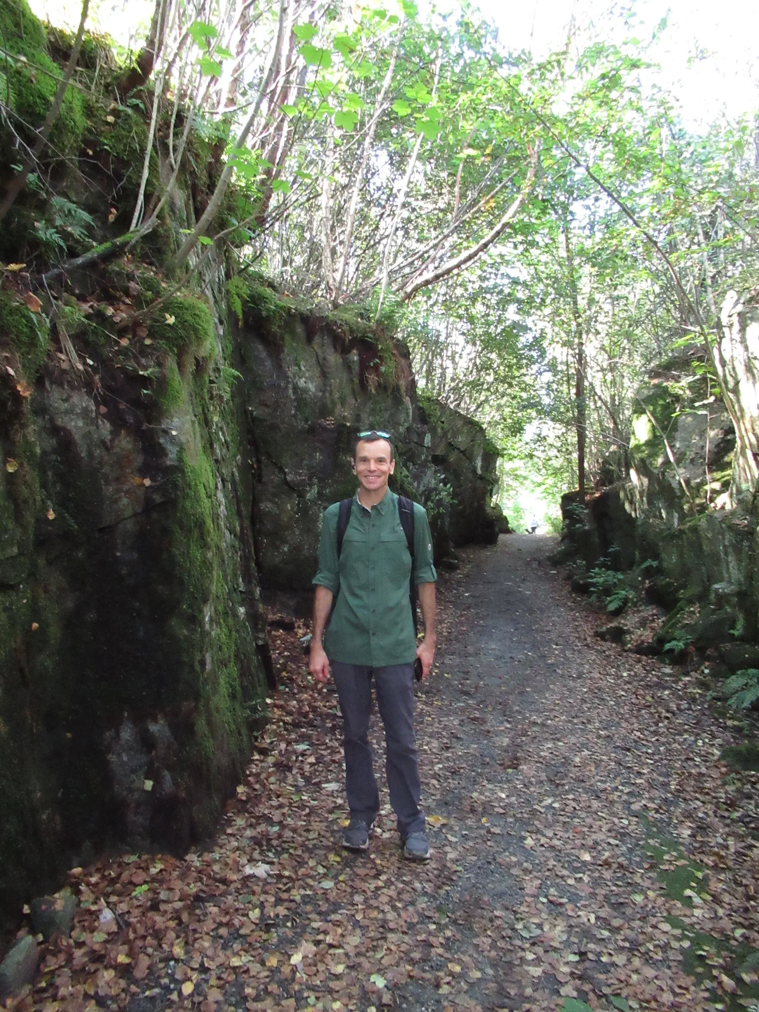 Starting the hike to and around the Djupadalen area. It was challenging to find the trail, getting through town. After finding the trail, there were some muddy, difficult parts of it. There were small kids hiking it too. When we first saw them, they were in a tree in bright, hazard vests. I thought people were trimming the tree at first, then thought kids working in trees, and then just kids playing in a tree. The hazard vests was just for their teachers or adult supervisors to be able to keep up with them. The kids were good at hiking up hill. The old fort (see the dark doorway; I was able to go in) and then a view from the top. Then lots of cut down trees/tree stumps for some reason.