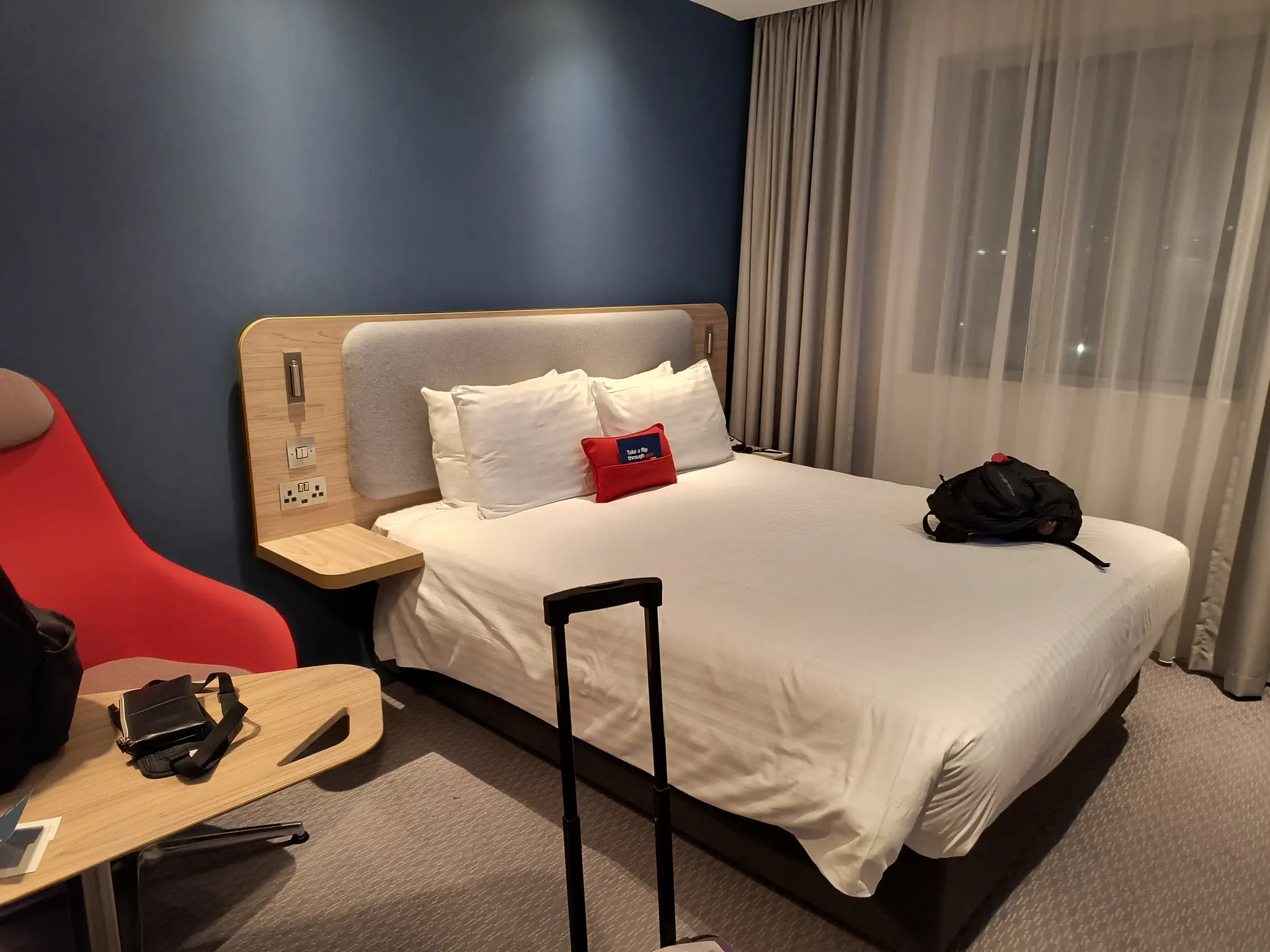 There were some wrecks, so lots of traffic -- slow -- getting to LHR. We booked to Terminal 4 because our hotel was near it. We were at the Holiday Inn Express. From Terminal 4, there were signs directly us to the hotel and others near. You walked through tunnels there, so it was very convenient. Here is the room. The hotel included breakfast, normal for Holiday Express.