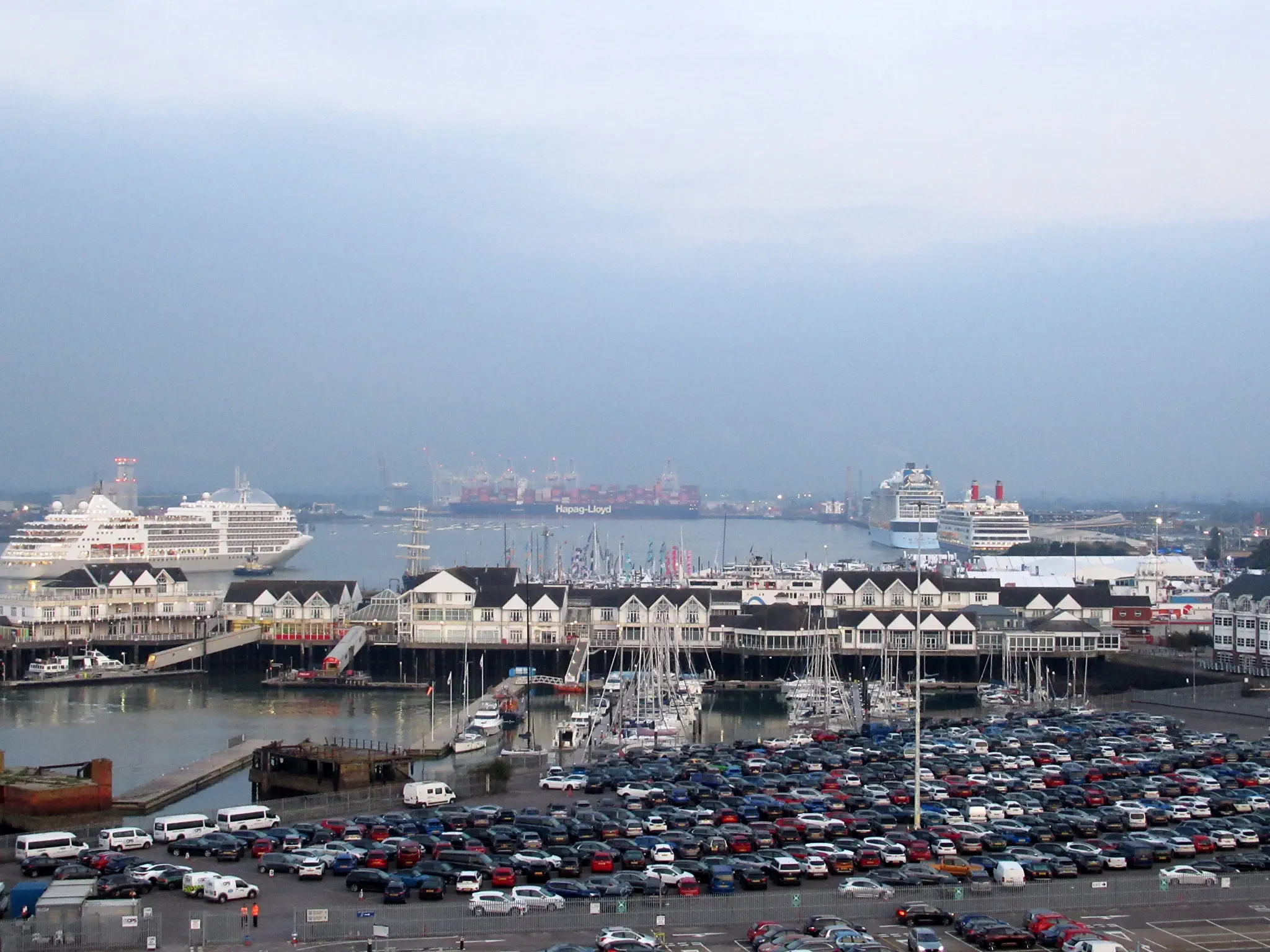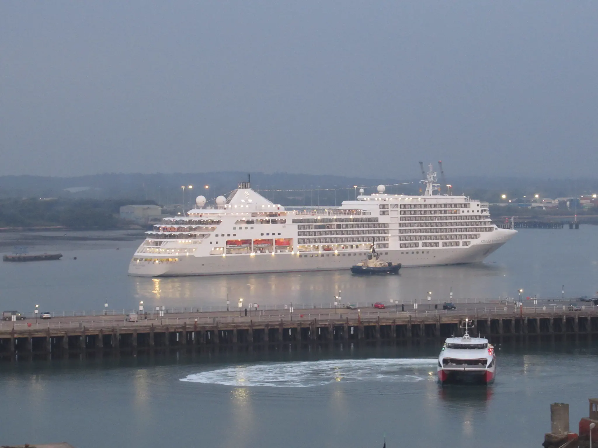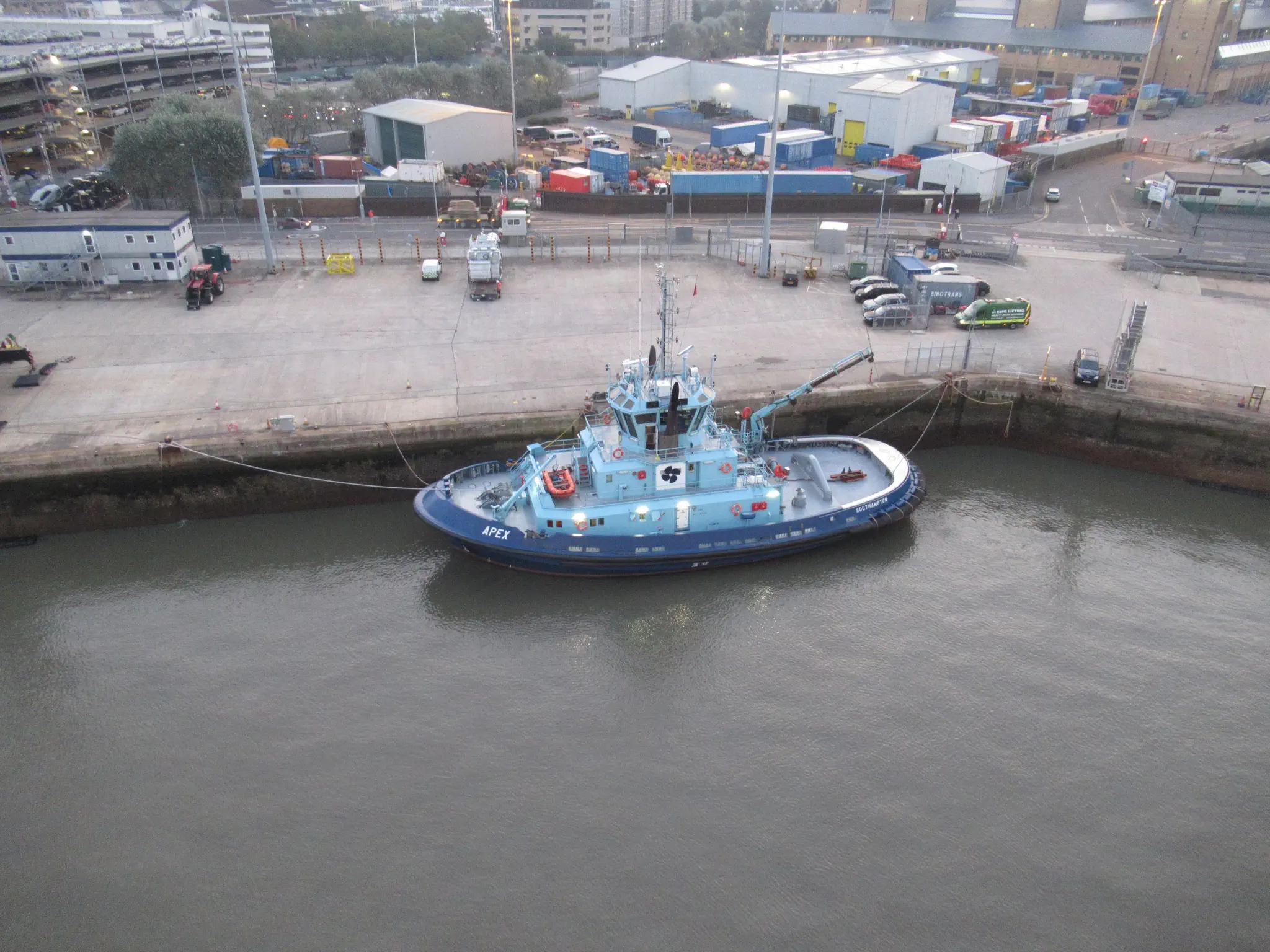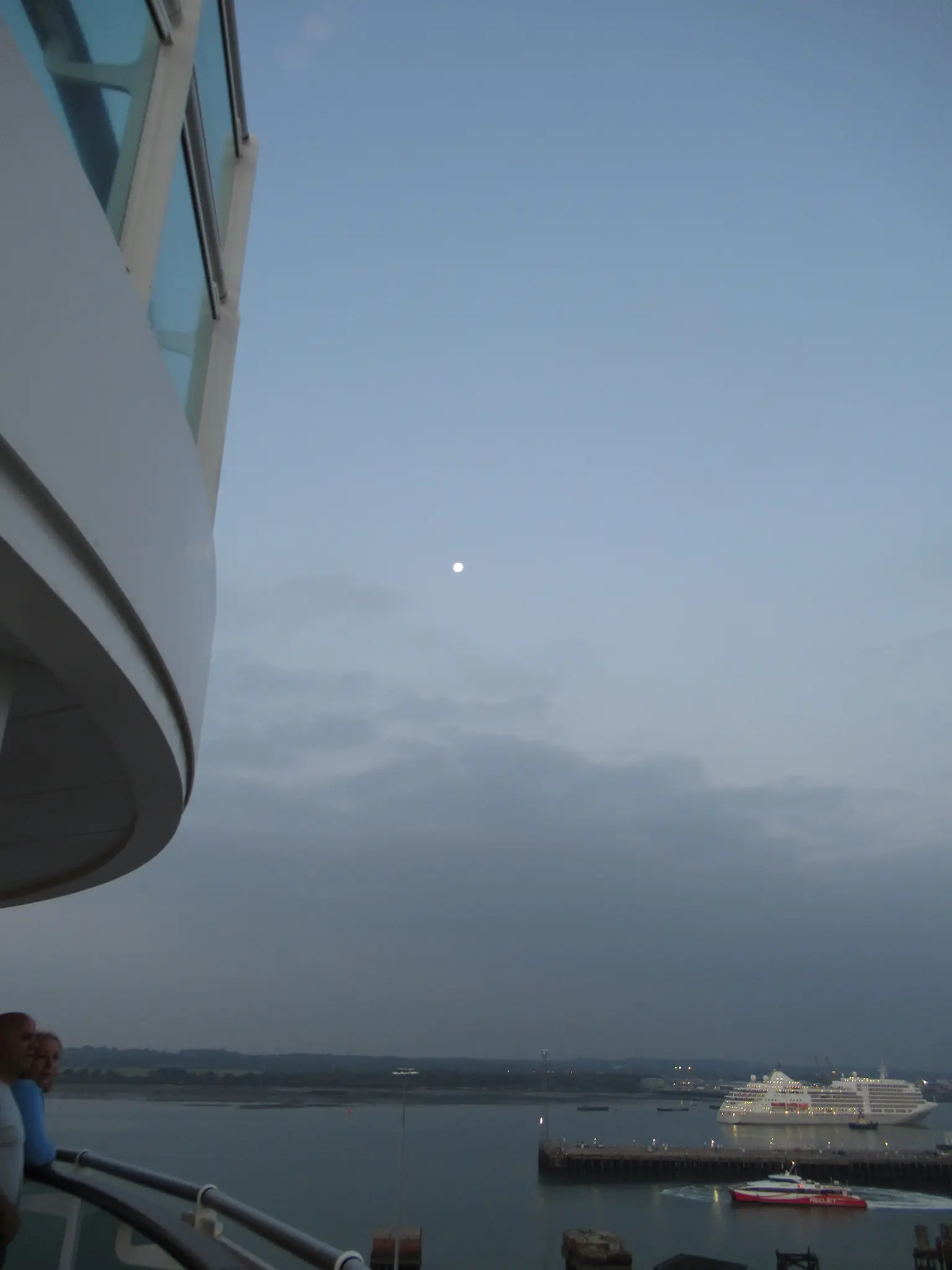 Back in the Southampton. Not exciting looking now, but this is the berth that the Titanic left from. A brightly painted tug and full moon and ship spotting.