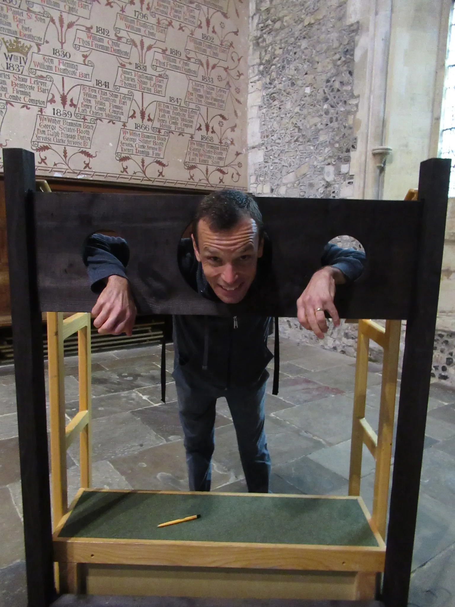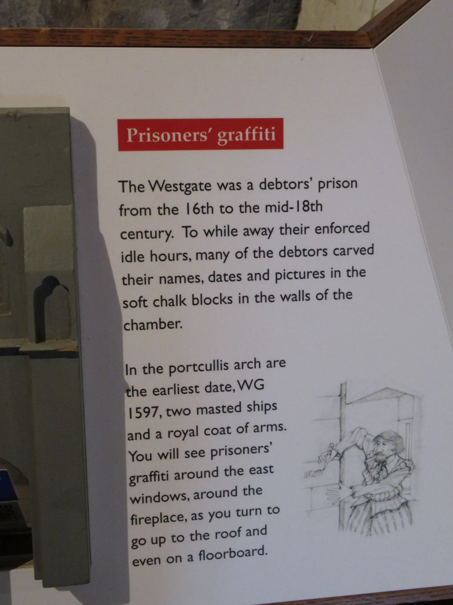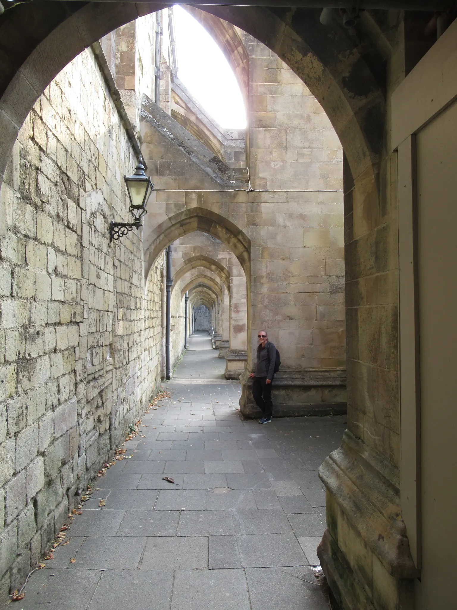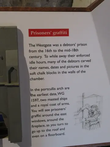 The final museum was the Westgate Museum. This one was fairly small but had good views from the roof. I thought that the last museum was the 878 AD museum based on research on their website before. I thought this one looked cool. We found it, but it was in a mall and not open the day that we were there. Travis remembered the gentleman who sold the tickets mentioning Westgate, so we looked for this instead. Here is the gate. Cars (or buggies) used to drive through, but now the road is routed around to the left and only pedestrians can walk through. Views from the roof of the High Street with Buttercross and the clock and a view of Townhall. Arrow slits and prisoner graffiti.