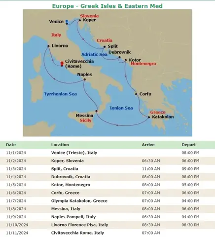We booked this cruise very early (Nov 9, 2023) based on a very exciting cruise itinerary and a 20% off future credit that NCL gave us due to missed ports on a July 2023 Iceland/Greenland cruise. All of these ports were new to us. We planned two days before seeing Florence and Rome before (I had been to these before, new to Travis). With people on our Cruise Critic role call, we booked the Castle and Cave tour in Koper, Slovenia and Pompeii, Sorrento, and the Amalfi Coast tour in Naples. Later, the FB group was much more active.