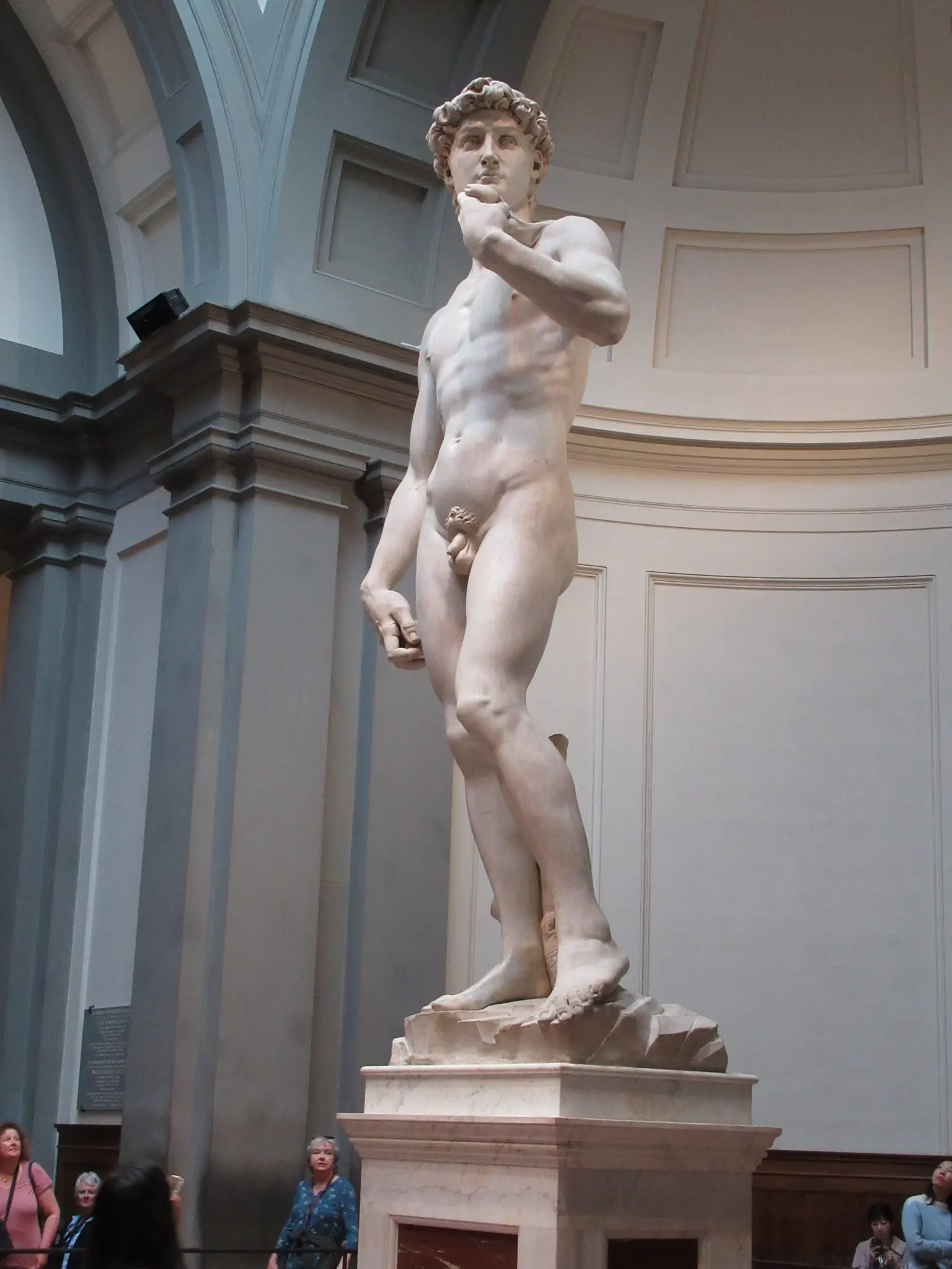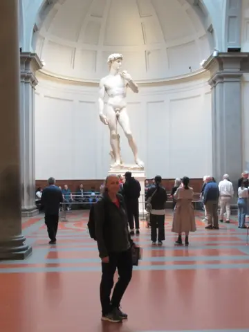 We walked first to a fort. It was under construction, so was much in Rome. They are preparing the 2025 Papal Jubilee events. Then we headed toward David. The lines had time-entry slots labeled, so we knew where to stand. We got in quickly with ticket scans and backpacks through security (we bought both backpacks to not need to store one at the hotel with the luggage). There is a lot more to see here than just David, and they have a restroom. David -- note his larger than to scale hands and feet because he was first to be displayed behind an altar further from the viewers.