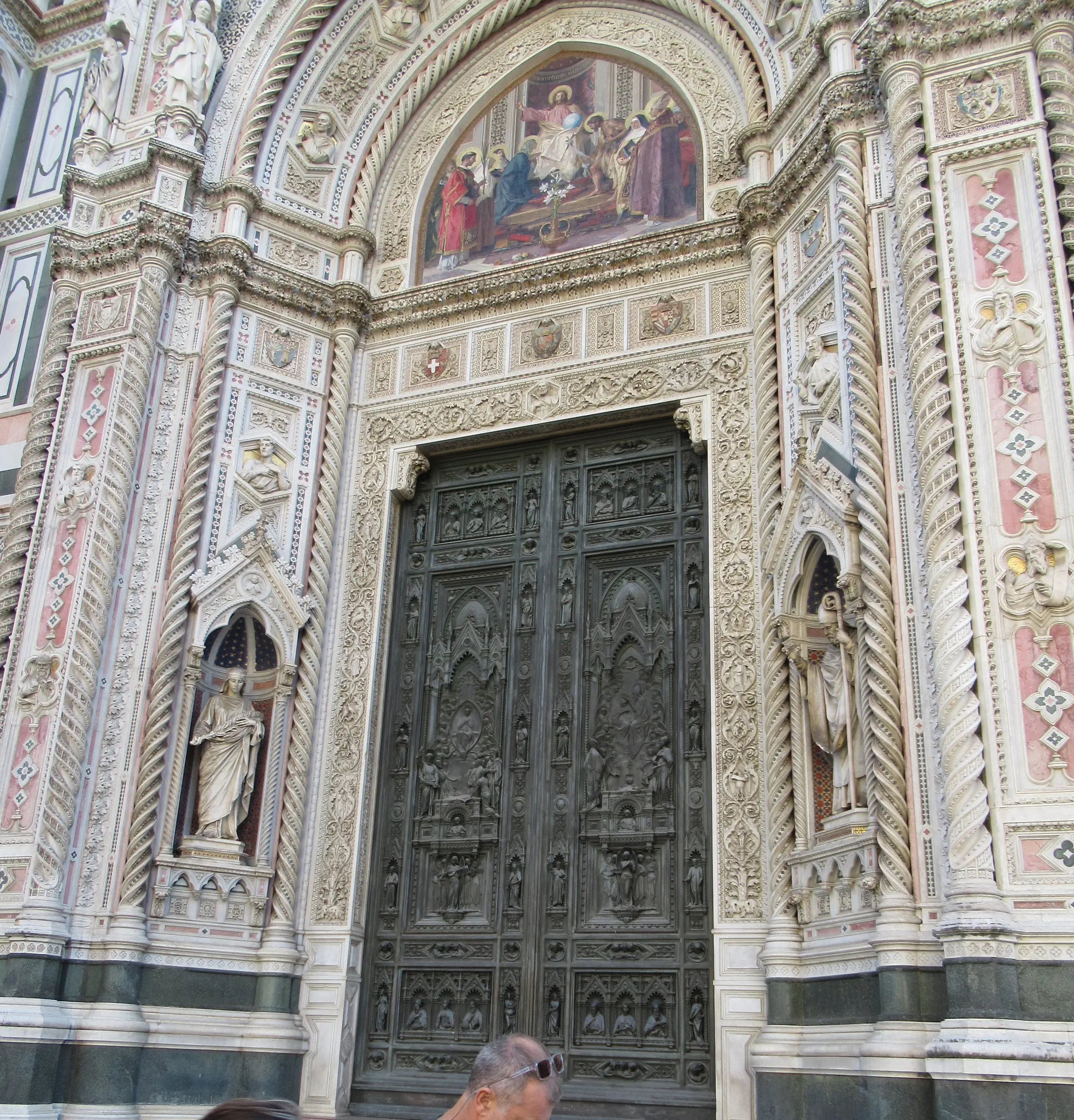 Then we went to see the iconic Duomo with cathedral, bell tower, and baptistry. We were accosted by a self-stick salesman. I avoid and try to get away from everyone like this, but it does upset me during and after. So much to see on the cathedral; we used our monocular (that we got before our Norwegian Fjords as nice and small for travel) to check out the detail closer up, while still keeping a close eye on our backpacks. I had a money belt with passports, credit cards, and cash that we withdraw for our tour in Slovenia for our first port of the cruise and to start collecting the correct change for the Pompeii tickets.