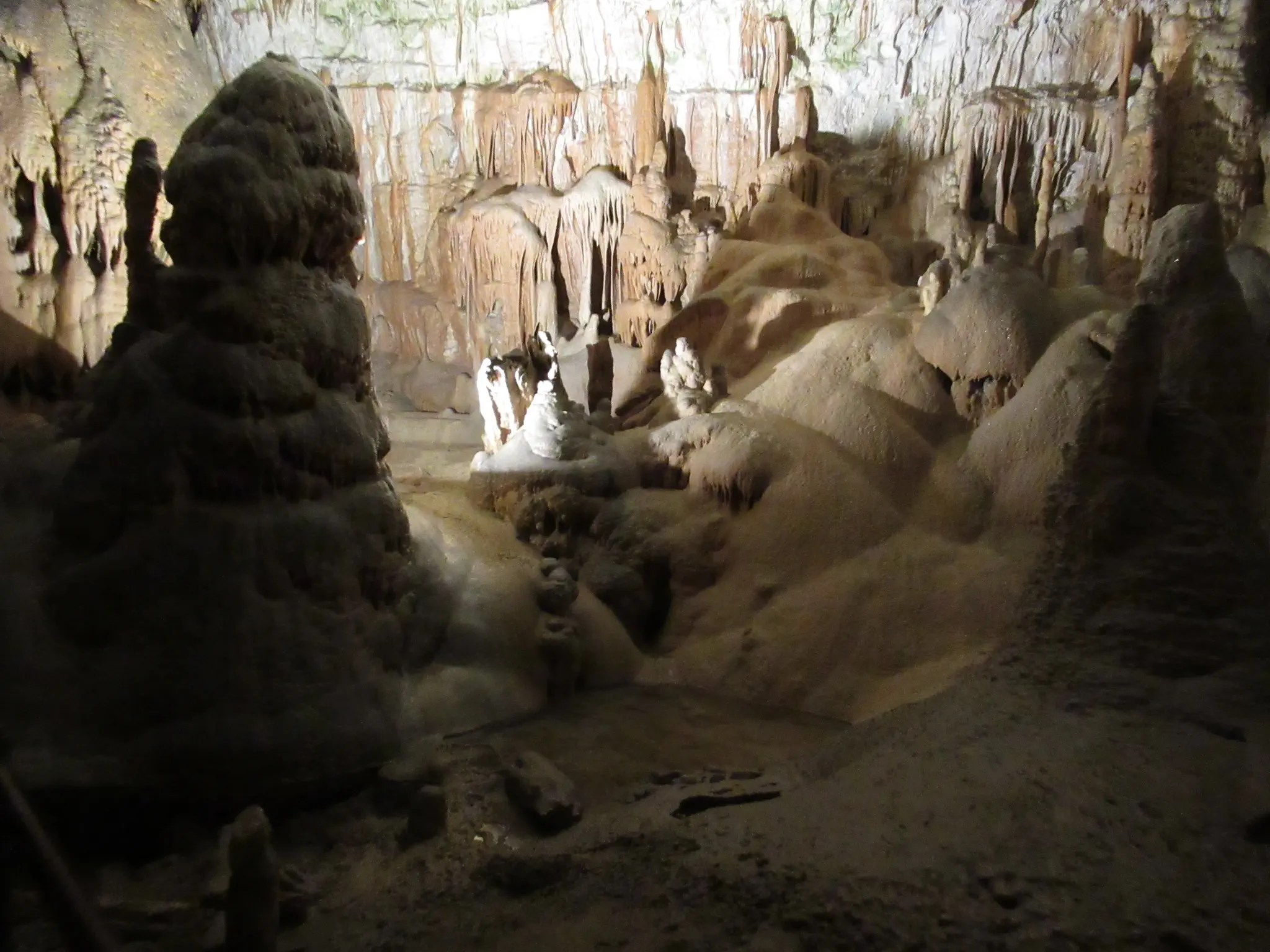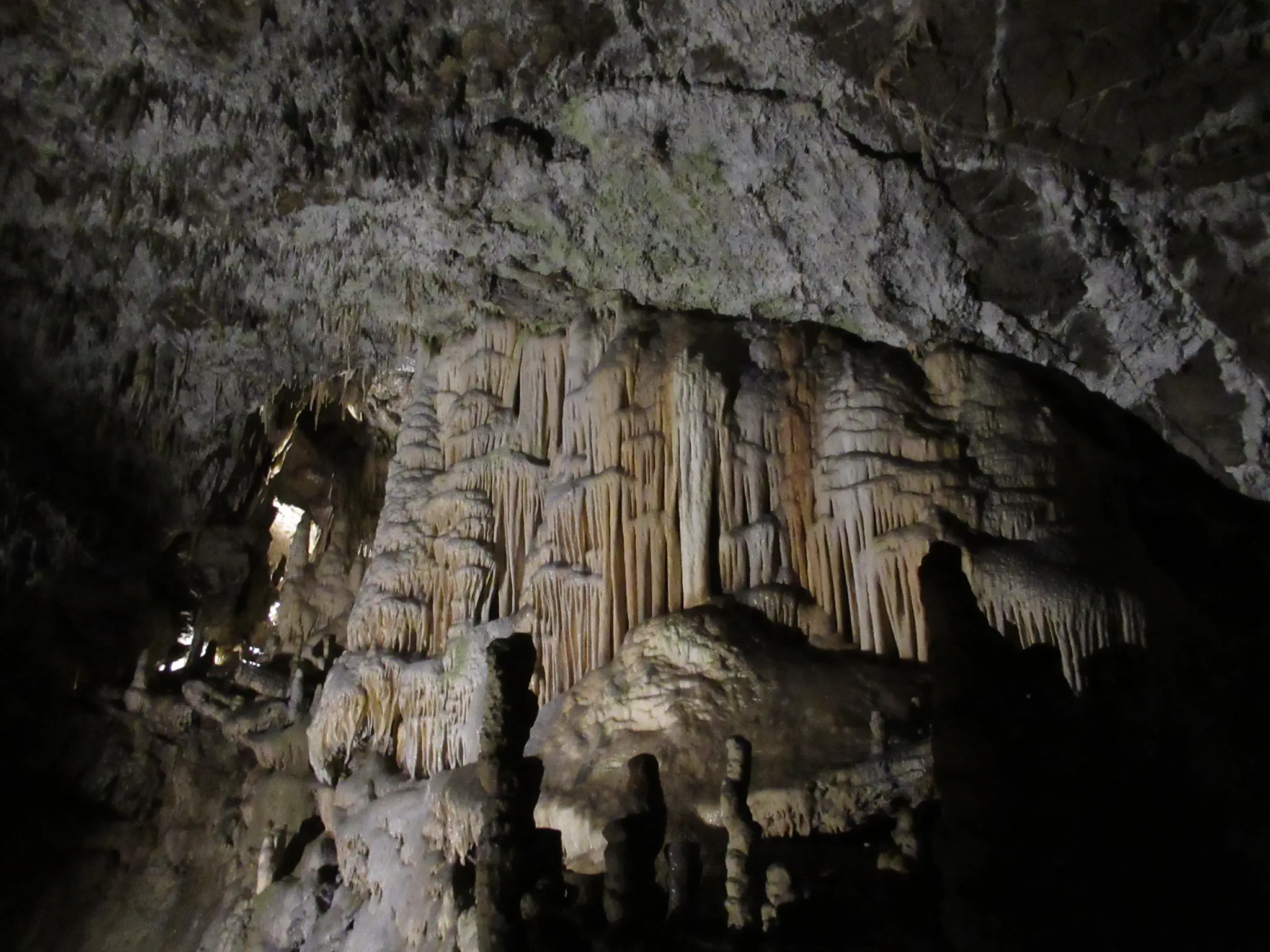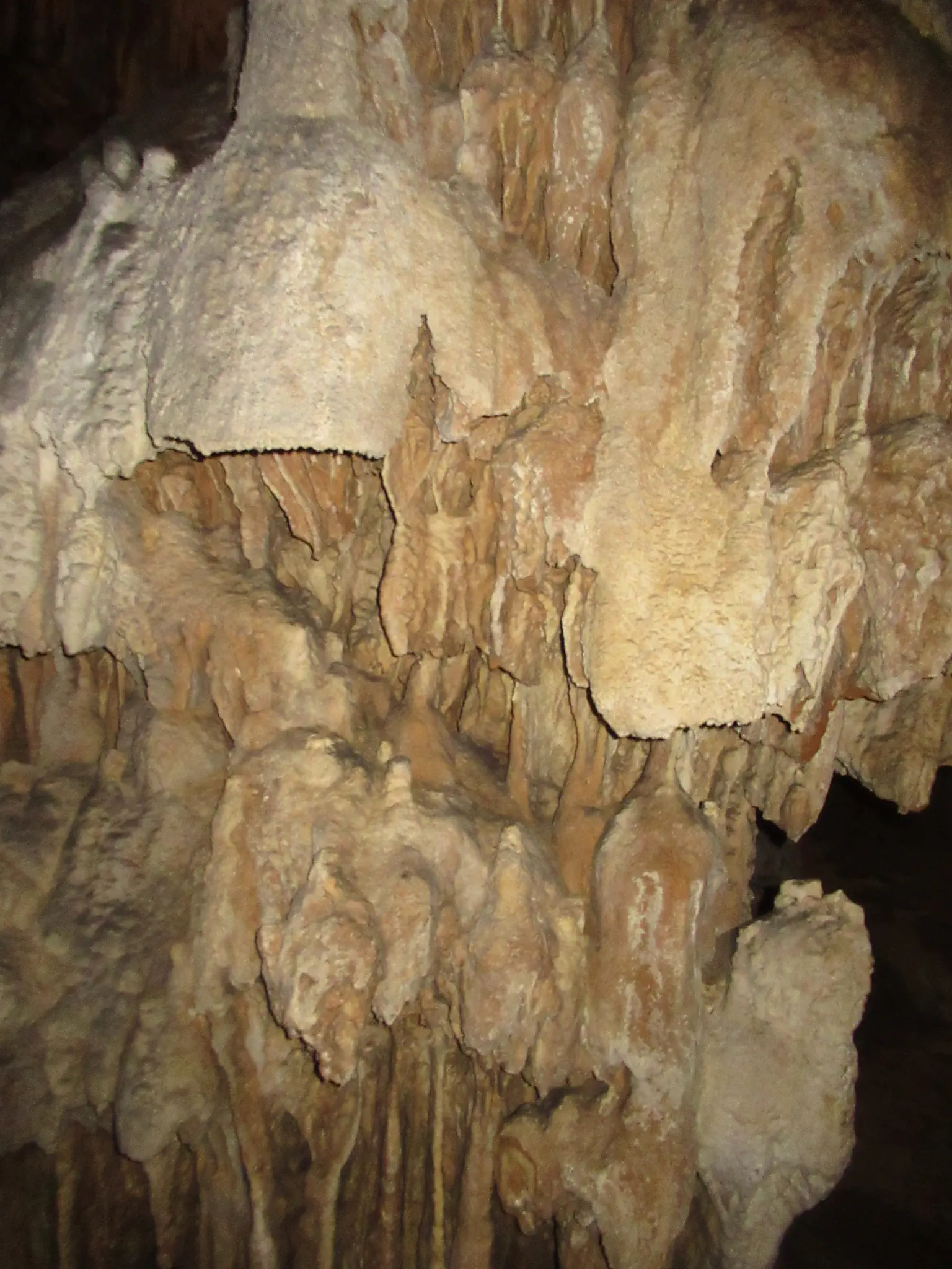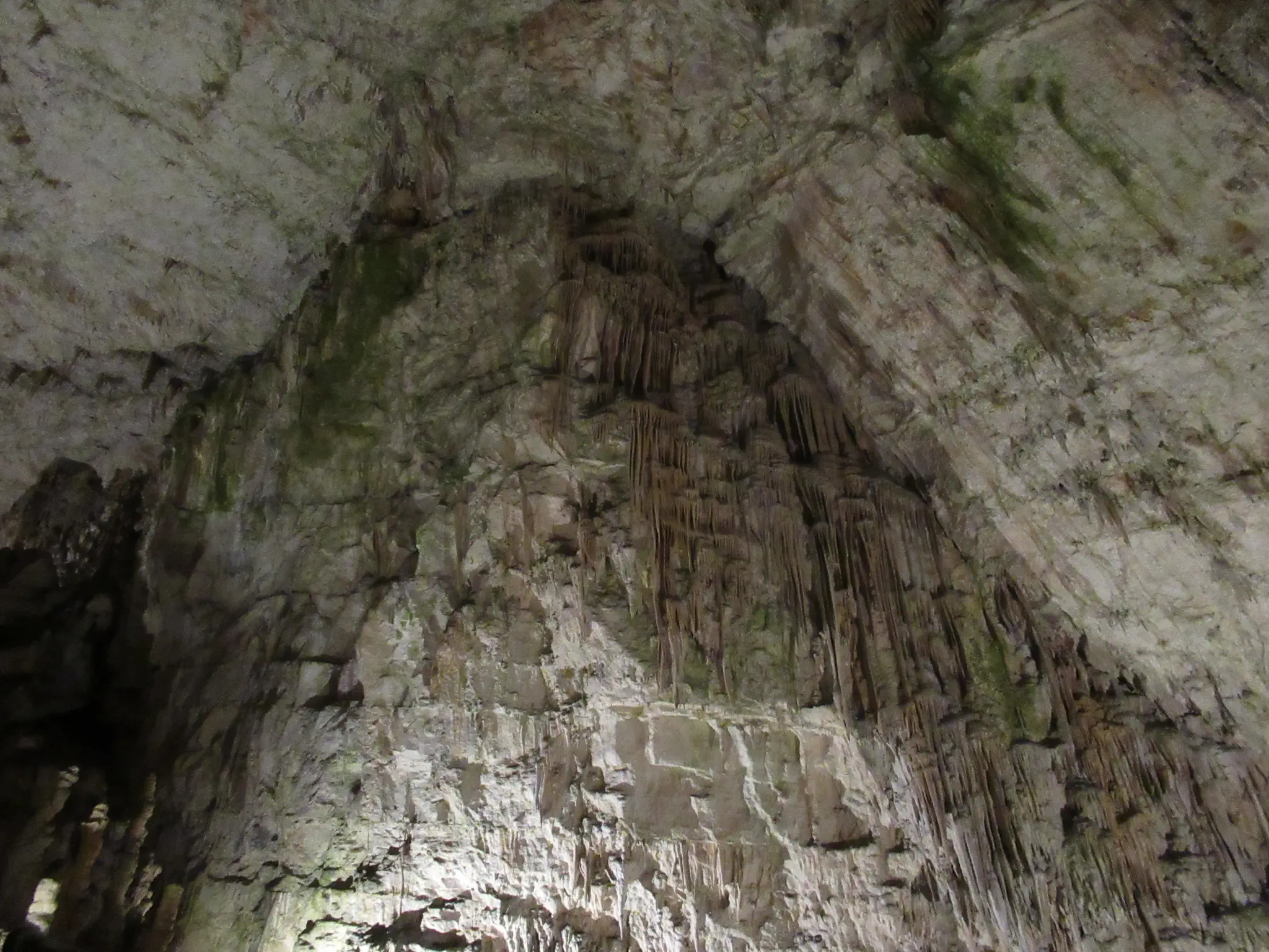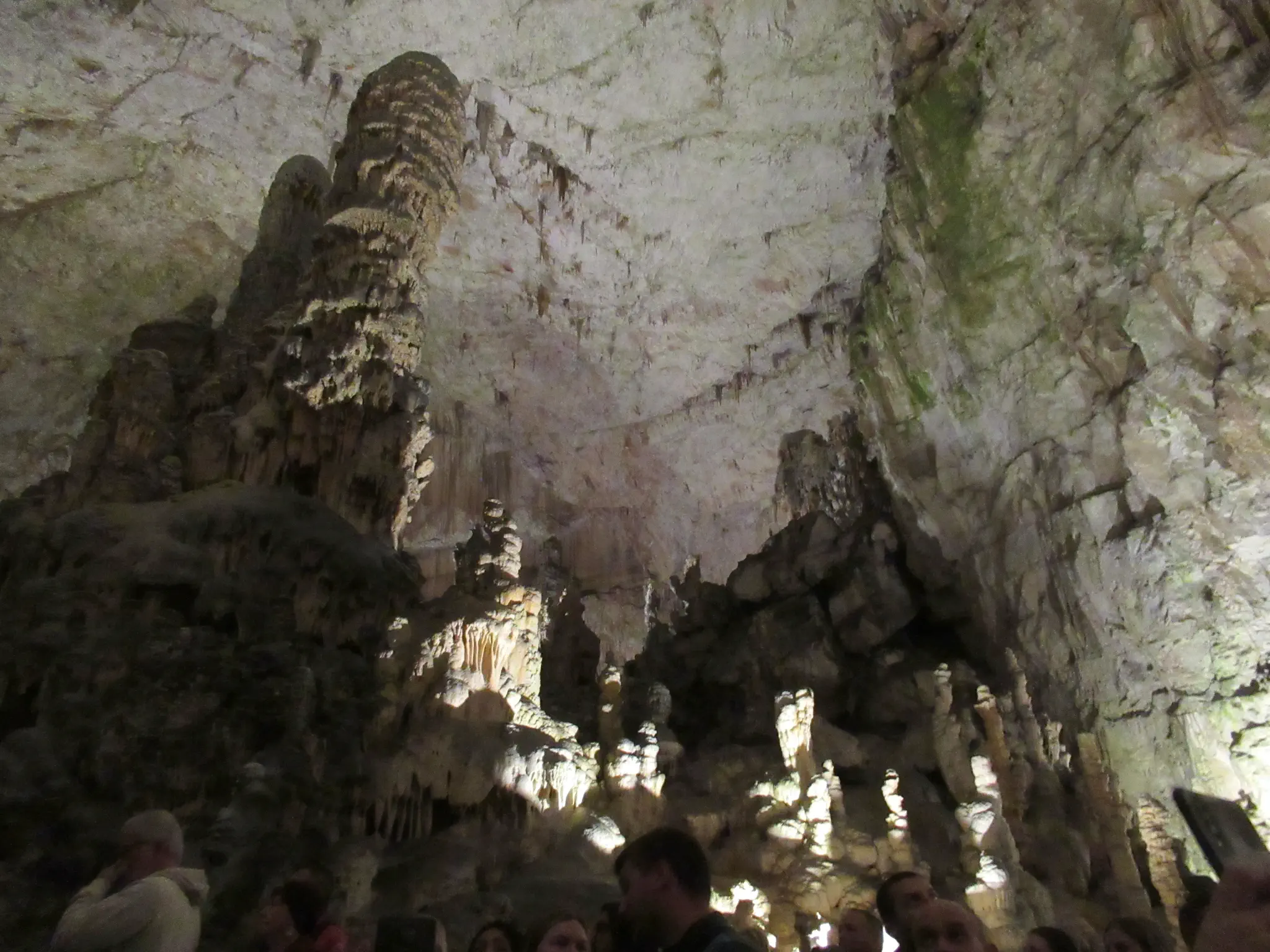 Postojnska Jama (cave). The cave had a train that took us to the tour starting point. I did not get a good picture of the train; you see the yellow metal of the train behind Travis here. The other pictures were burry with movement and darkness. We did pass other trains and went around curves on the train, which was cool. After the train, our cave tour guide met us and walked us through with different stopping points to give information. The cave was large and pretty, and the guide was knowledgeable and entertaining.