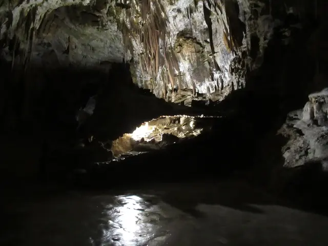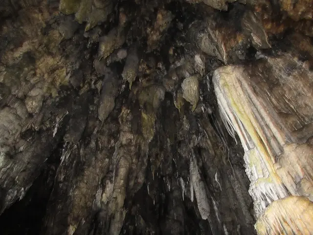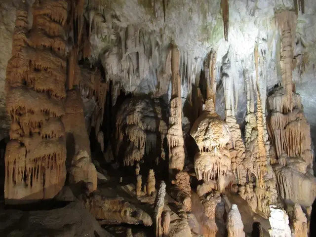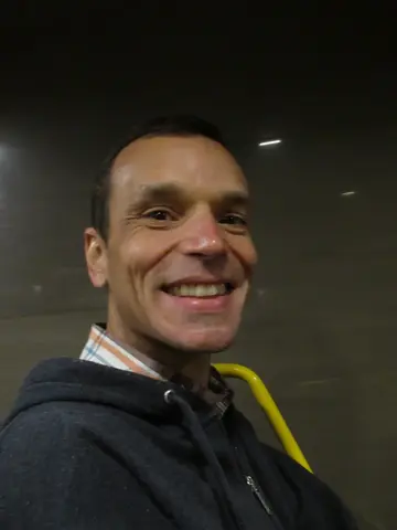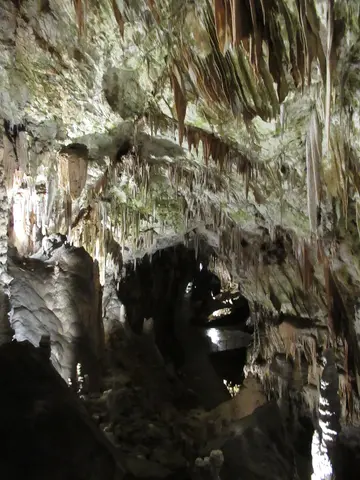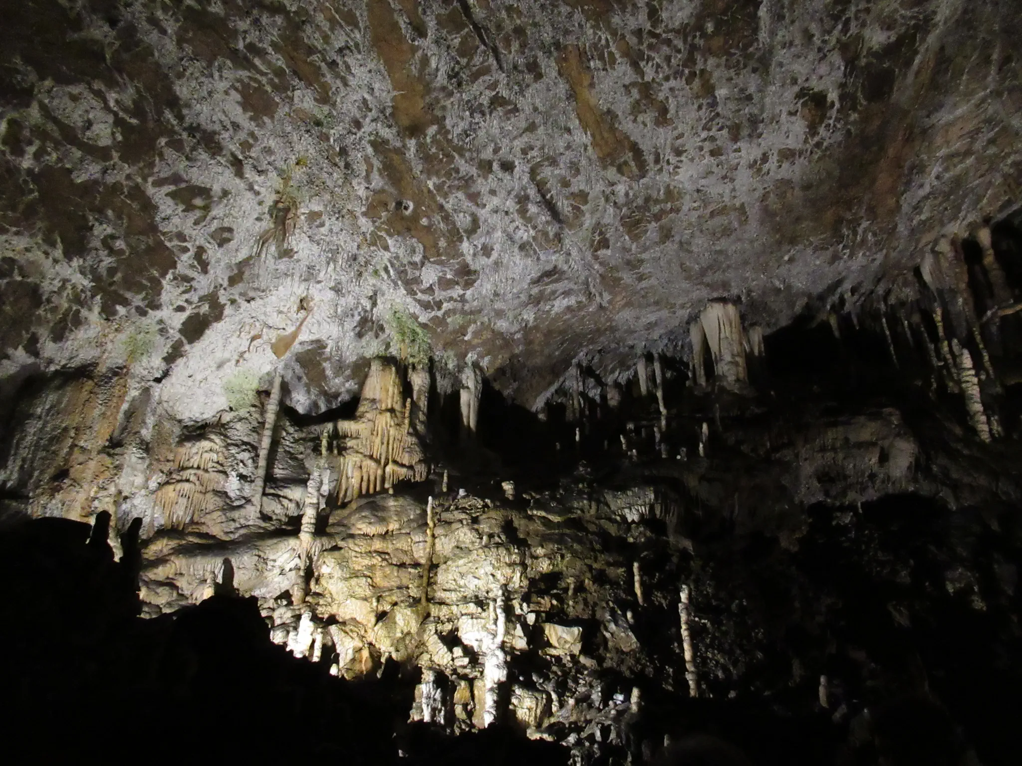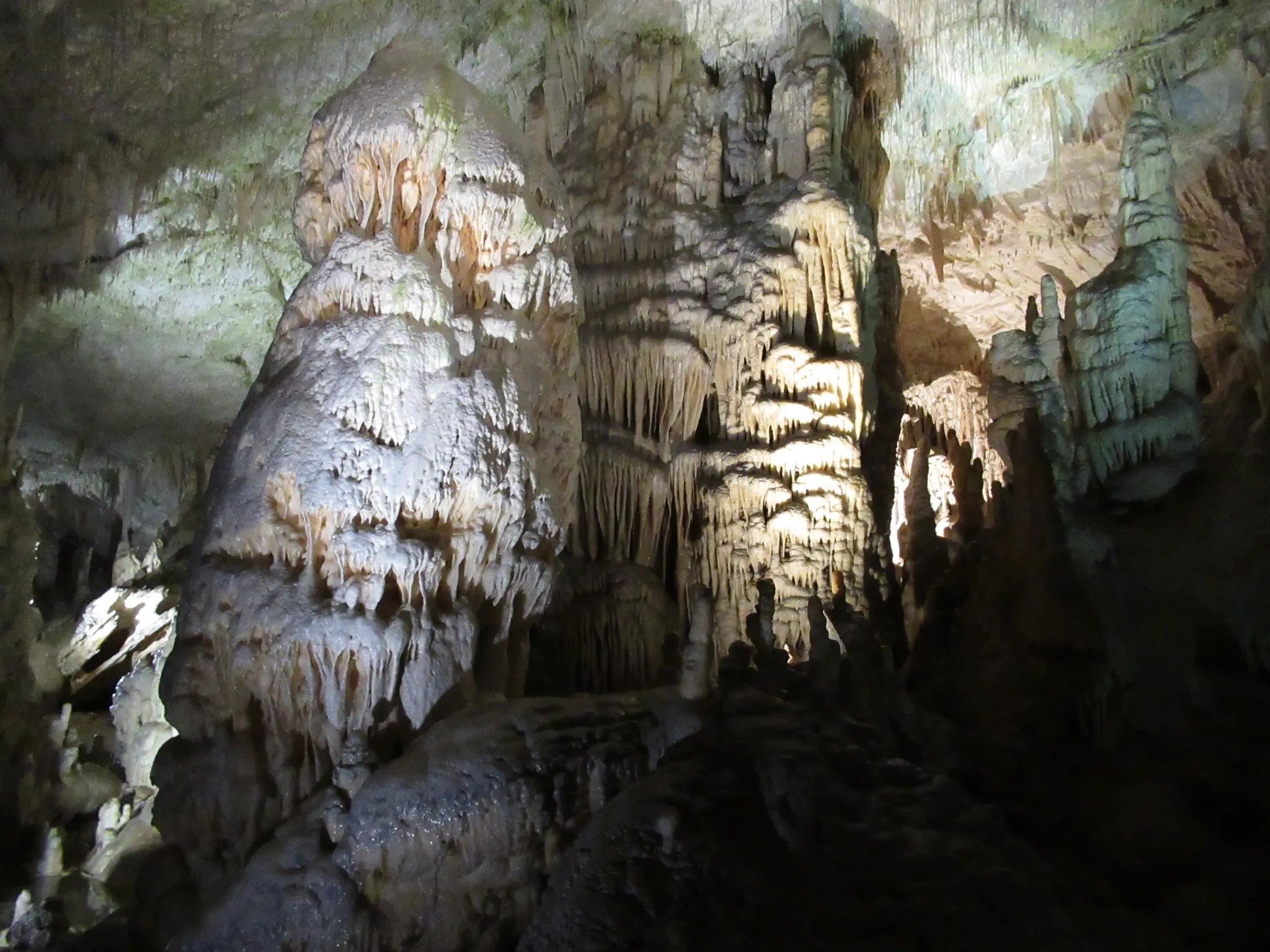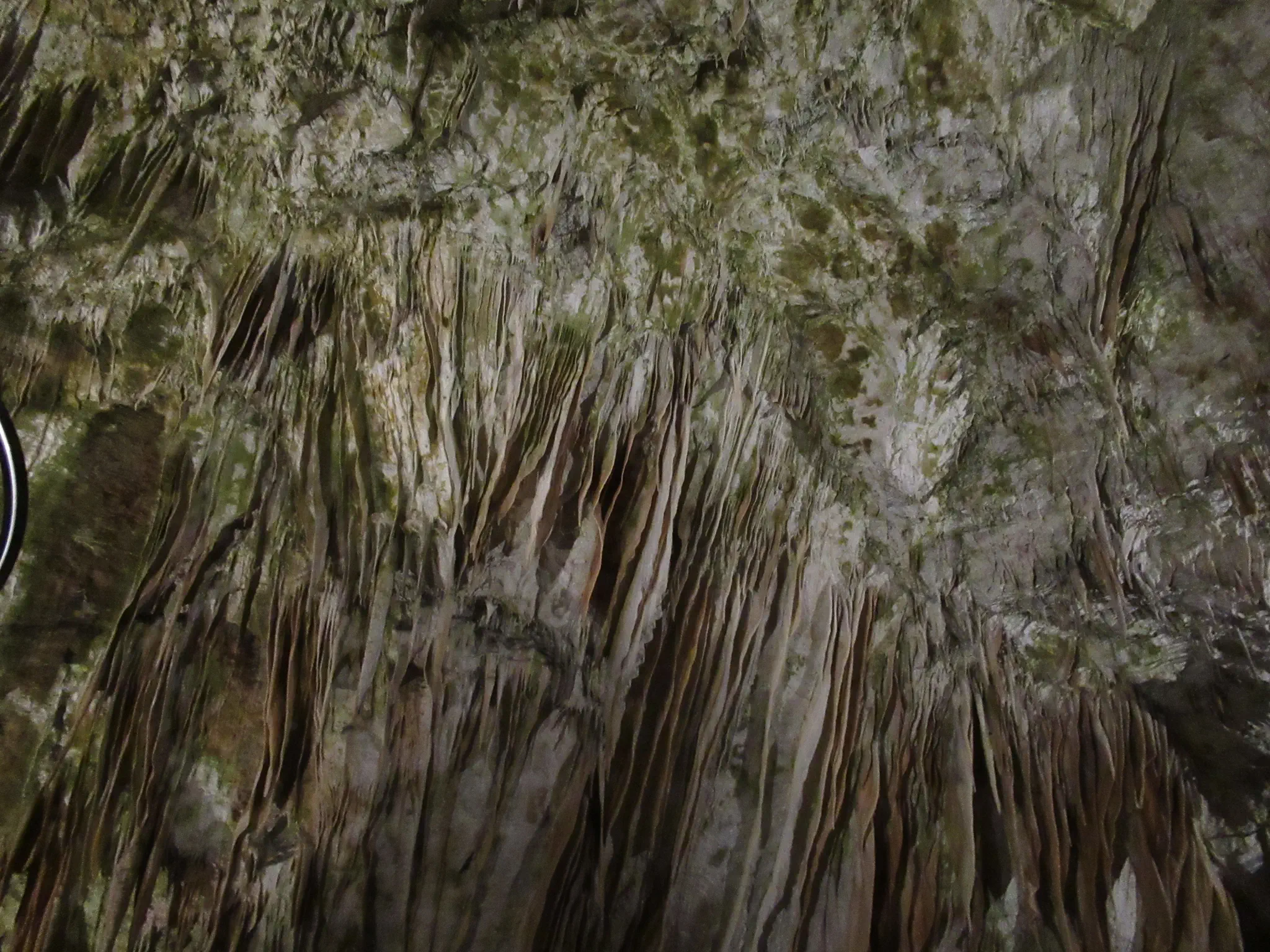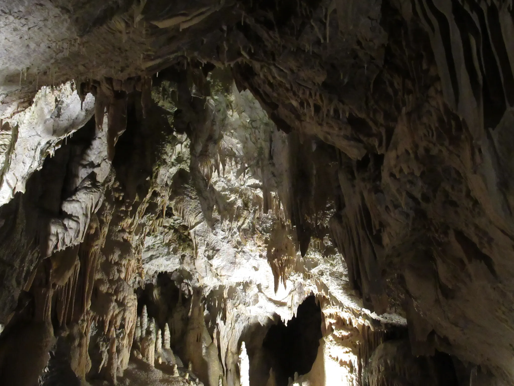 Postojnska Jama (cave). The cave had a train that took us to the tour starting point. I did not get a good picture of the train; you see the yellow metal of the train behind Travis here. The other pictures were burry with movement and darkness. We did pass other trains and went around curves on the train, which was cool. After the train, our cave tour guide met us and walked us through with different stopping points to give information. The cave was large and pretty, and the guide was knowledgeable and entertaining.