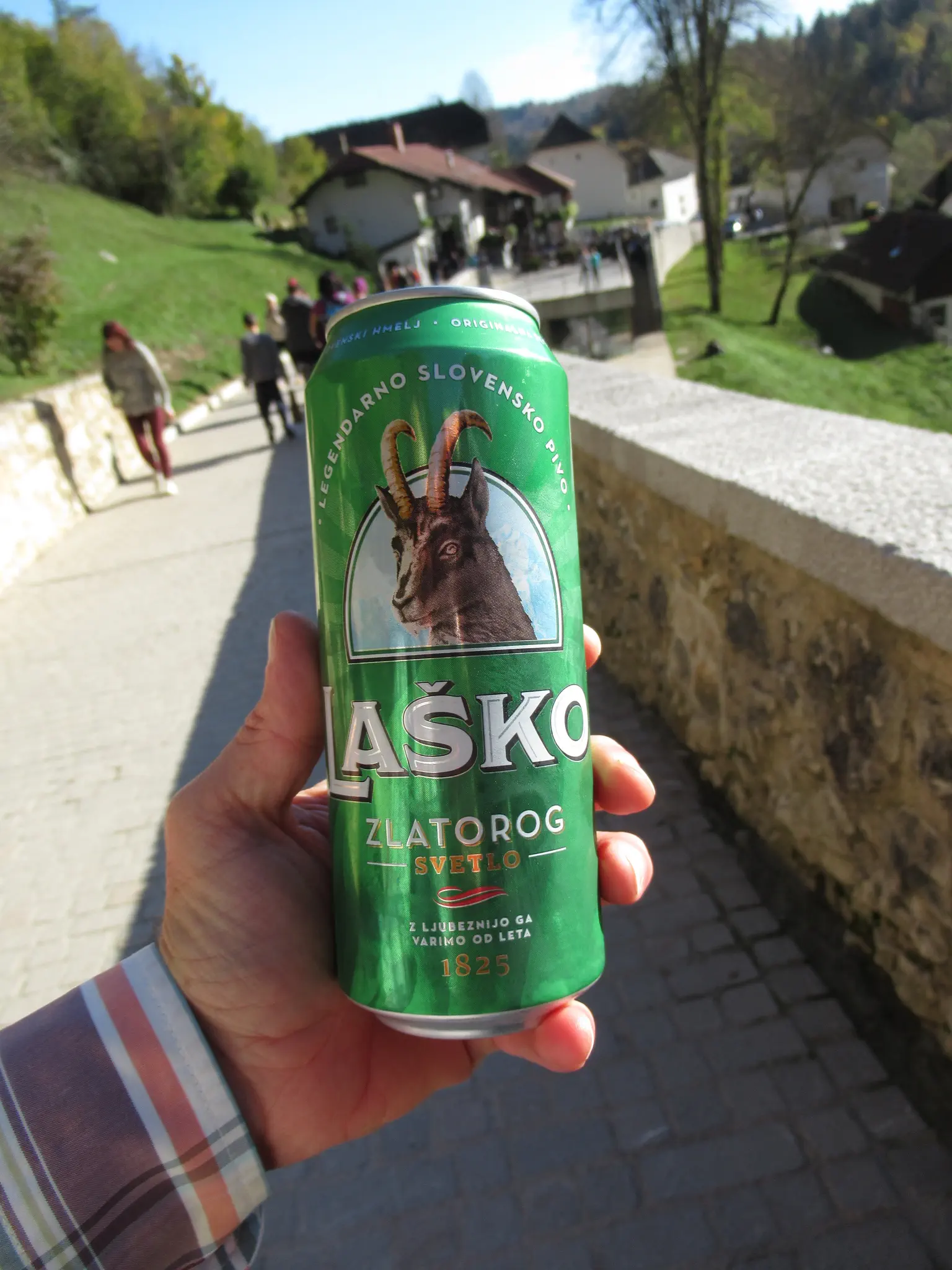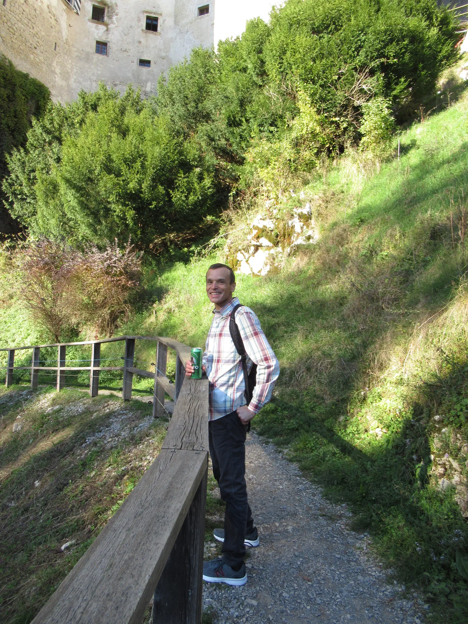 Travis found a local beer to try. Outside, we walked down by the goats and got some views of the castle from below.