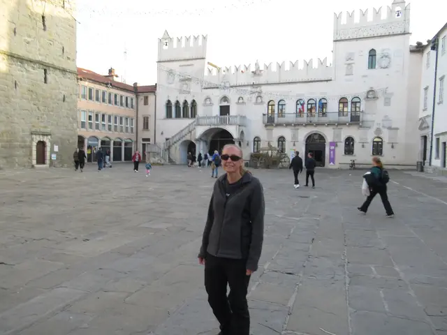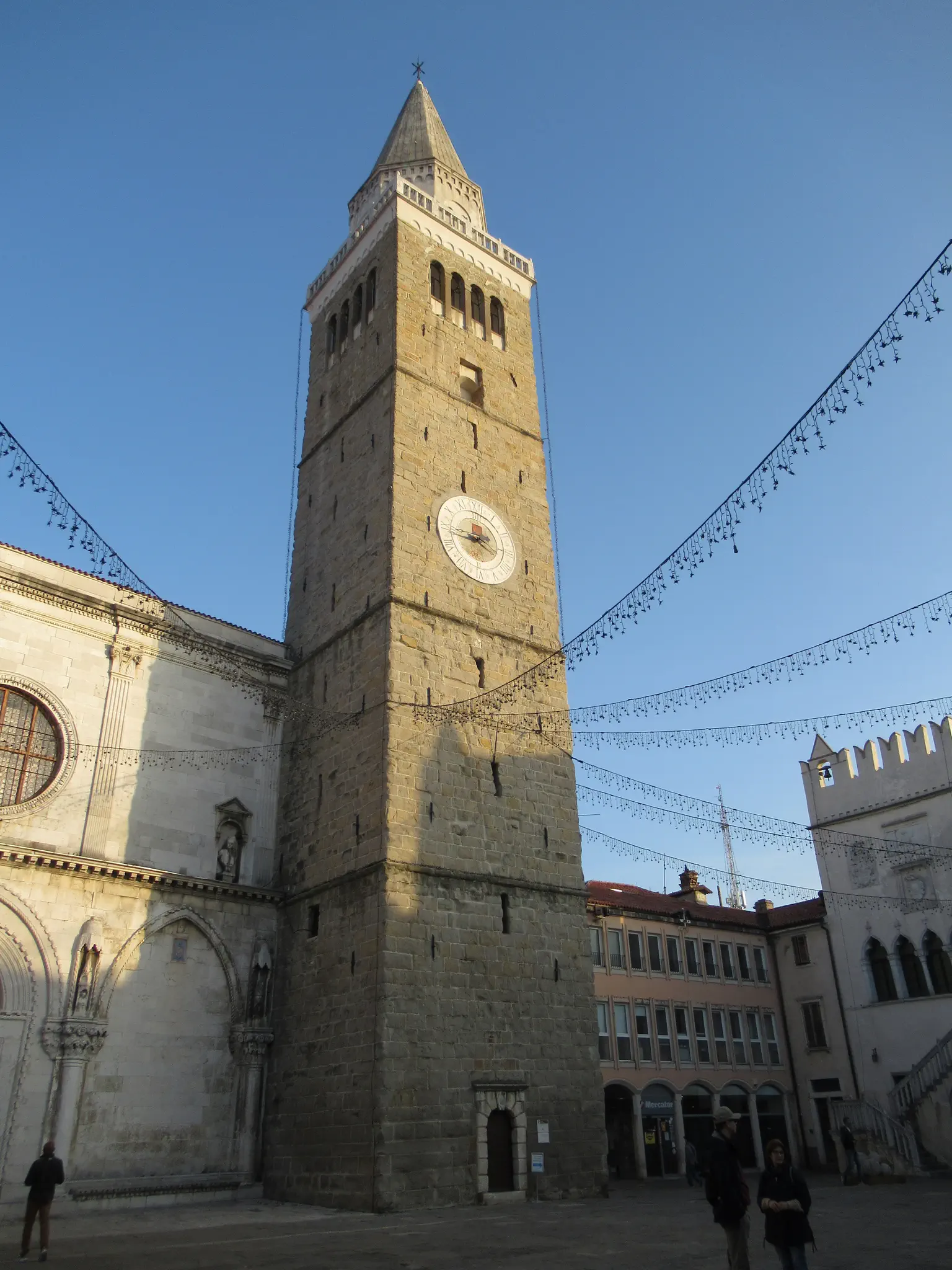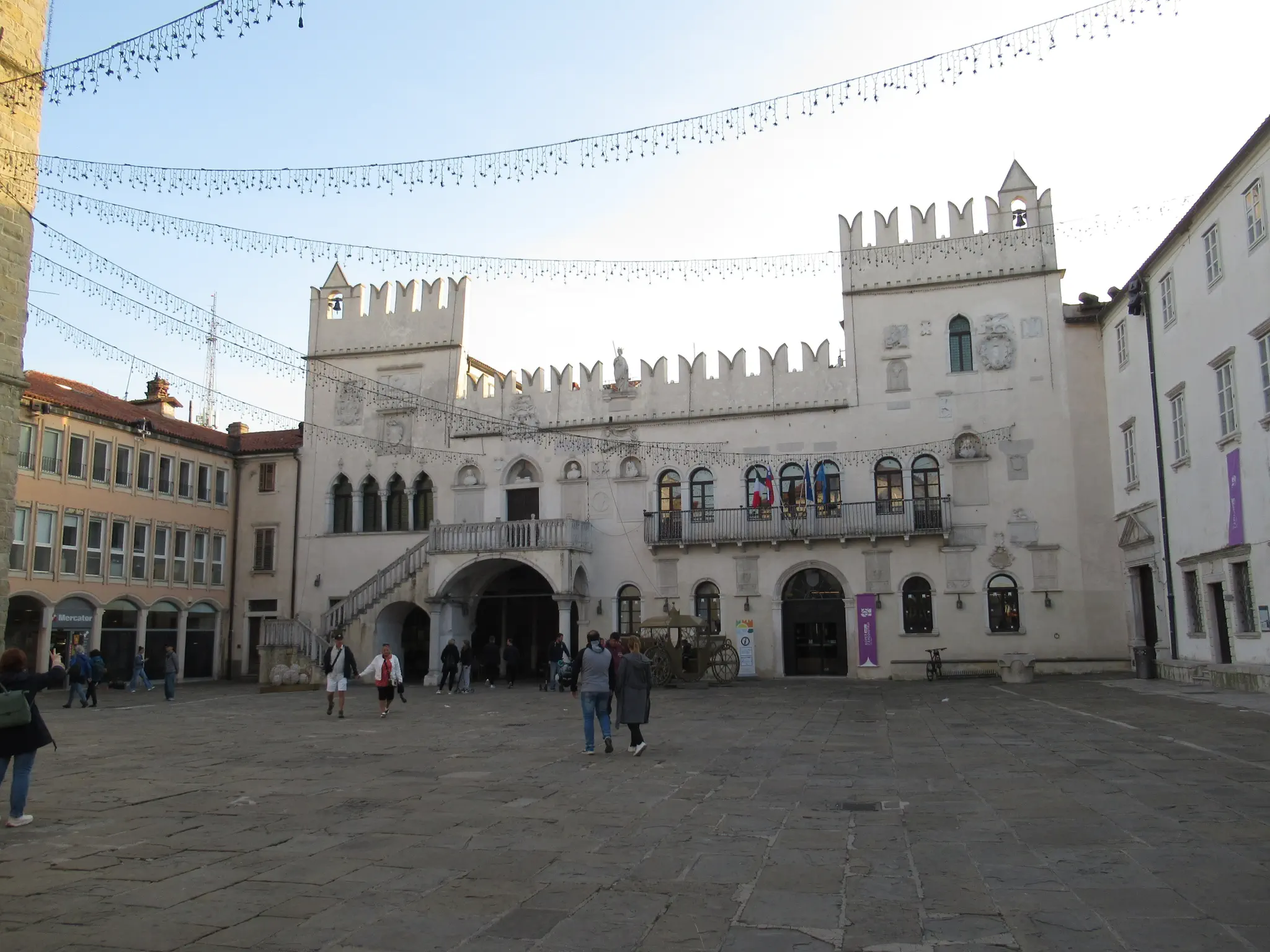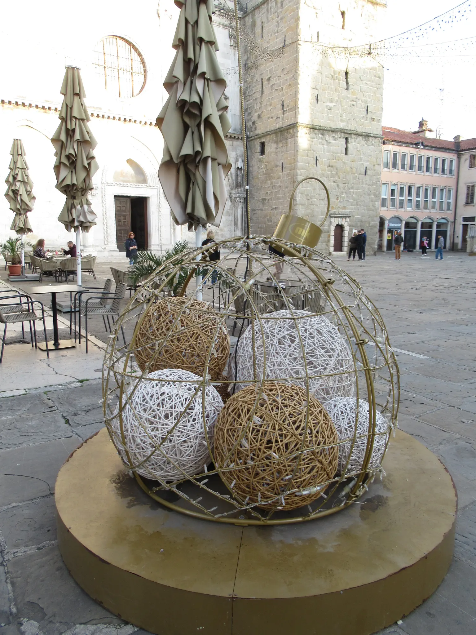 After the castle, we headed back to the Koper main town area. We lost our front row seat on the way back. Our tour guide passed around tourist booklets of Slovenia -- way too much to look at and at one point we were talking to her, so could not also look at a booklet. The bus went back to the cruise port, but she directed us to how to get to town by either an elevator or stairs. We did the elevator. Here is a Christmas decoration that was already out and the rest of the main square. We walked around a little and went to a grocery store. We found a candy with a hard mint shell on the outside with a chocolate icing center that you had to suck your way to the icing. I chewed the first time; this was not good. It was good eaten correctly.
