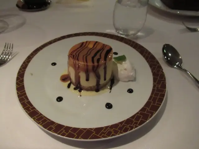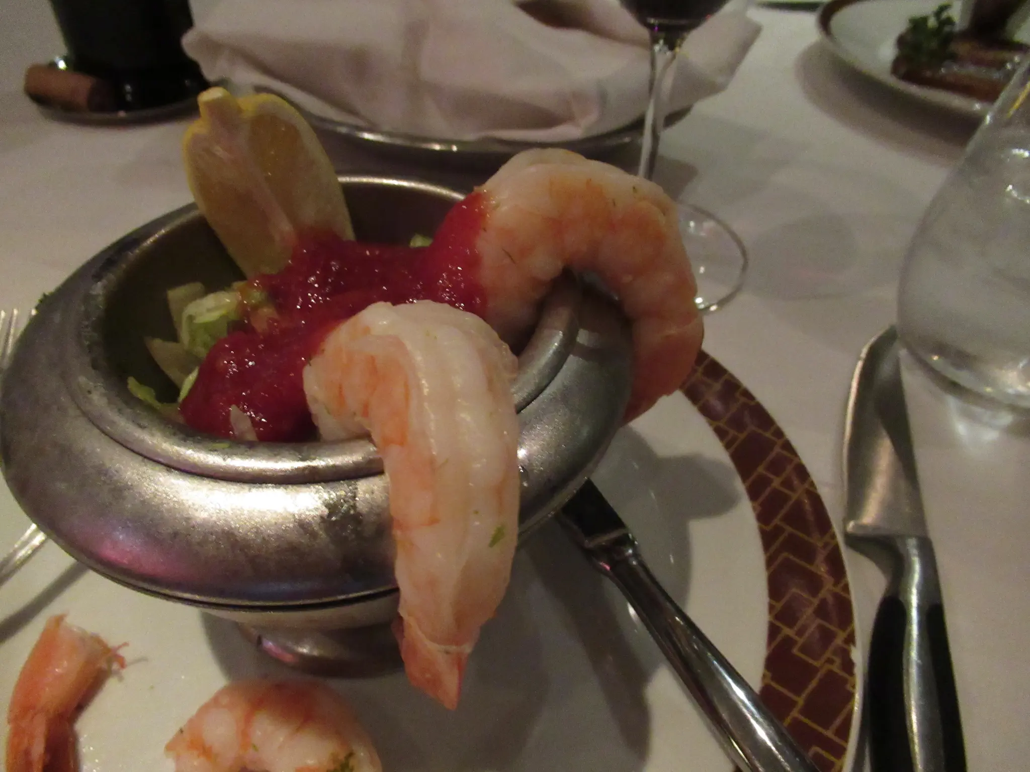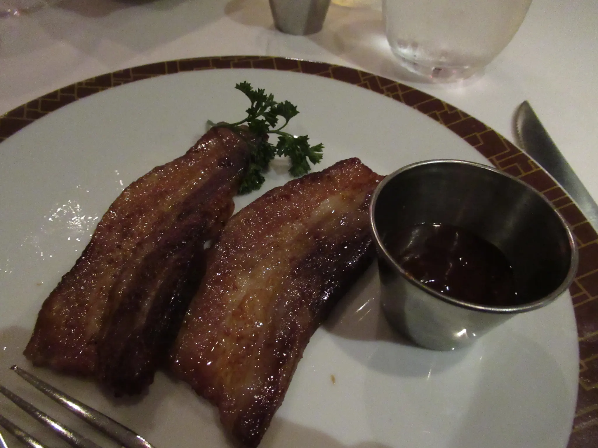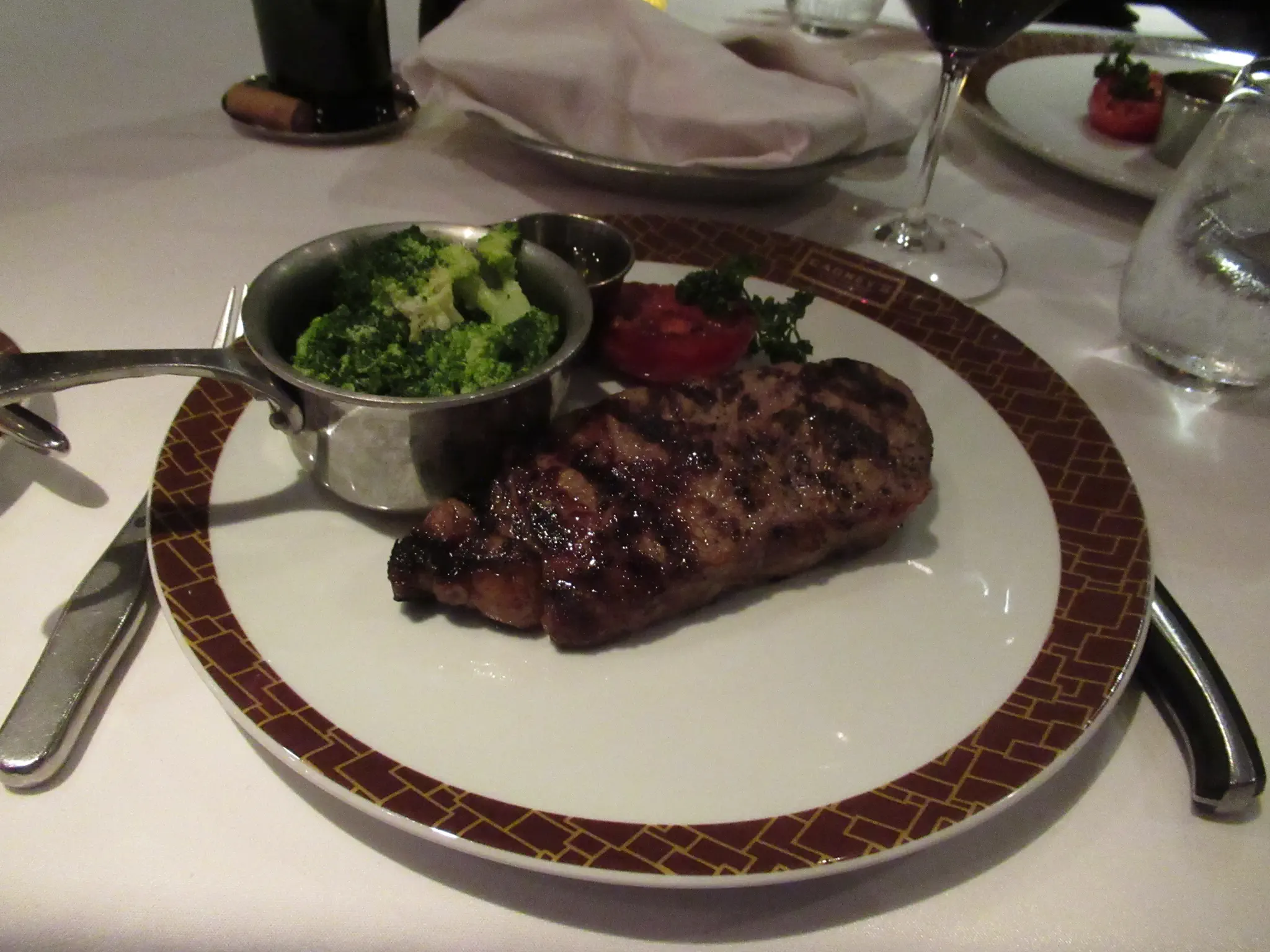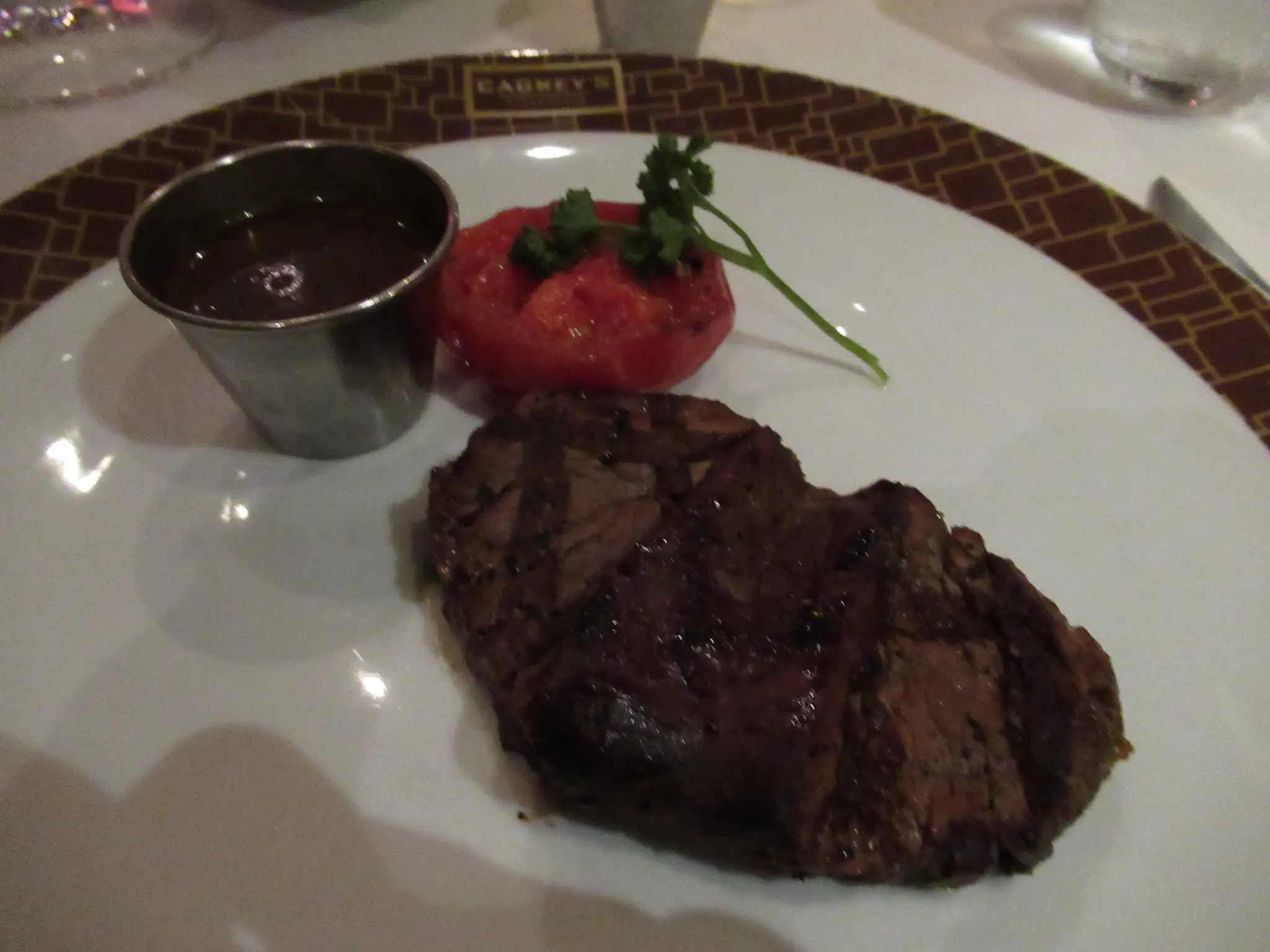 We had Cagney's Steakhouse and bottle of wine with our Sapphire status booked tonight. We had to have it early on the cruise before we got too full. Travis had the shrimp cocktail, and I had the grilled thick-cut bacon with homemade steak sauce. I was trying something new. I cut the meat off and ate around the fat; though bacon has a lot of fat. What I ate was tasty, and the steak sauce was very good. We were able to only get one side with the status voucher. I got my favorite the filet mignon with truffle fries, and Travis got something different -- the NY Strip Steak (I'll vouch that it was higher quality than the one in the MDR) -- and broccoli. For dessert, Travis had the OMG Caramel-Butterscotch cheesecake and me the seven layer chocolate cake. Everything was very good and so much food.
