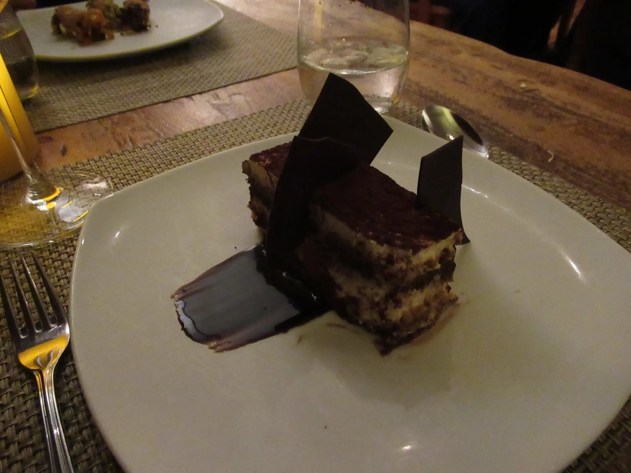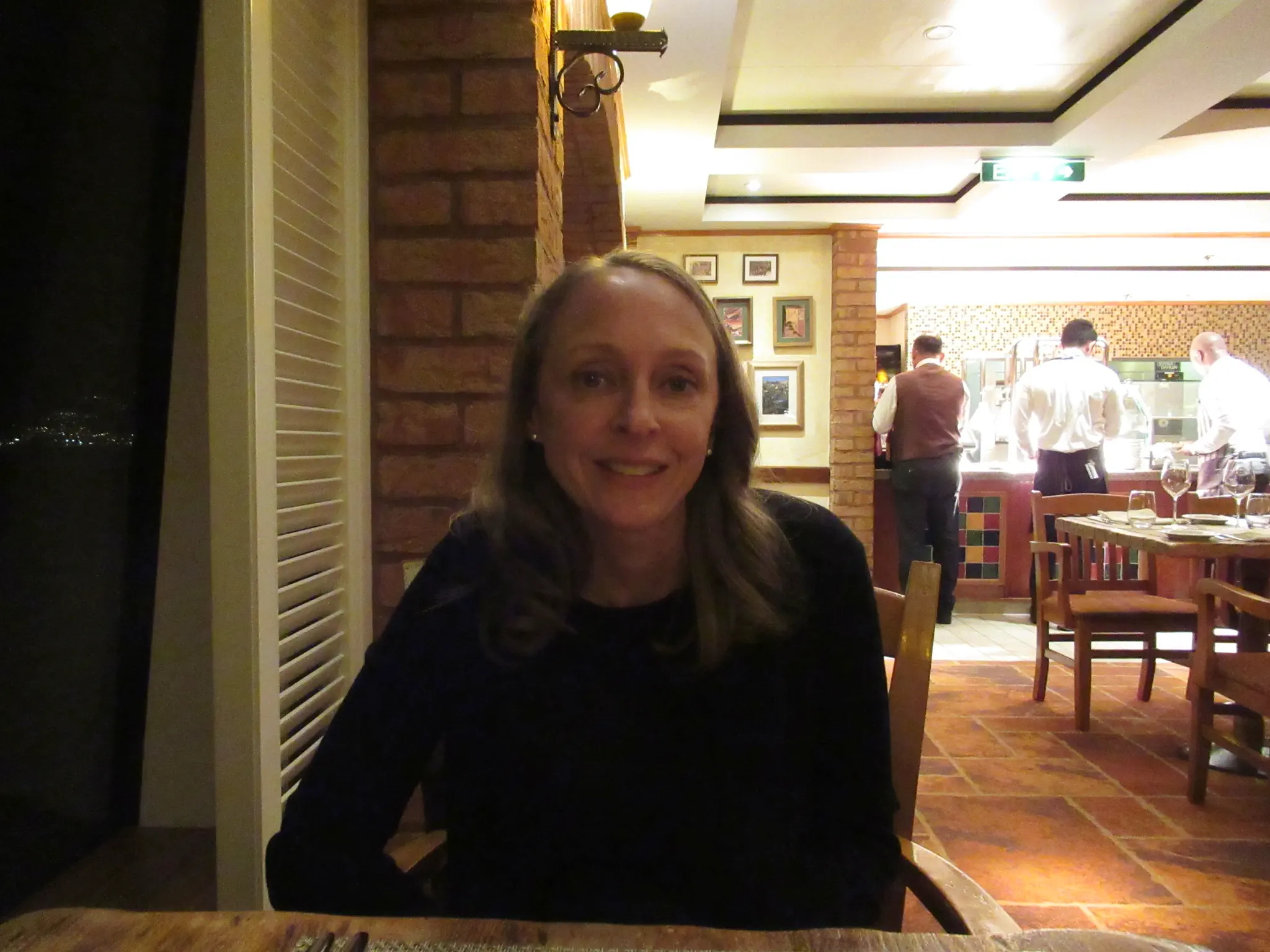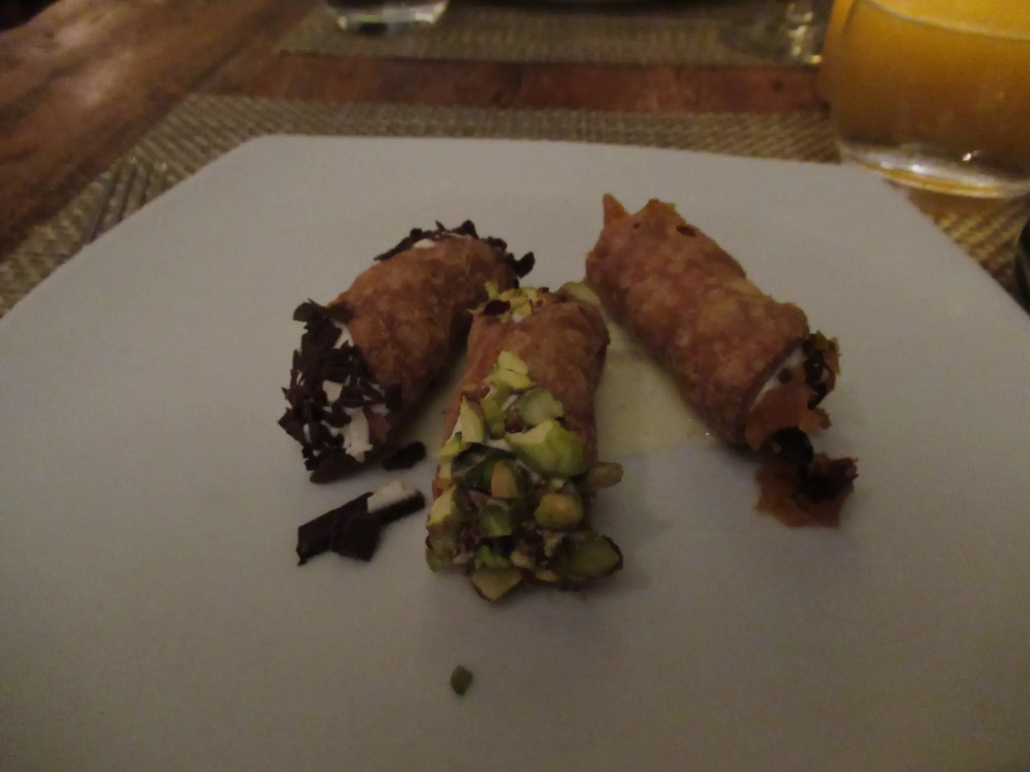 For a main, I had the salmon. I was disappointed in it though; it was not very good. I had a very good one in the MDR on P&O;, so I was hopeful for this one. Travis had the shrimp skewer. Then I had the cannoli, for a second night in a row, that came with chocolate, pistachio, and tutti fruity. Travis had the classic -- tiramisu. Pizza could be ordered instead of an entree, not also, like at one point.