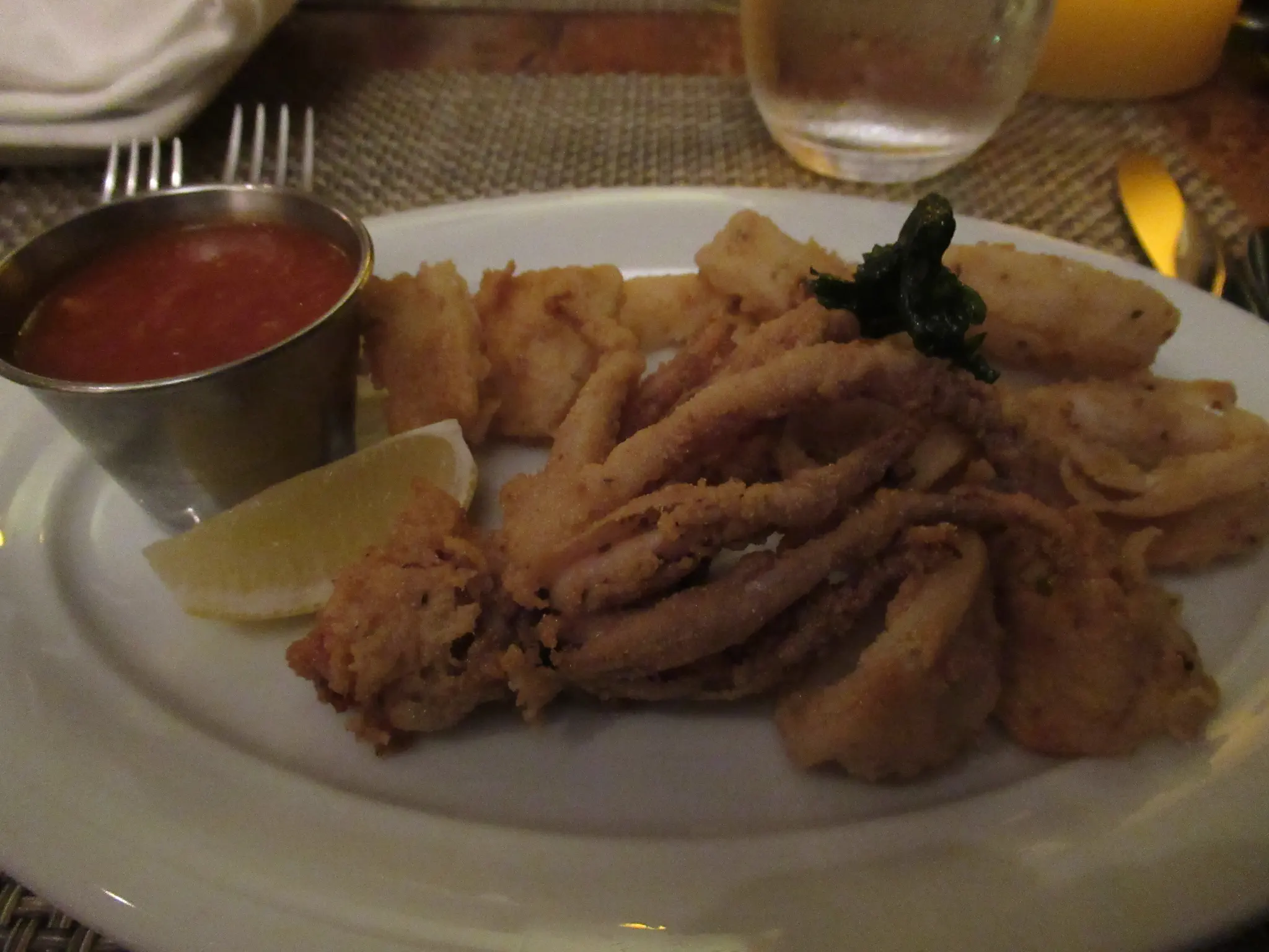 Travis had Caprese salad, and I had calami. It came with a whole baby squid or octopus; this one was the best part.