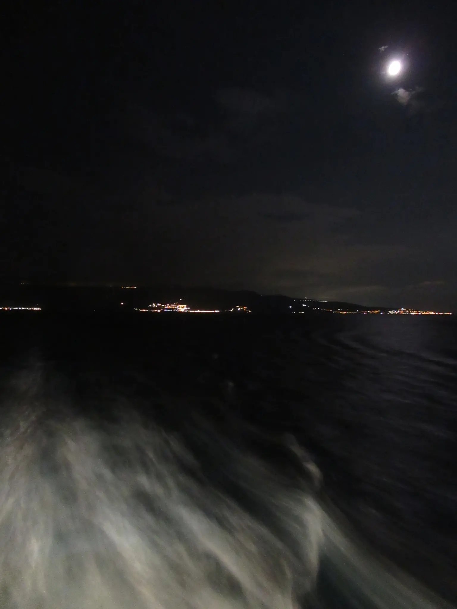 The moon, the wake, and some Italian city lights. We were surprised at how close Sicily was to mainland Italy.