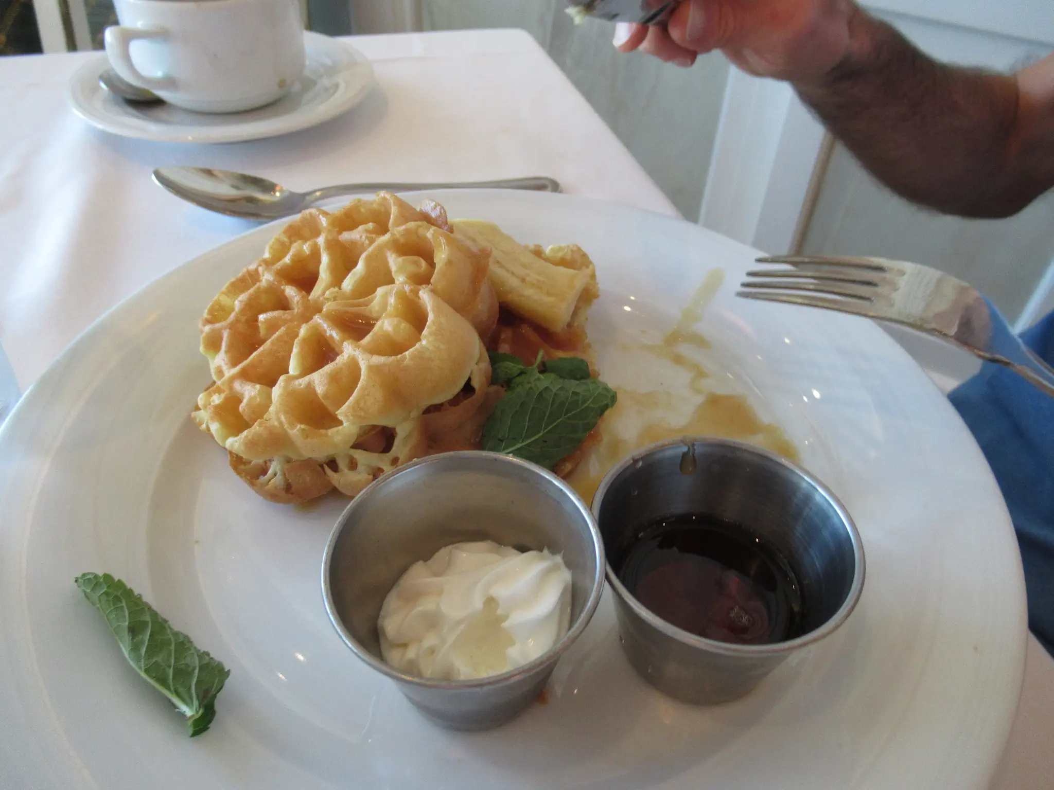 For breakfast, I got my favorite smoked salmon on a cream cheese bagel from the MDR. This is a thinner bagel that allows you to bit through with salmon the top. Travis had the waffle and fruit salad, instead of his usual (boring/healthy) oatmeal. There was a lady in the MDR in the table next to us who was saying to the waiter that she is allergic to herbs and that she can see herbs. What? All herbs? How could you eat or get any flavor?