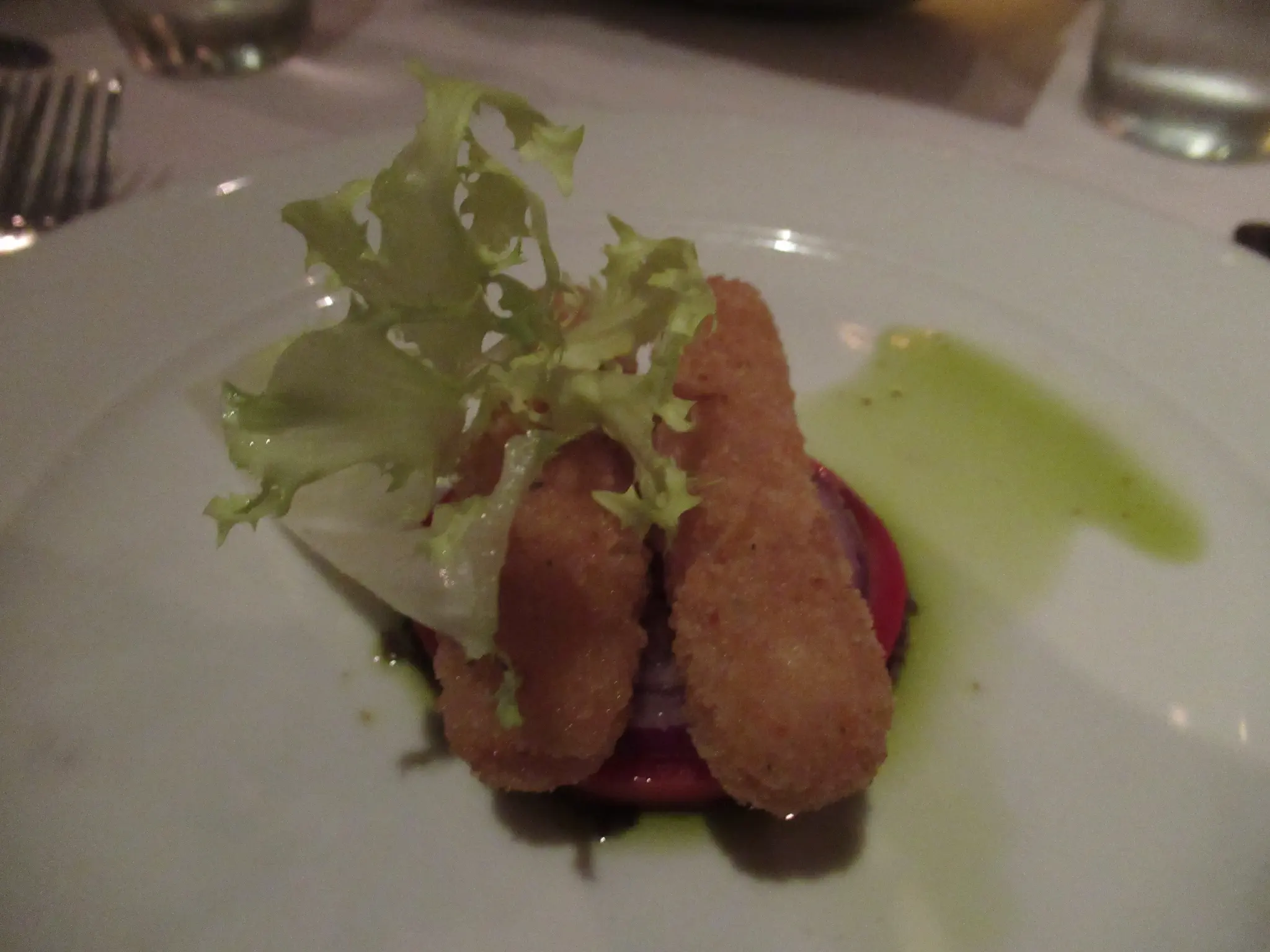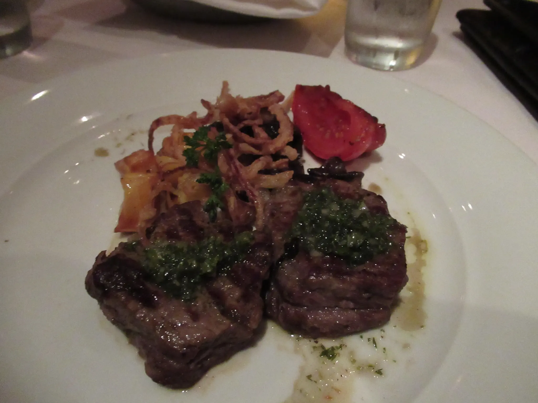 For the last night, we had the MDR. I enjoyed both of my courses. We skipped dessert until later in the buffet. I had the fried mozzarella sticks, and Travis had the strawberry spinach salad. For mains, I had the chimichurri sirloin steak, and Travis had the seafood skewer.