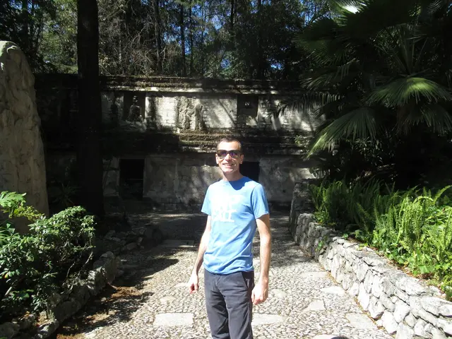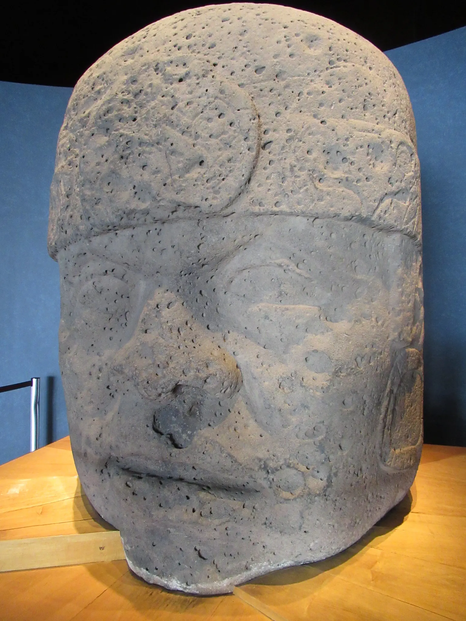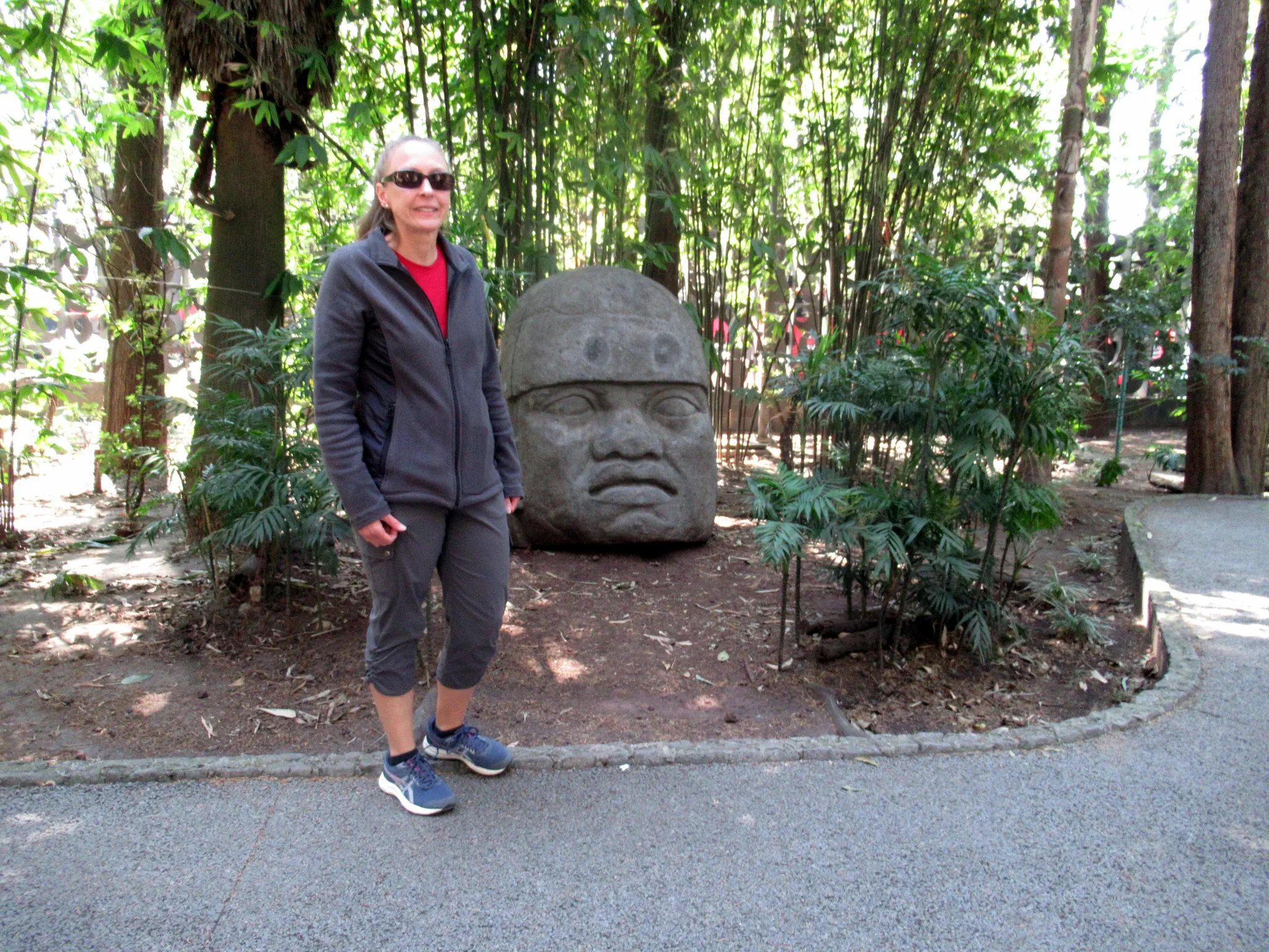Olmec head -- original and replica outside