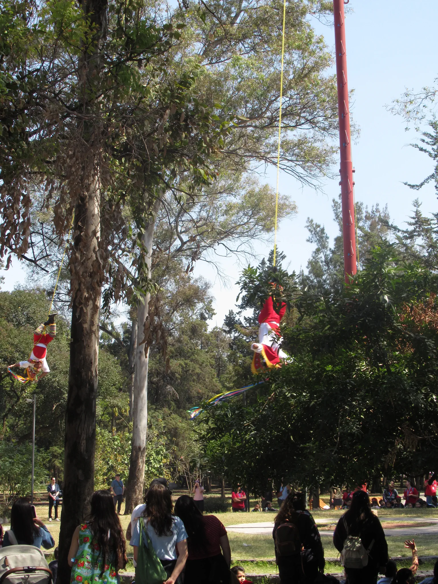 As we were leaving, there was a long line of students on a field trip to the museum waiting to get in. They all had white baseball caps; they were all different but all white. At our next visit at the Castle, they were hiking up when we were hiking down. We got lucky to miss the crowd. Outside, we found these upside down acrobats spinning around a pole. We just caught the end. We found lunch out here. Travis had a Tlayudas, which was a purple tortilla with refried black beans, hot sauce, cactus, onion, avocado, and cheese. It was not his favorite because of the cactus, and I noticed the hot hot sauce flavor the most. I had a hot dog. Travis wanted a caffeine drink, but they did not have diet over here. When we got more into the park, we bought a Coke Zero in a tall can. It was pricy at 40 Pesos. Then I was dying for a restroom later -- eek. In the park vendor area, we also tried a Arabe, which is a flatbread, like pita and got dulce de leche inside. Travis liked it; I was not a fan of the dulce de leche and am not at home or other places either. The vendor did a good job of taking the cash with a glove and not touch food with money germs.