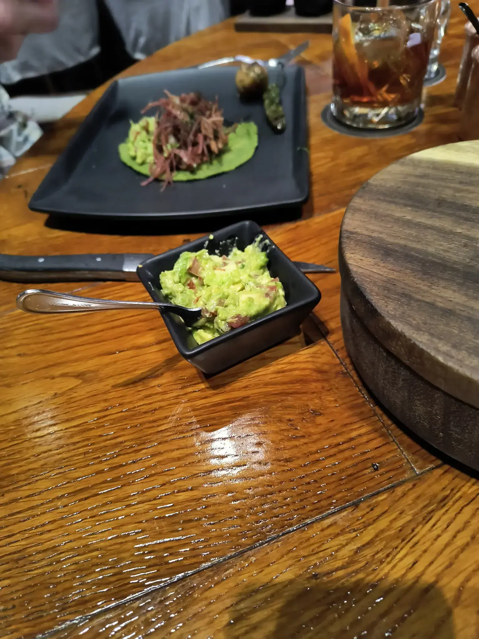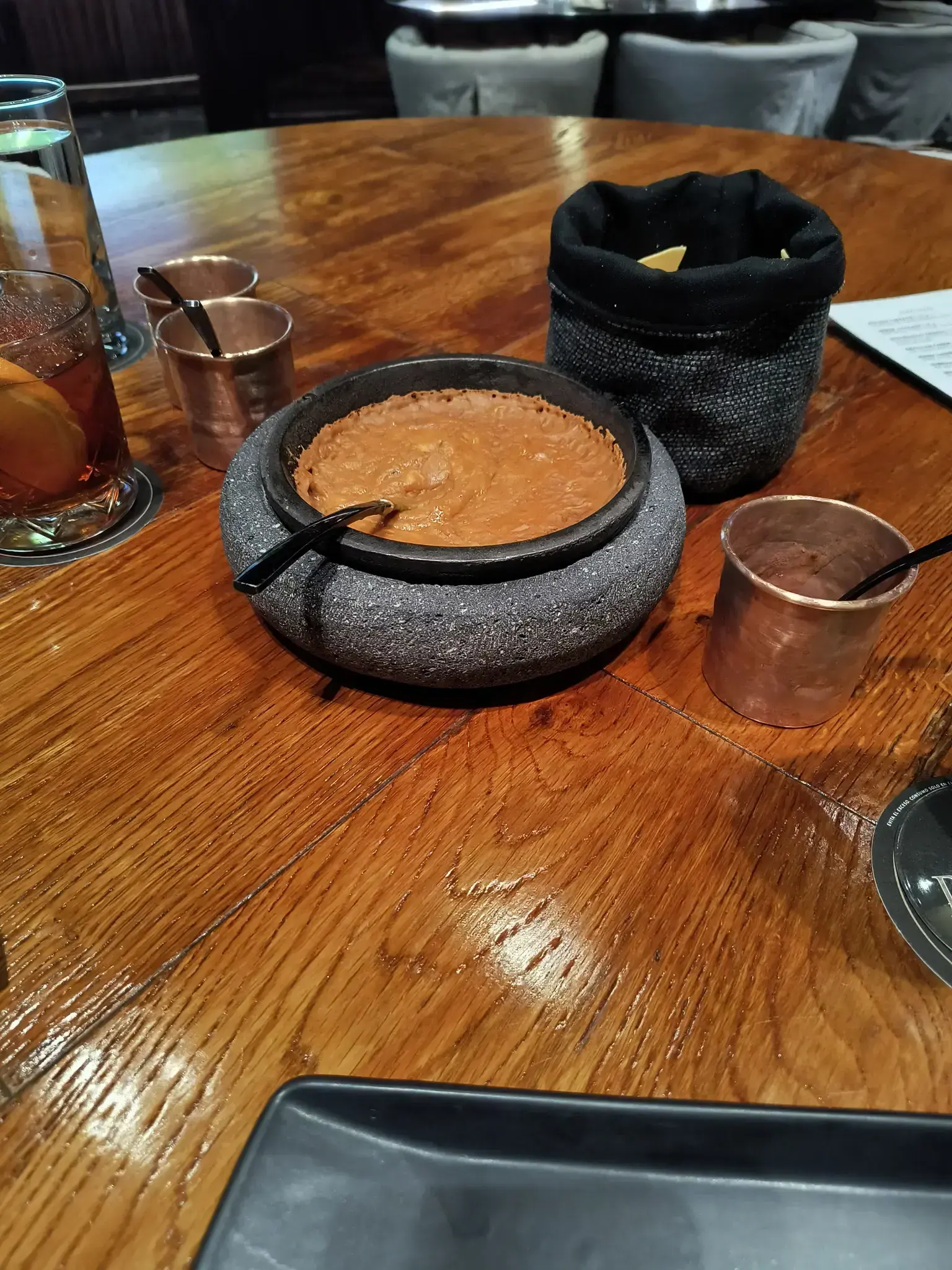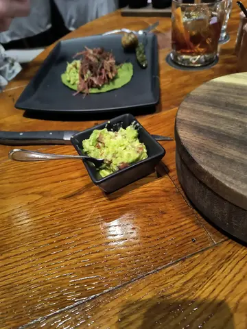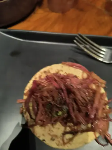 We ordered brisket tacos for two. They made them table side, which was exciting. They also brought us complimentary refried beans with cheese. As a non-refried bean eater, they were delicious. We also had drinks. The meal was very good. The only surprising part was that we only got 4 tortillas for 2 tacos each when we had a lot of brisket. I did eat some brisket on the good chips from the refried beans too with some salsa; this was very good too. I got some food pictures though not very good pictures. It was also served with salts -- the smoky black was good -- and salsas.