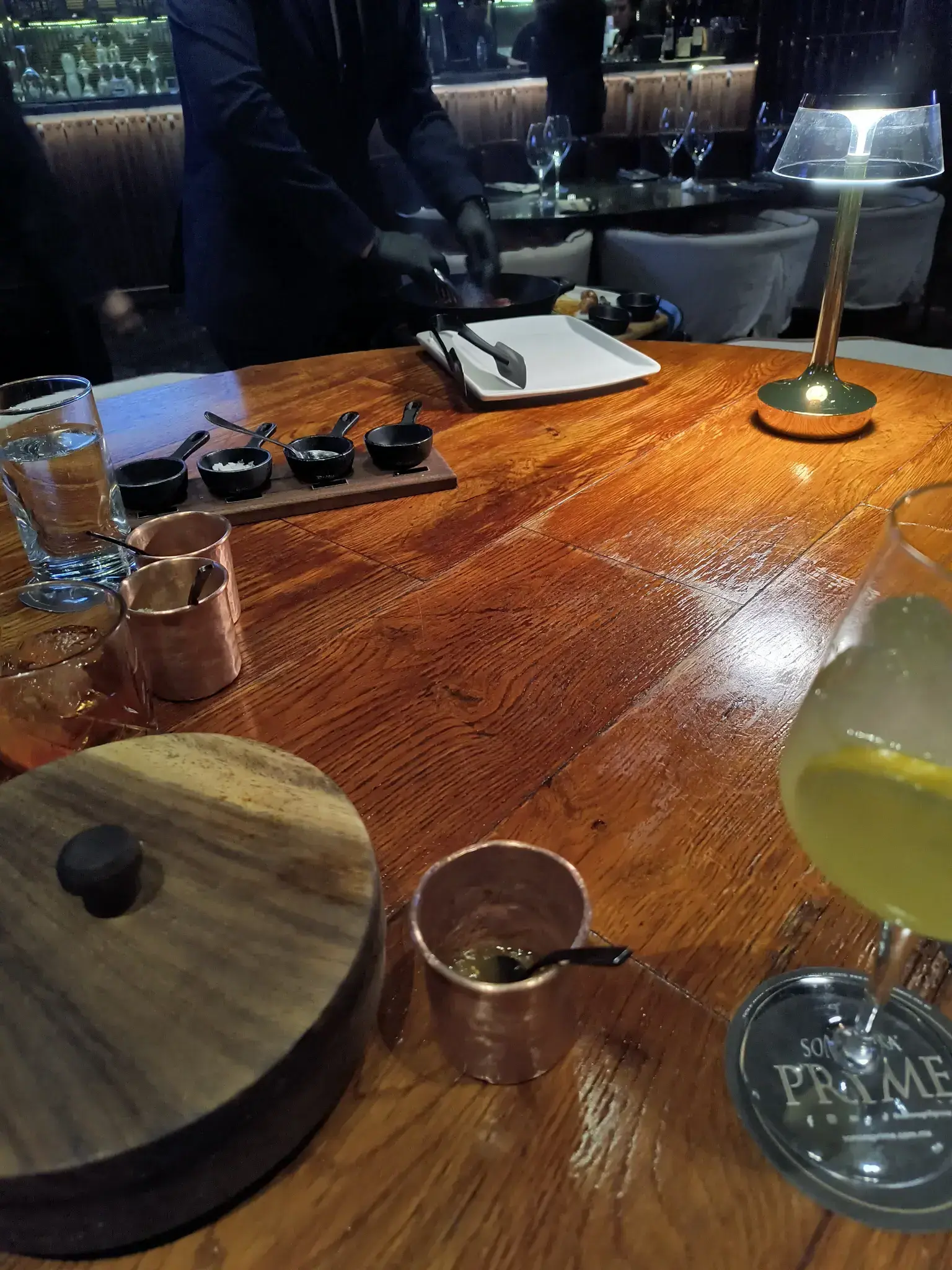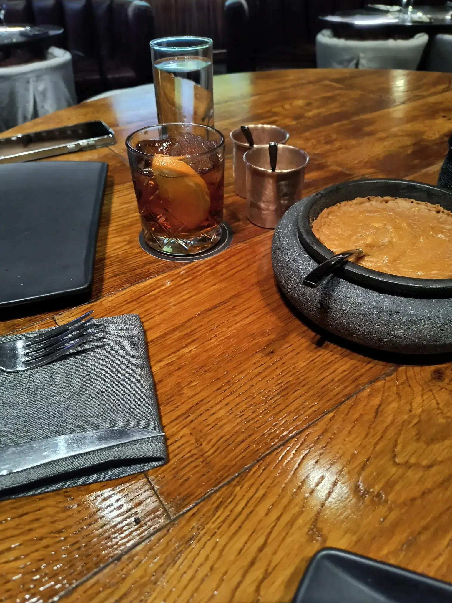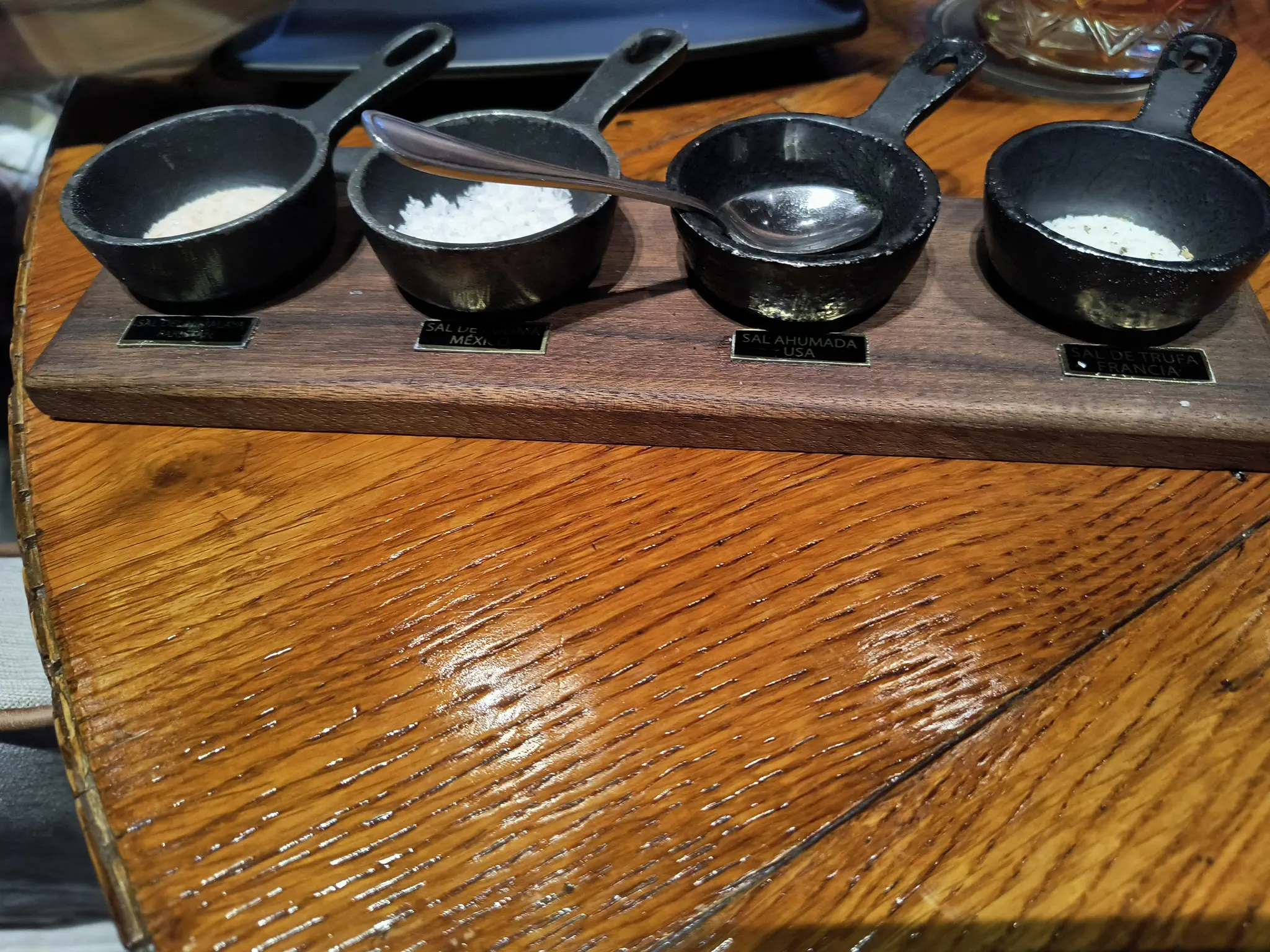 We ordered brisket tacos for two. They made them table side, which was exciting. They also brought us complimentary refried beans with cheese. As a non-refried bean eater, they were delicious. We also had drinks. The meal was very good. The only surprising part was that we only got 4 tortillas for 2 tacos each when we had a lot of brisket. I did eat some brisket on the good chips from the refried beans too with some salsa; this was very good too. I got some food pictures though not very good pictures. It was also served with salts -- the smoky black was good -- and salsas.