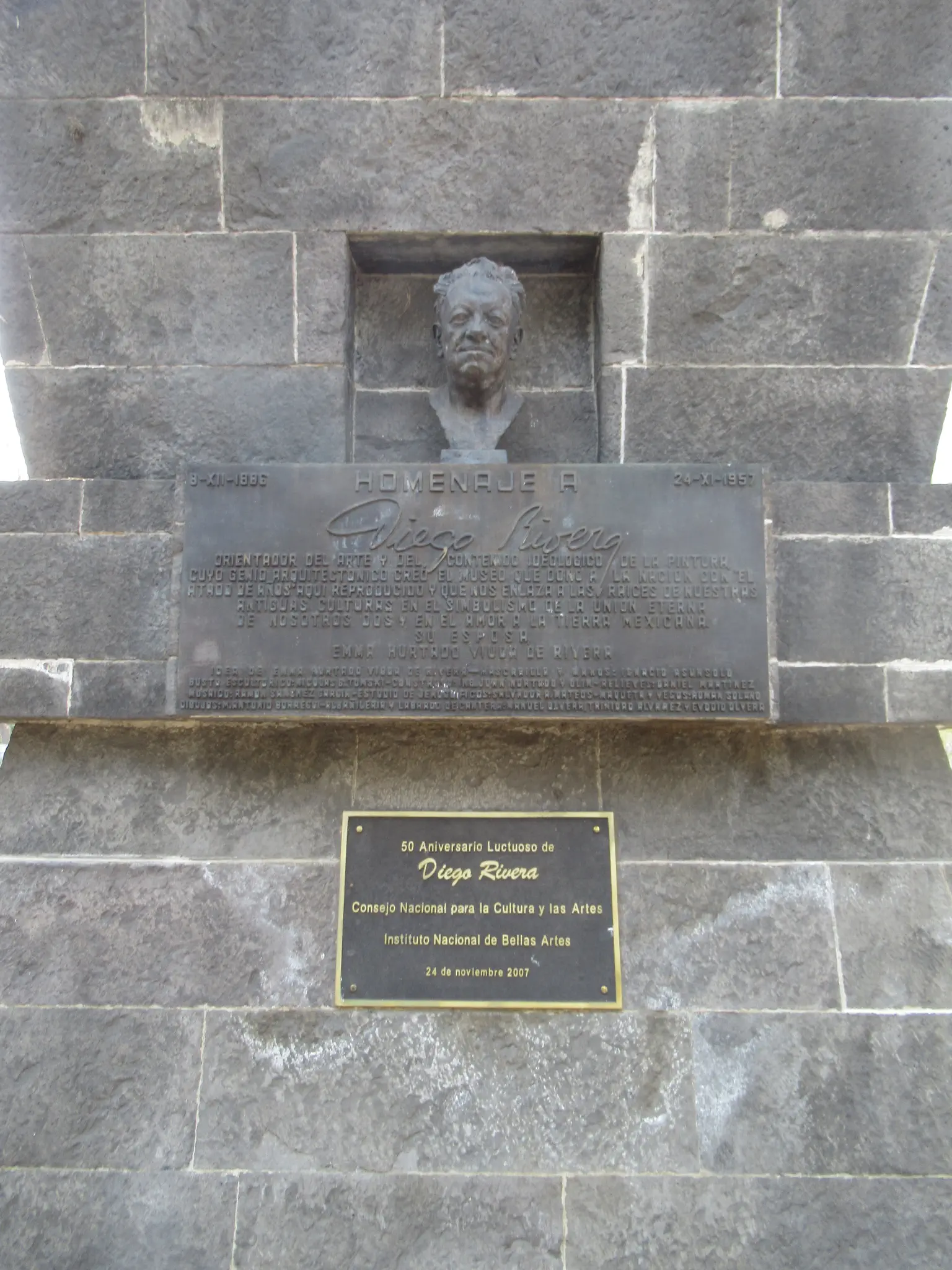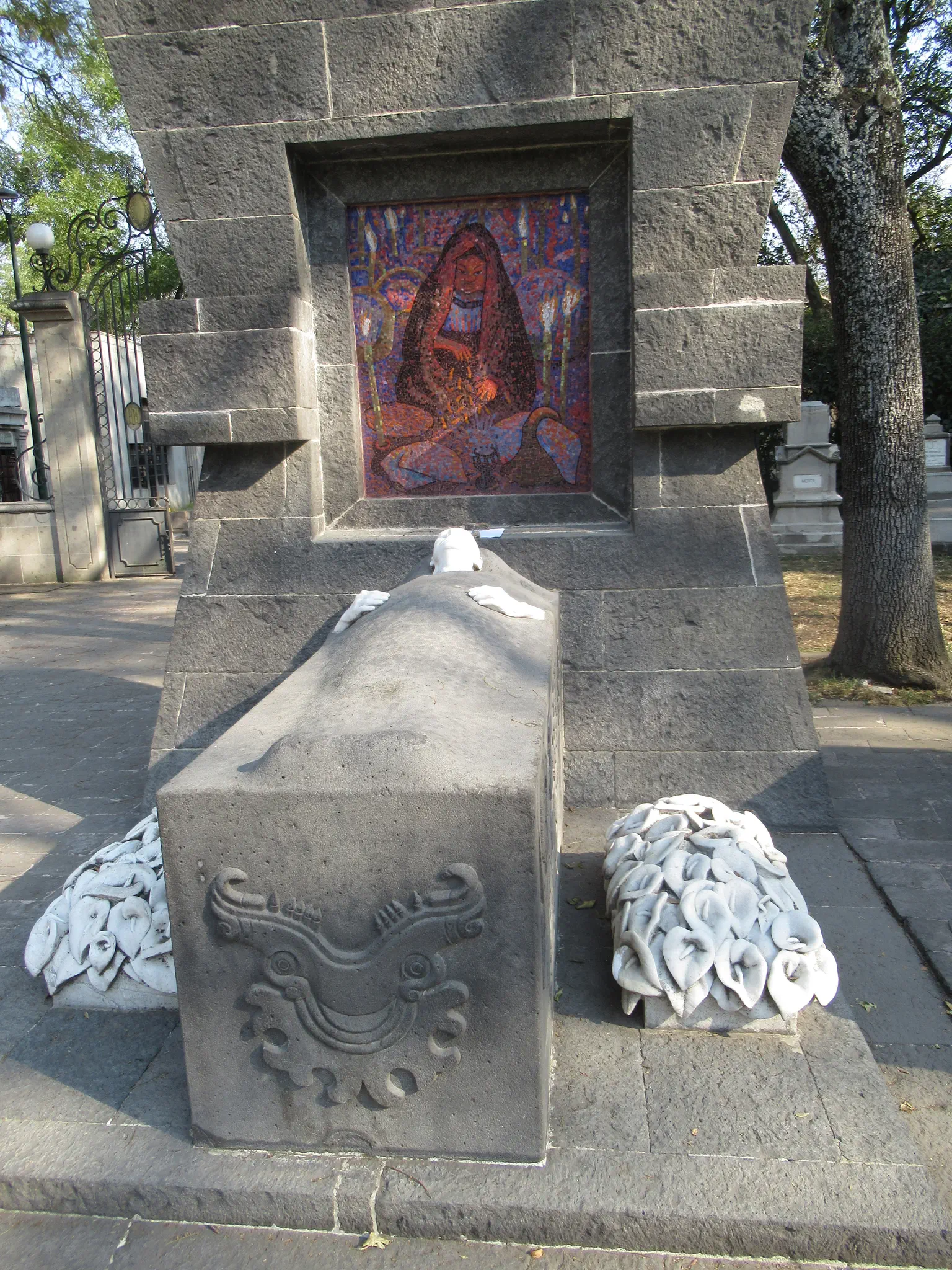 After the long wait and with Metro card credit now, we got on. Since this station was very busy, the cars were full. When they are not full, you have to sit on opposite sides to balance the weight. I think that I had to sit backwards each time, which made me a little sick feeling. It was a beautiful ride. We got off at the Panteón de Dolores station to visit the Panteón Civil de Dolores (cemetery). It had tombs above ground, like New Orleans has. We visited the Rotonda de las Personas Ilustres -- the rotunda of famous people. We saw Diego Riviera's grave (pictured below).