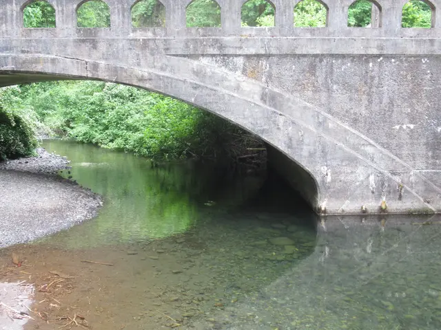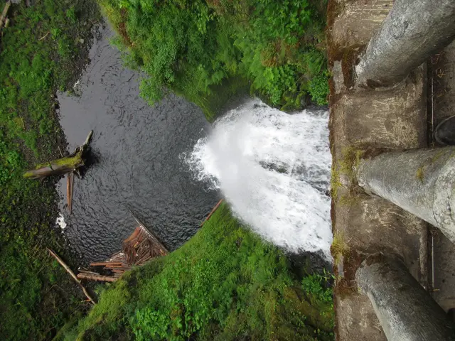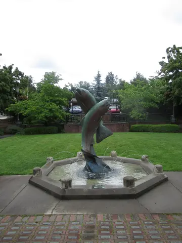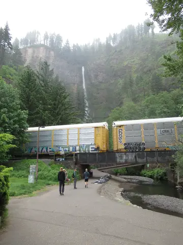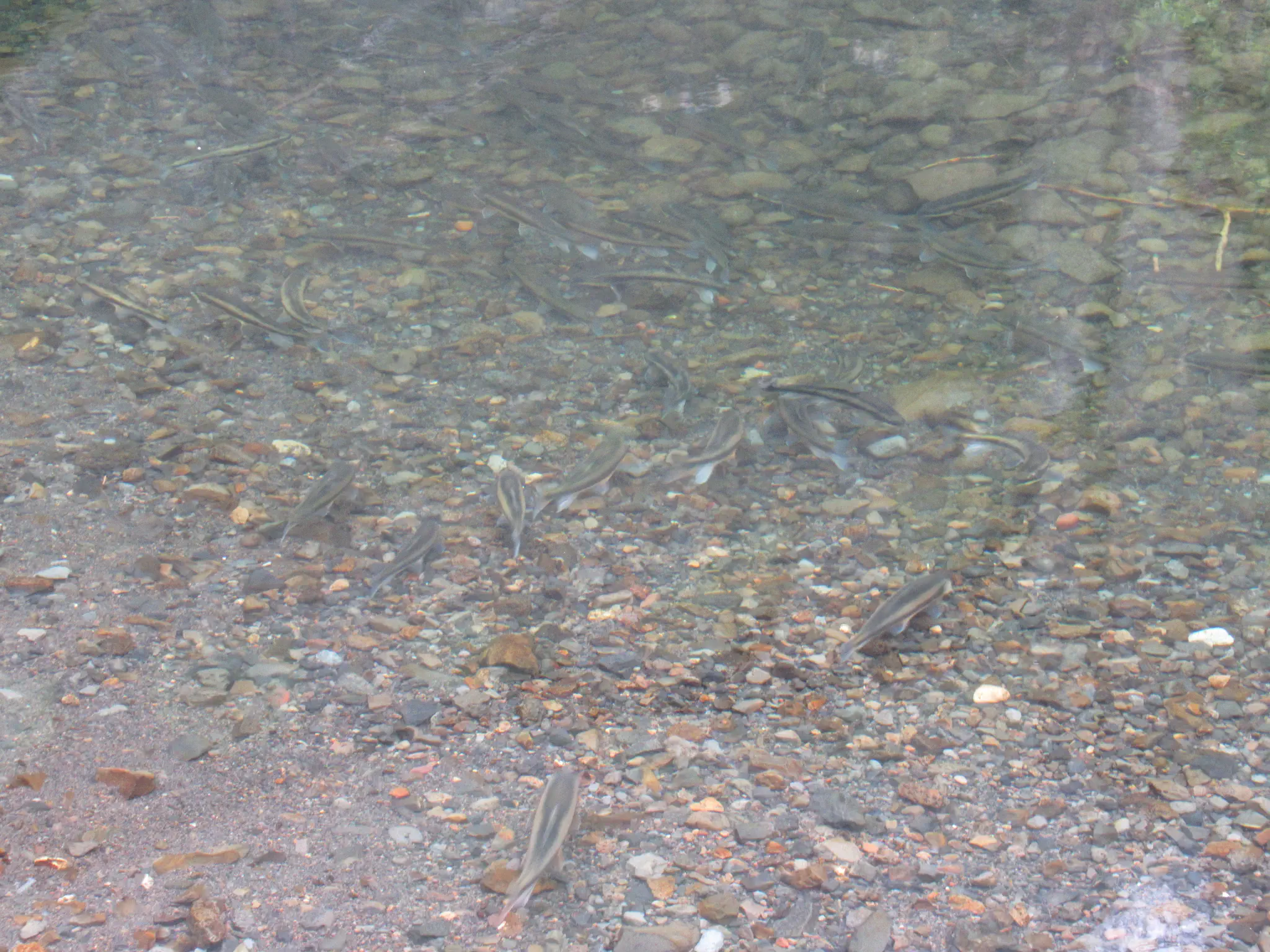 The parking between I-84 had an underground tunnel to Multnomah Falls and an underpass under the railroad tracks. The ever present train along the gorge and river. Though this is part of the history of the river. The river has to remain navigable, unlike some other rivers (comparing to other dams like Hoover and Glen Canyon). So, when the dams were build, Bonneville, The Dalles, etc. for flood control and electricity generation, they had to create locks to raise ships to the dam level and fish ladders for the fish to run and get back to the Pacific. Very interesting, more on the dams later. Below the train bridge, we found fish. Then we found the waterfall; okay, really you can see it from the road.
