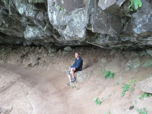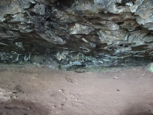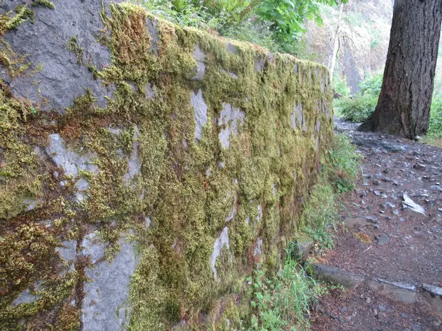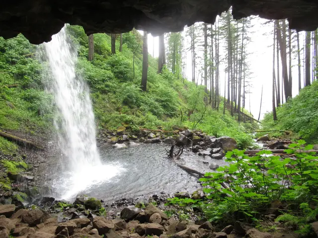 Cool growths or discolorations on the rocks in the cave behind Ponytail Falls.