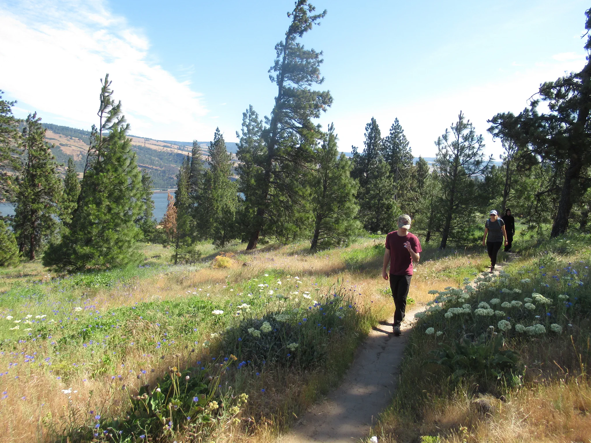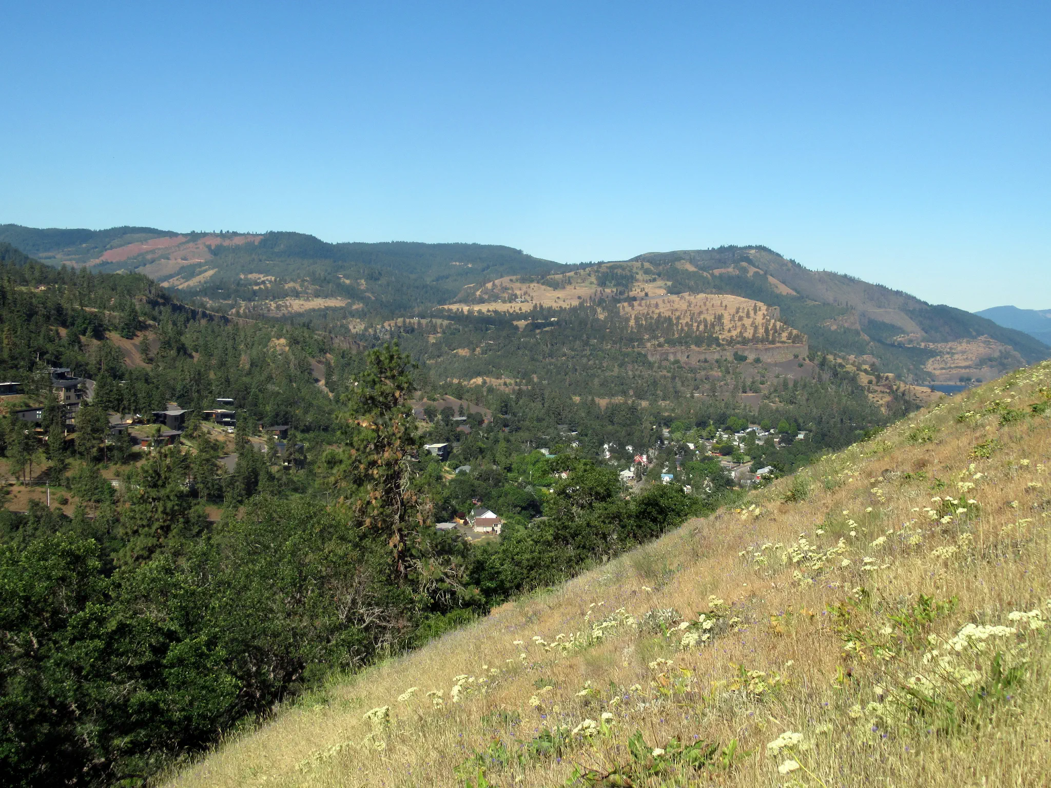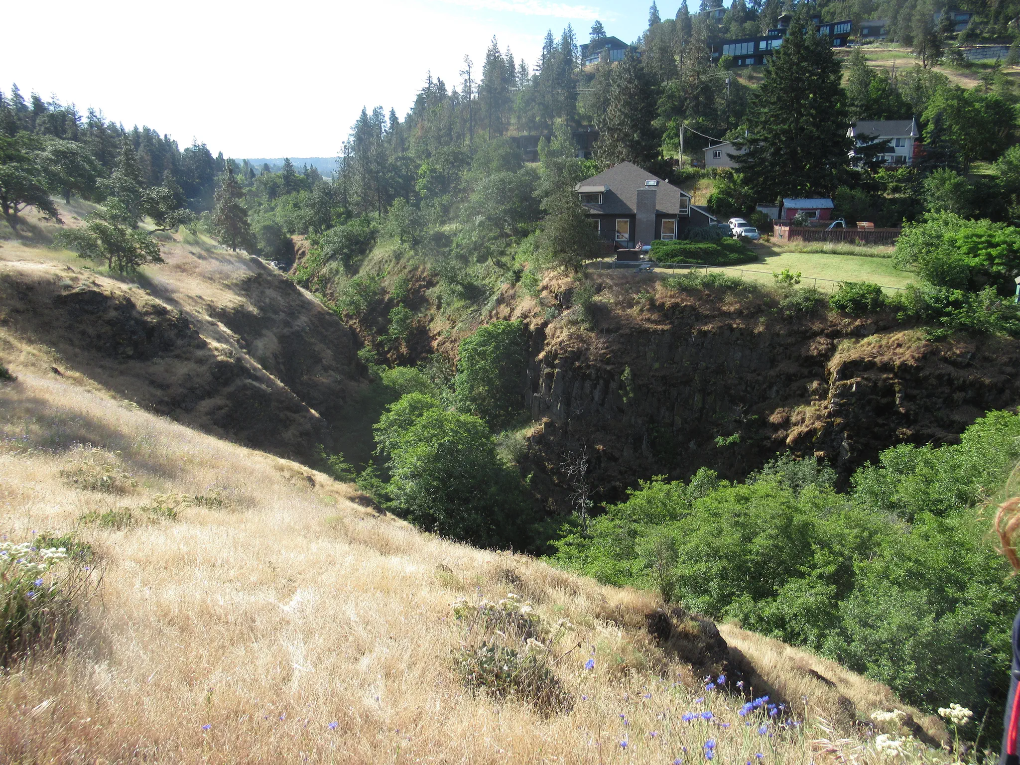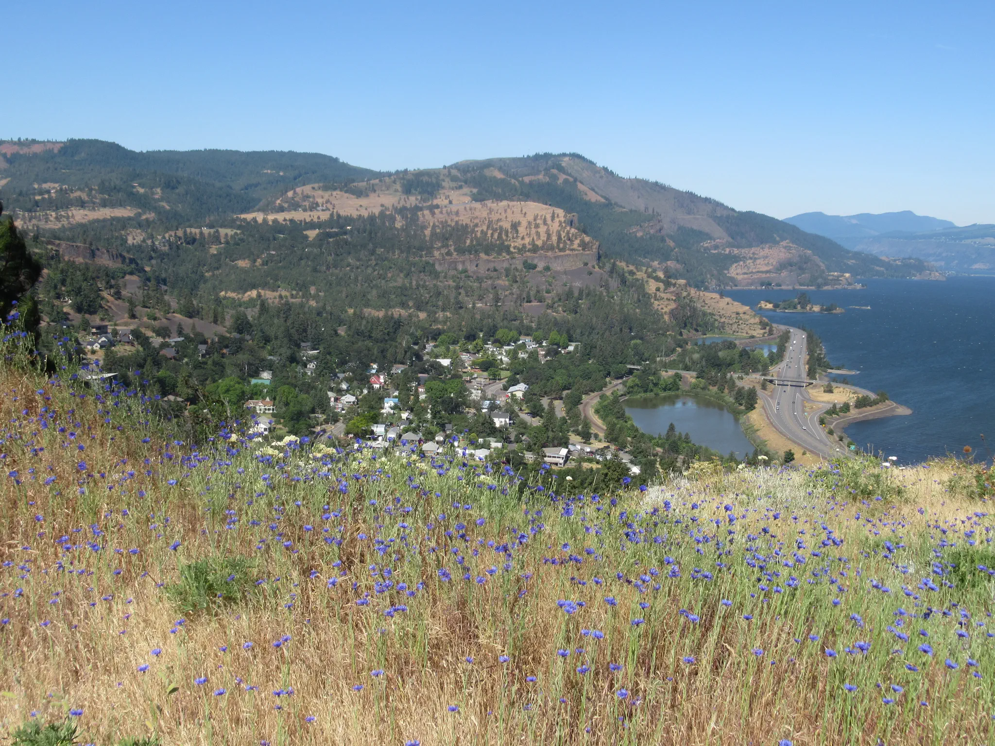 The trail was called Mosier Plateau Trail. It had some uphill and switchbacks with good views, a gorge, a waterfall, and wildflowers. There were awesome houses overlooking the gorge and waterfall. We are definitely on the dry side of Oregon now. In hindsight, I should have planned at least one more night on the wet side; it is just so pretty with the greens and waterfalls.