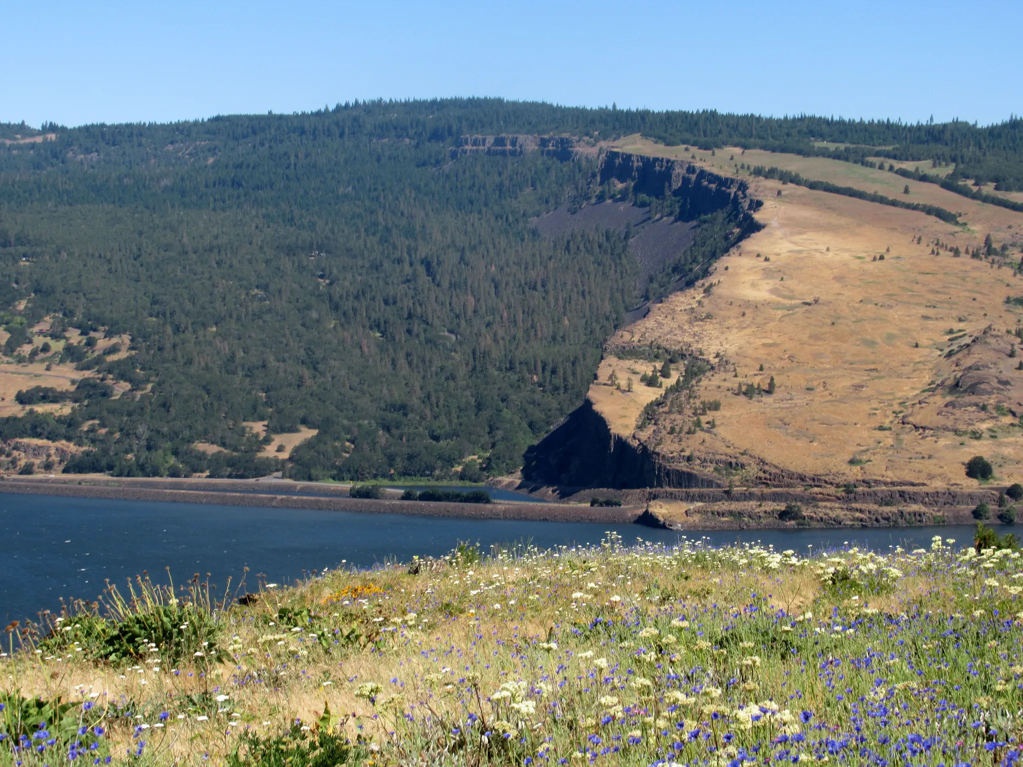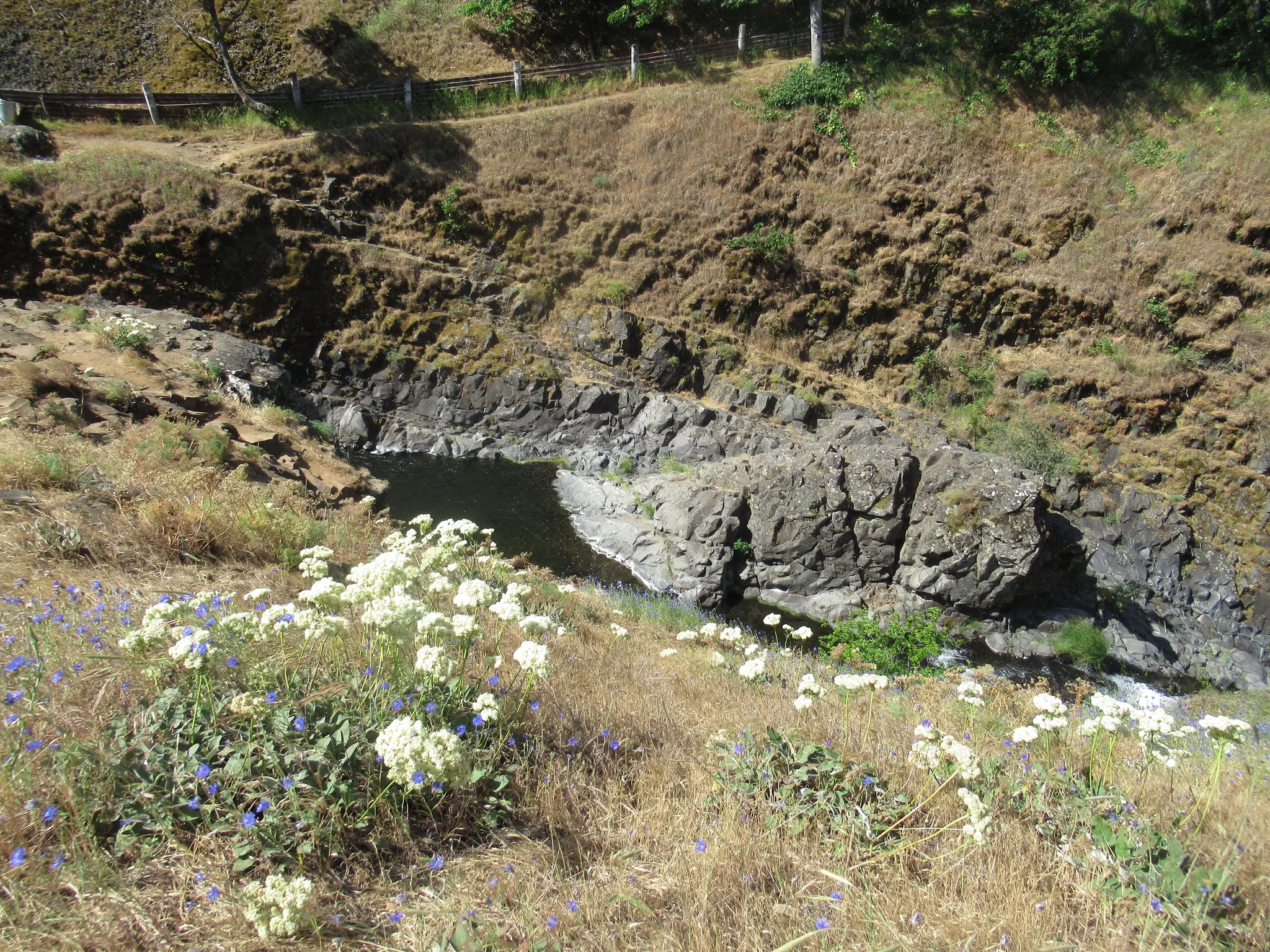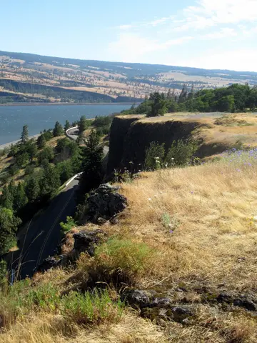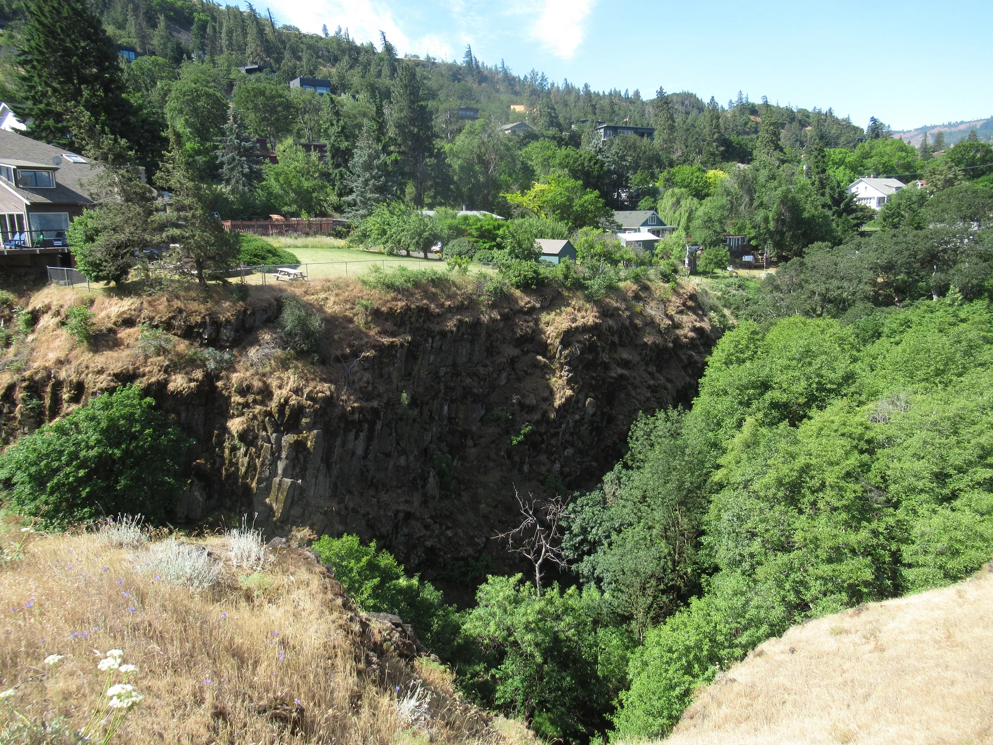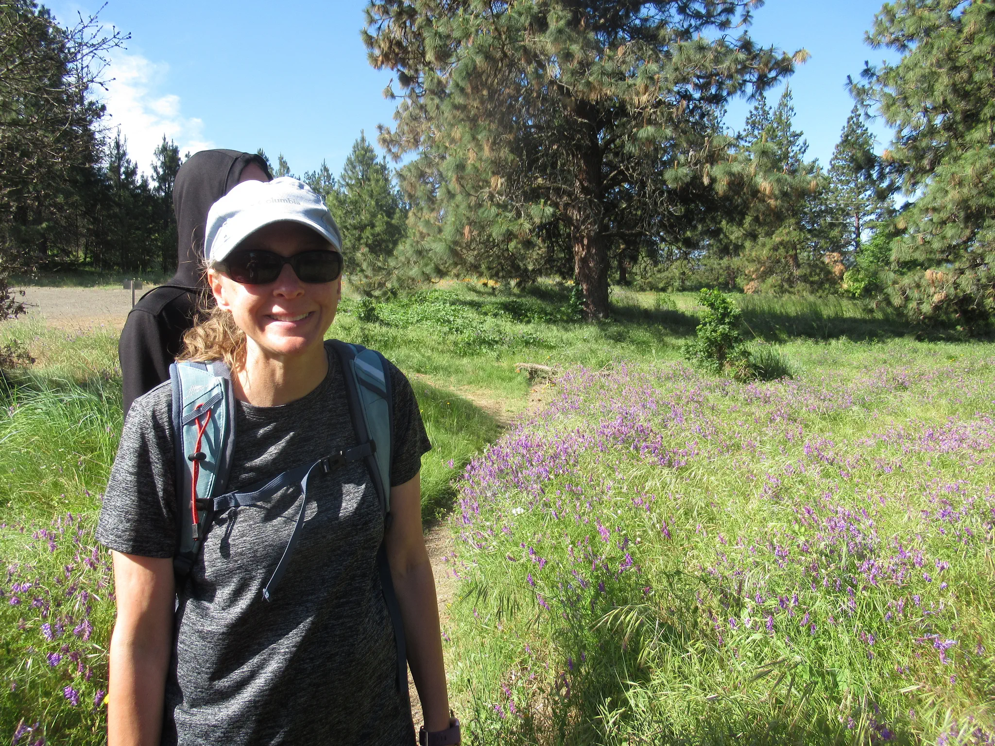 The trail was called Mosier Plateau Trail. It had some uphill and switchbacks with good views, a gorge, a waterfall, and wildflowers. There were awesome houses overlooking the gorge and waterfall. We are definitely on the dry side of Oregon now. In hindsight, I should have planned at least one more night on the wet side; it is just so pretty with the greens and waterfalls.