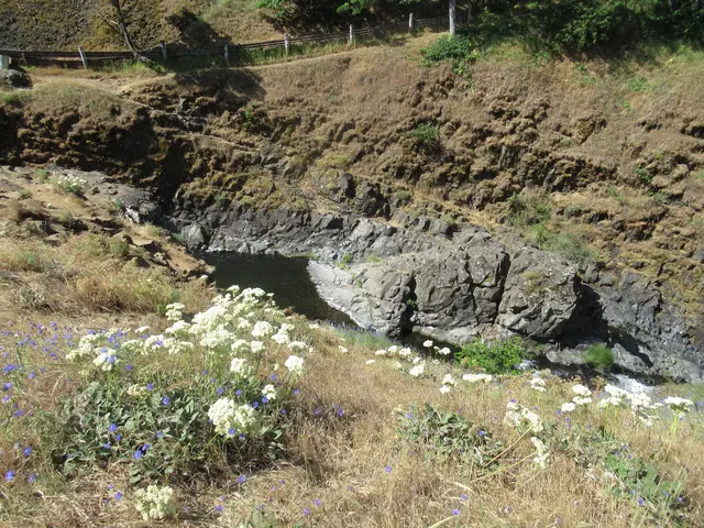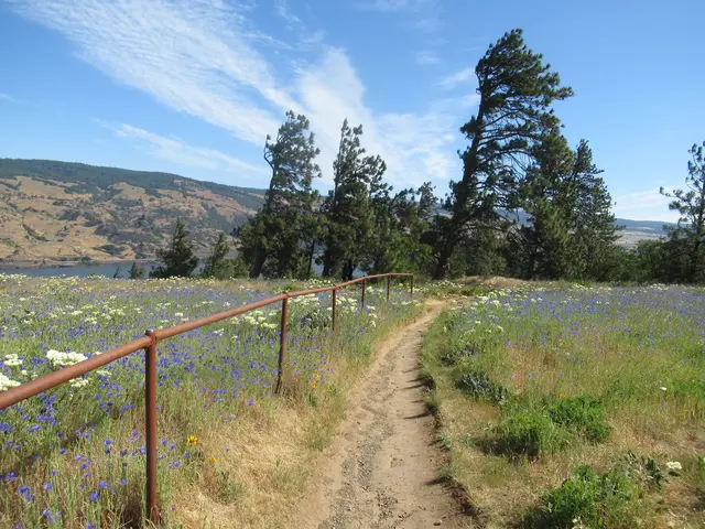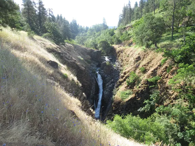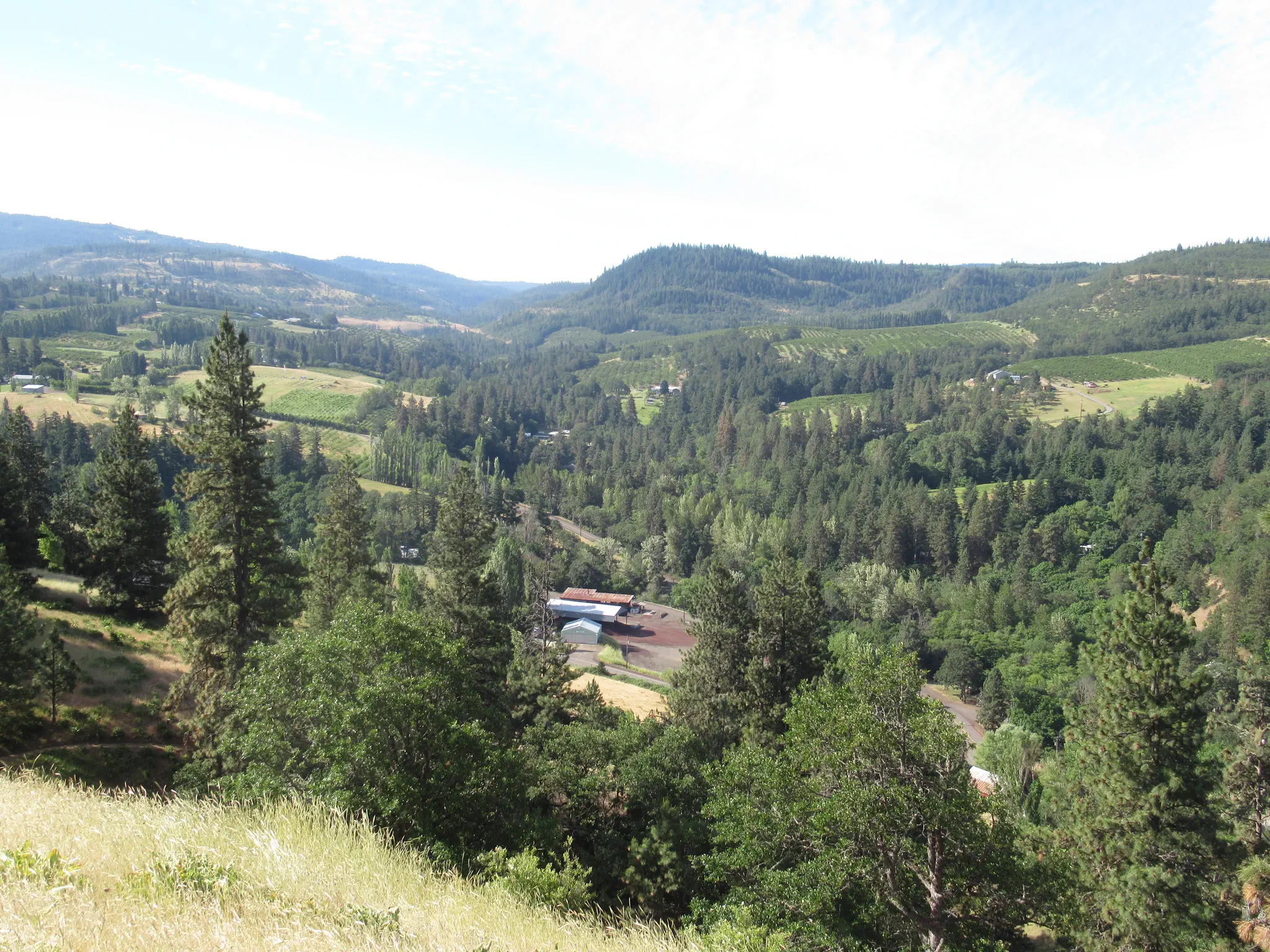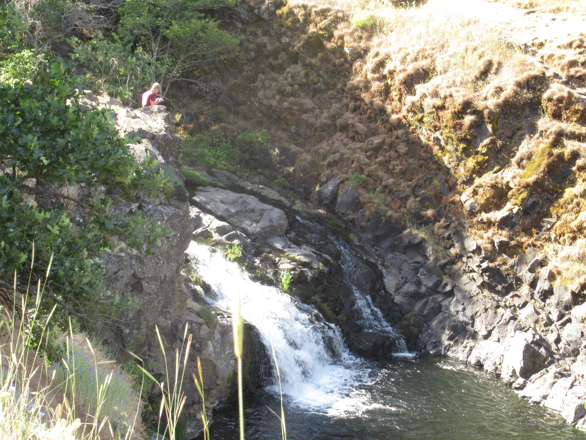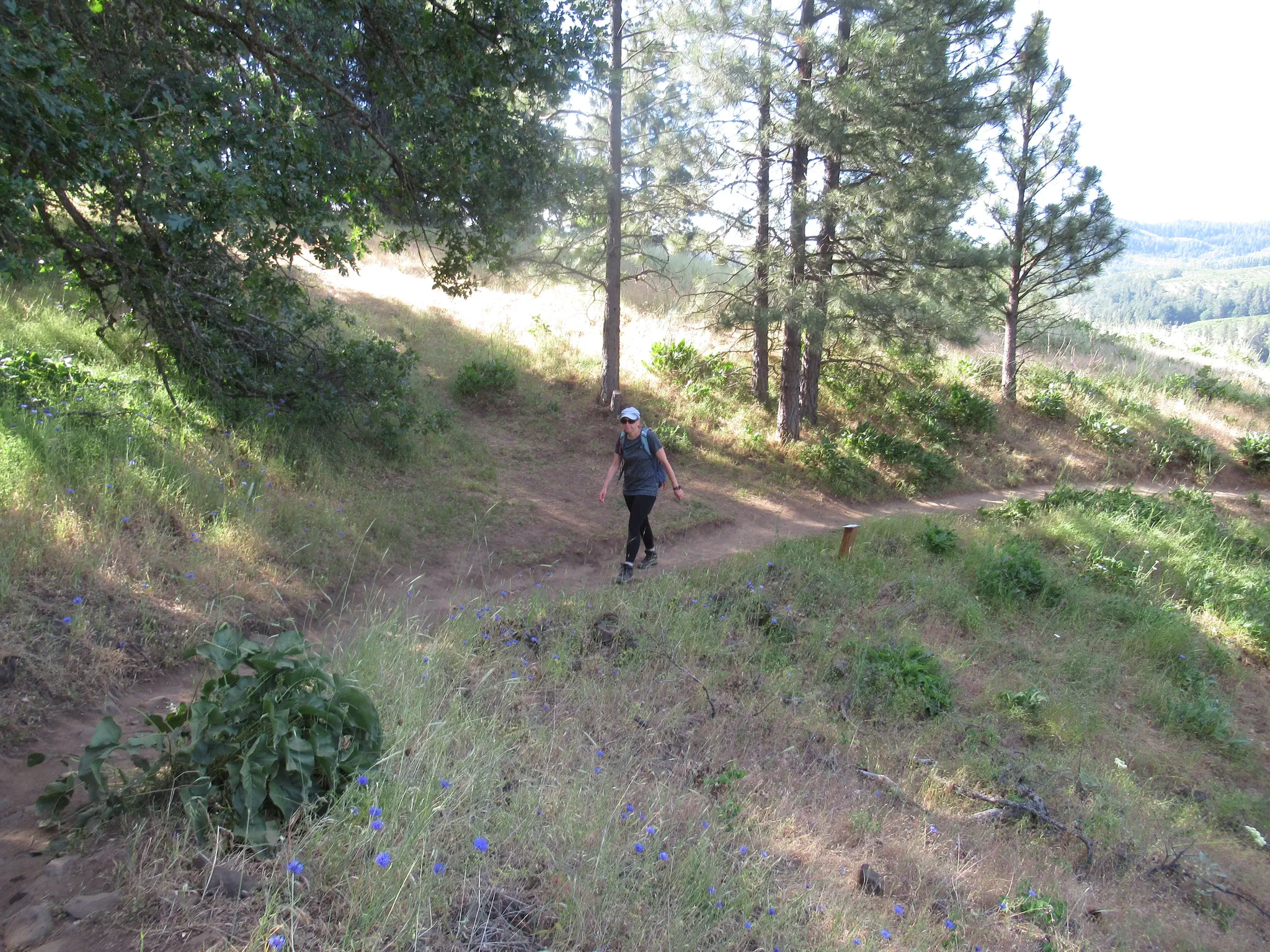The trail was called Mosier Plateau Trail. It had some uphill and switchbacks with good views, a gorge, a waterfall, and wildflowers. There were awesome houses overlooking the gorge and waterfall. We are definitely on the dry side of Oregon now. In hindsight, I should have planned at least one more night on the wet side; it is just so pretty with the greens and waterfalls.