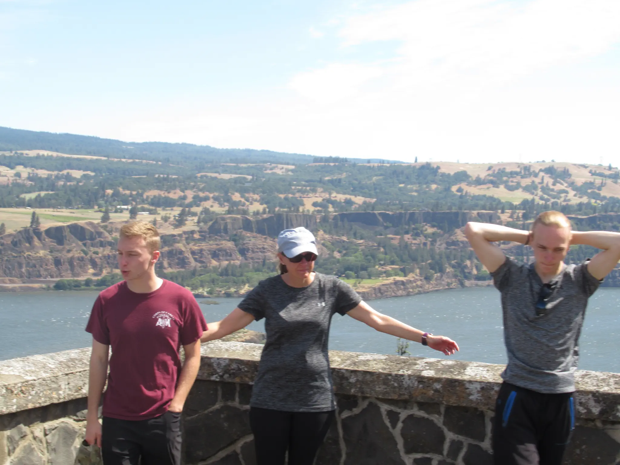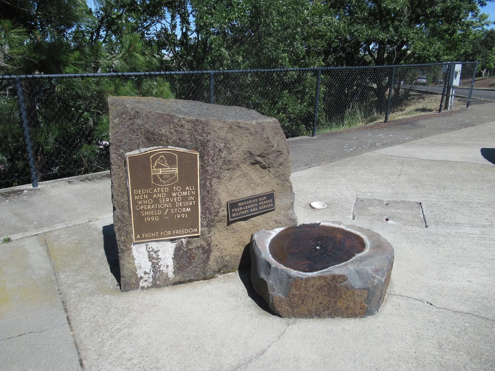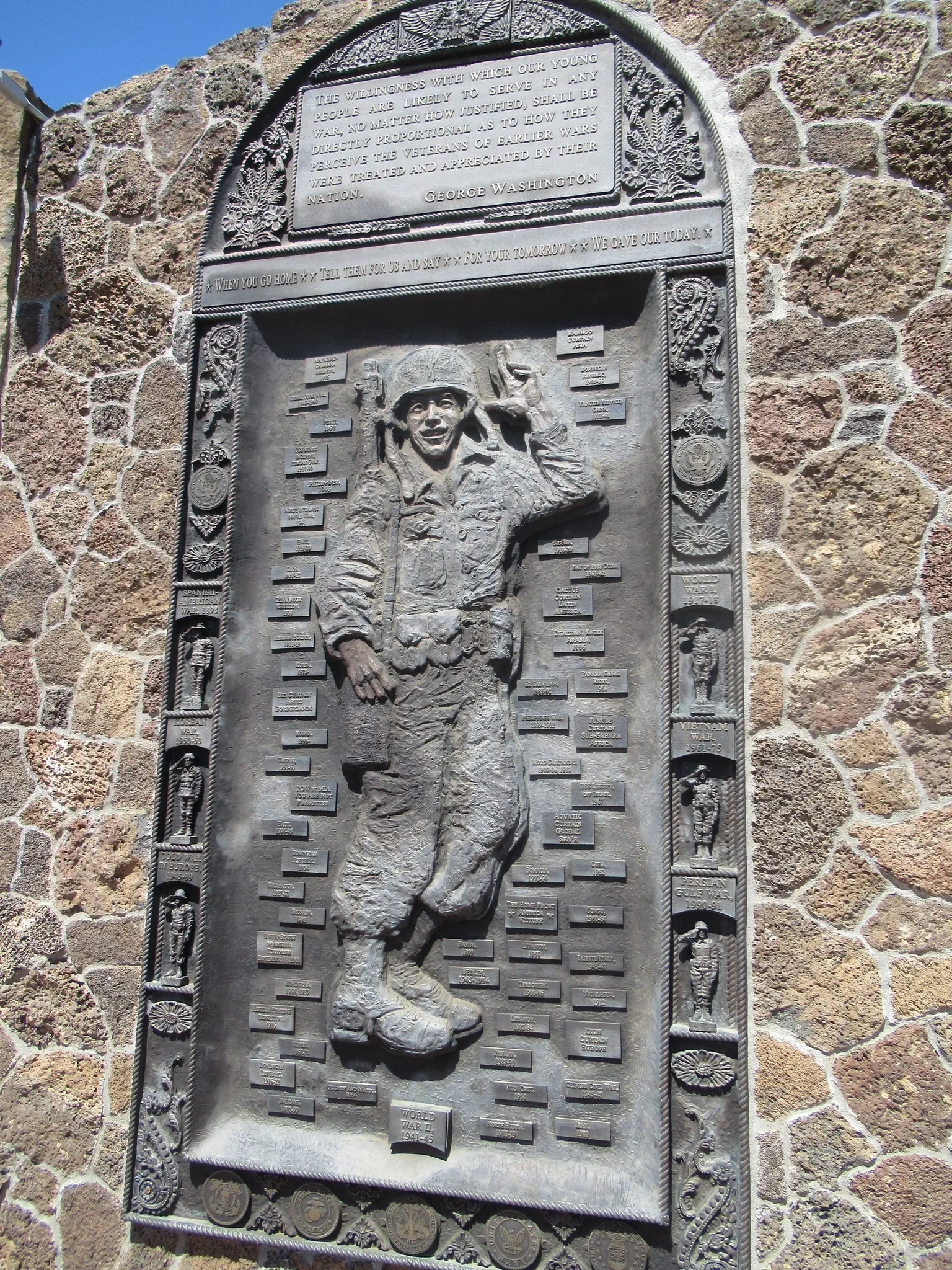 We stopped at McDonald's for ice cream right after crossing the 197 bridge back into Oregon. We used wi-fi in McDonald's to plan our next stops, and I used it to get our whitewater rafting tickets since that auto-paid on Viator this morning. Travis wanted to go to Fort Dalles next. He was busy trying to get the kiosk to buy the ice cream to work that I did not ask him about my only found option of Fort Dalles Readiness Center. It did not seem right, but was all that I found. I forgot about asking Travis about it and navigated us to the the Readiness Center. The family says that this looks like a jr. college. Indeed it did. We did pass a viewpoint and display on the way there, so we stopped there instead. It had Mt. Adams views and War Memorial displays that I was impressed with the metal work or metal art. Also, a great view of the town below.