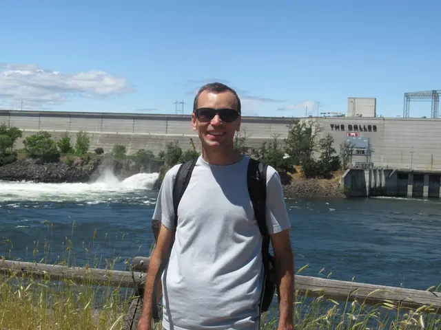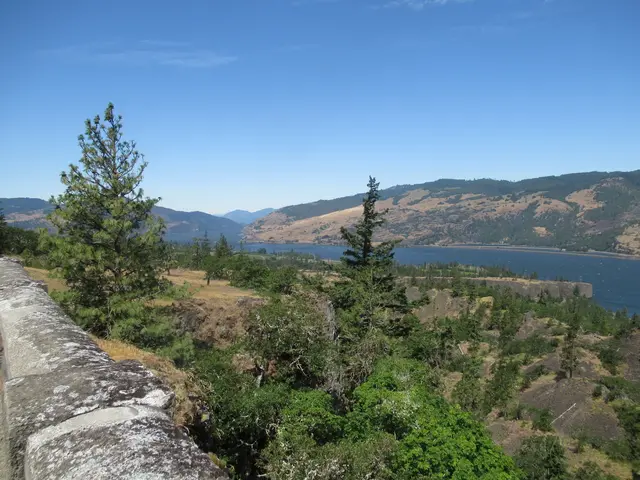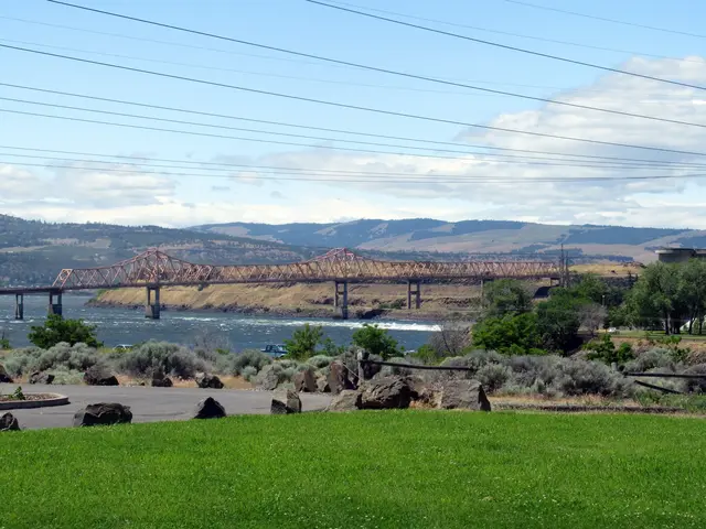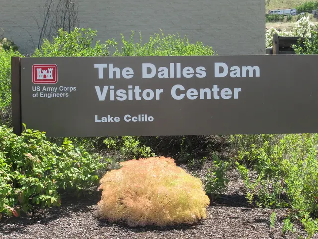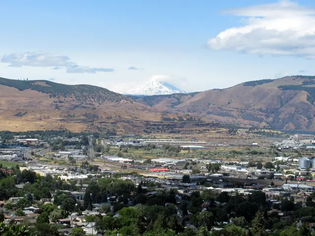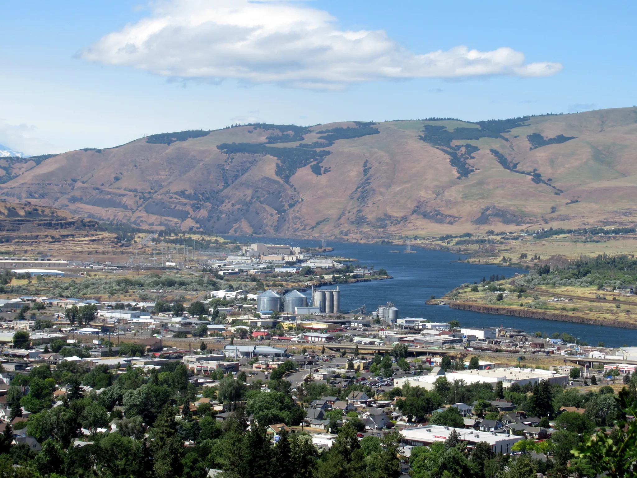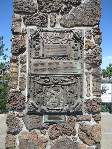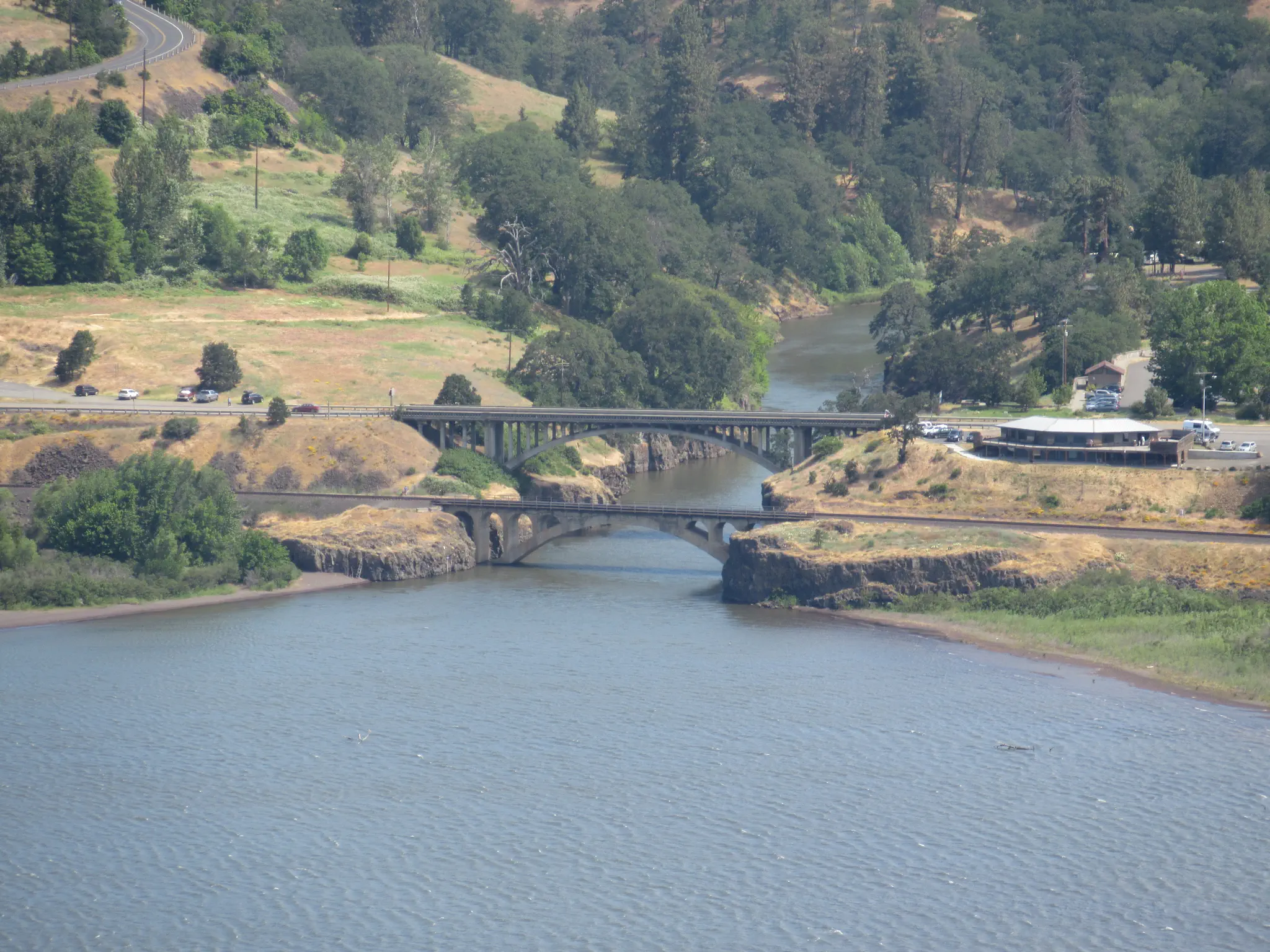 We stopped at McDonald's for ice cream right after crossing the 197 bridge back into Oregon. We used wi-fi in McDonald's to plan our next stops, and I used it to get our whitewater rafting tickets since that auto-paid on Viator this morning. Travis wanted to go to Fort Dalles next. He was busy trying to get the kiosk to buy the ice cream to work that I did not ask him about my only found option of Fort Dalles Readiness Center. It did not seem right, but was all that I found. I forgot about asking Travis about it and navigated us to the the Readiness Center. The family says that this looks like a jr. college. Indeed it did. We did pass a viewpoint and display on the way there, so we stopped there instead. It had Mt. Adams views and War Memorial displays that I was impressed with the metal work or metal art. Also, a great view of the town below.