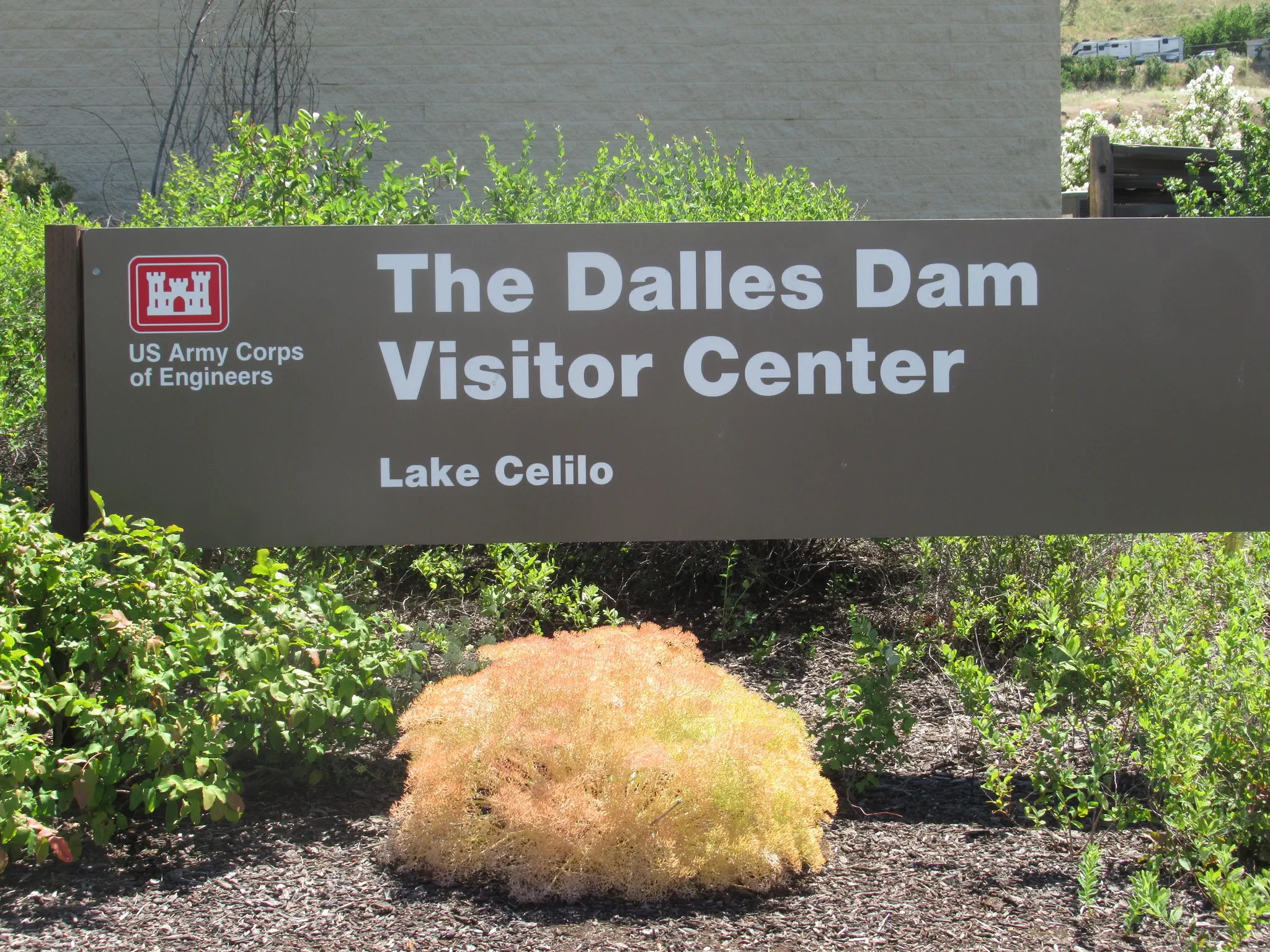 Moving more east, we went to The Dalles Dam. The Ranger played the movie about the dam project for us, and we looked at the displays. I set the camera down to get a national park stamp and found it after looking at the displays, oops. We asked her if there were any hiking trails or powerhouse tours. Their powerhouse is not open to the public, and she noted a short trail to closer to the dam and to the rose garden. Good views of Mt. Adams on the Washington side. A group arrived and was setting up a birthday party of the porch of the visitor center. They may have planned the picnic tables near the rose garden first but with the wind moved to a more sheltered area.