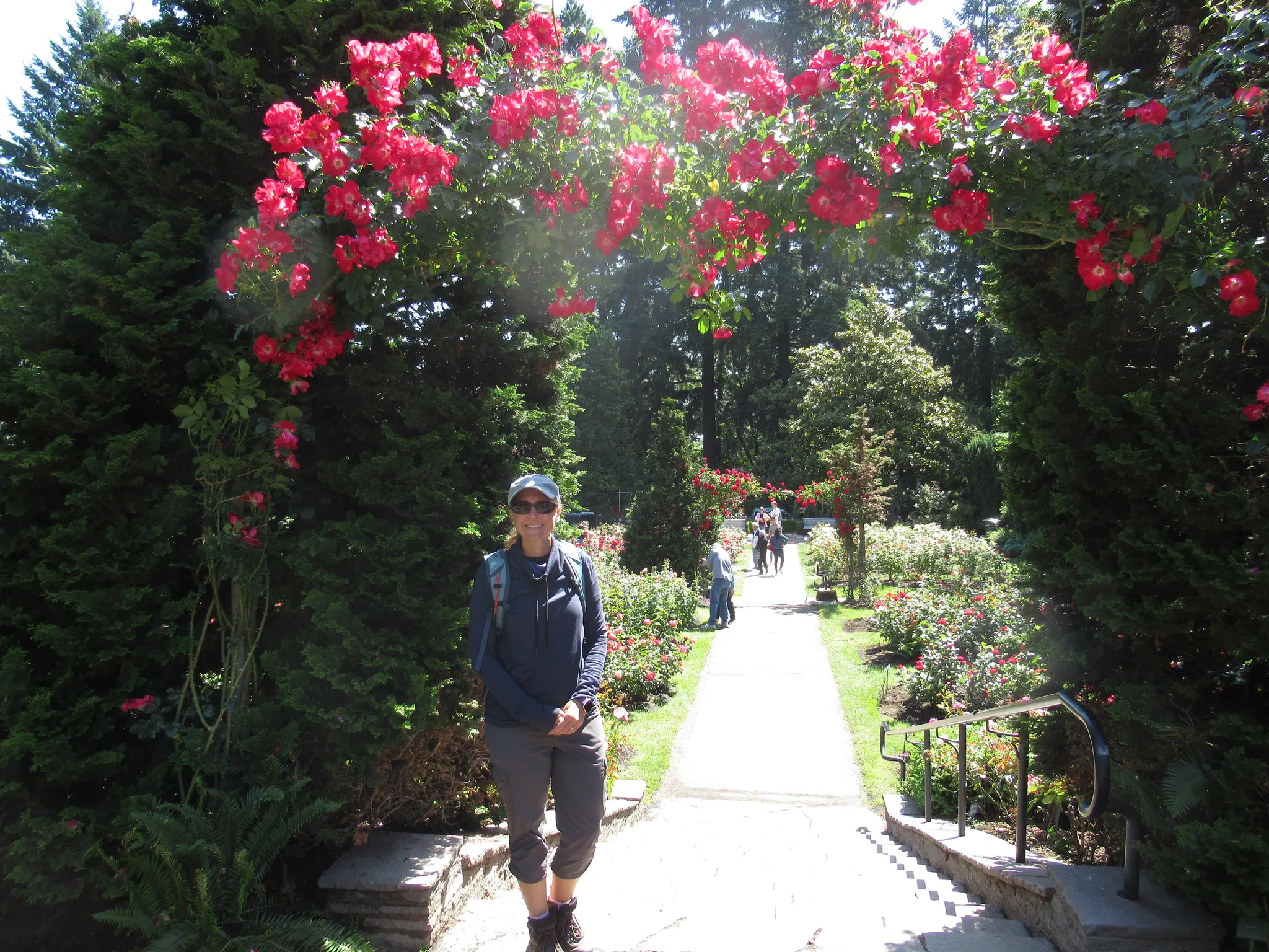 Then we went through, at least some, of the Hoyt Arboretum. From the Arboretum, we went to the Hoyt Visitor Center to visit the restroom and catch the free shuttle. It took a while to come and to get the live tracking to work, but Travis got it work and then it came. We rode to the Rose Garden on the other side of the park. The shuttle was in the park and along some residential streets; it went up and down hills.
