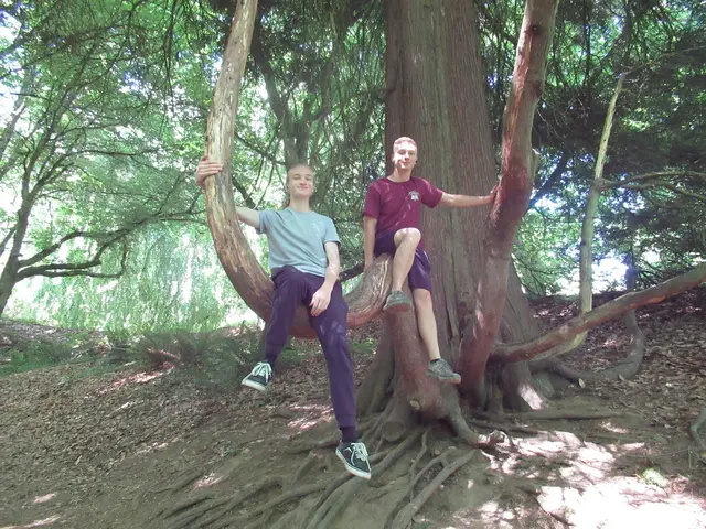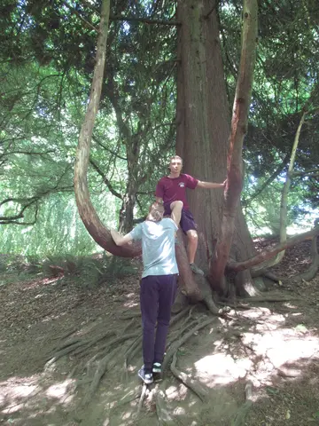 After the garden, we walked a trail back instead of taking the shuttle. Travis managed to make the full hike uphill (I think). The kids found a cool tree.