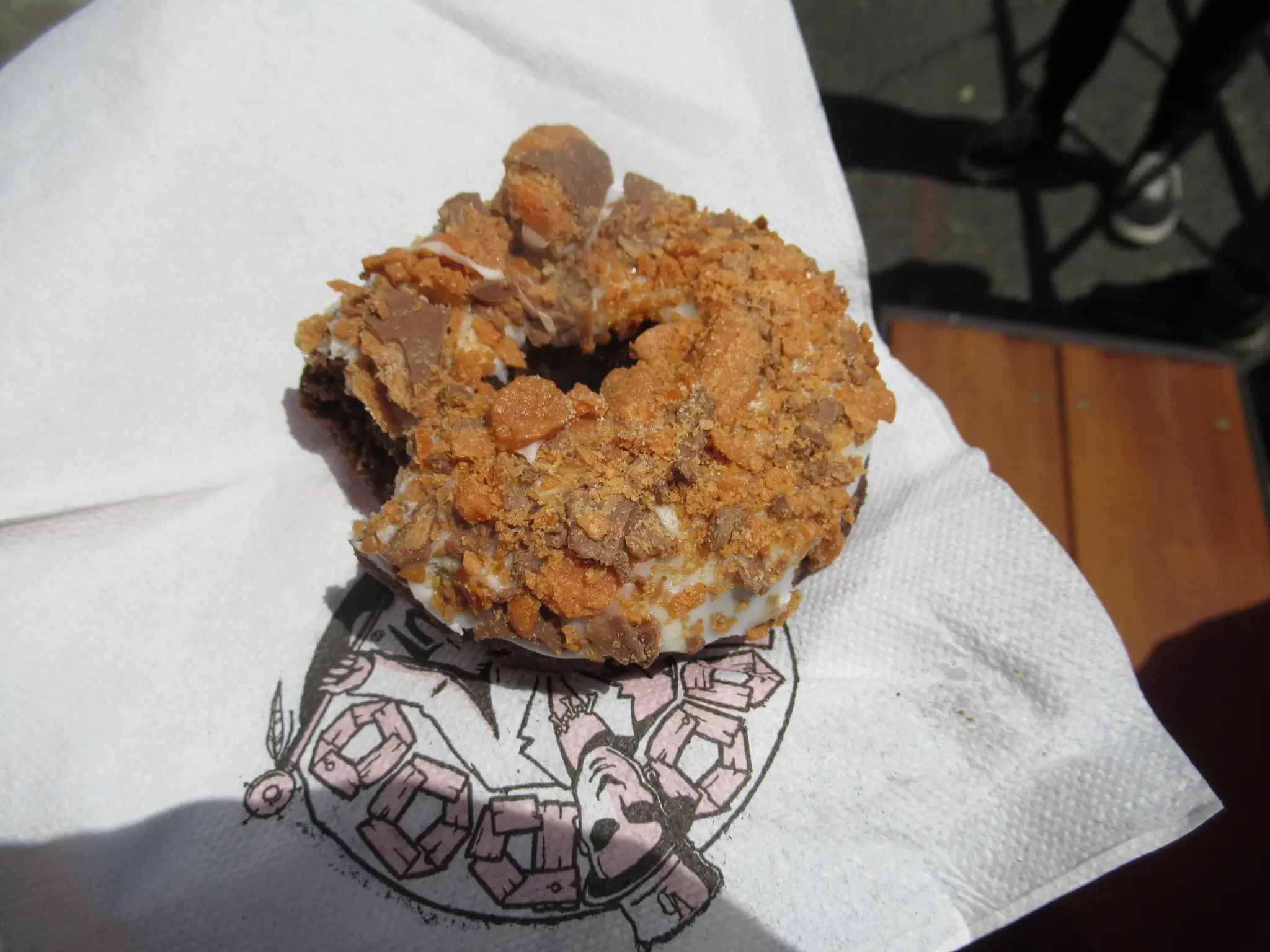 We were starved by this point so started searching for food. We decided on Shanghai's Best in Pine Street Market. We shared some Pan Fried Port Dumplings and Shao Mai (steamed dumpling filled with glutinous rice and pork). Everyone like something -- Joel and I liked the dumplings better, and Travis and Owen liked the Shao Mai better. Joel and I were not a big fan of the glutinous rice flavor. There was wifi, so we scoped out the menu and a stop at Voodoo donuts. It was a short distance to it, and we waited in line, which was not too long. My only food picture the Butterfingering that I got. It was a cake chocolate donut, vanilla frosting, and Butterfinger on top; very good! Everyone else got more economical donuts and enjoyed them too.