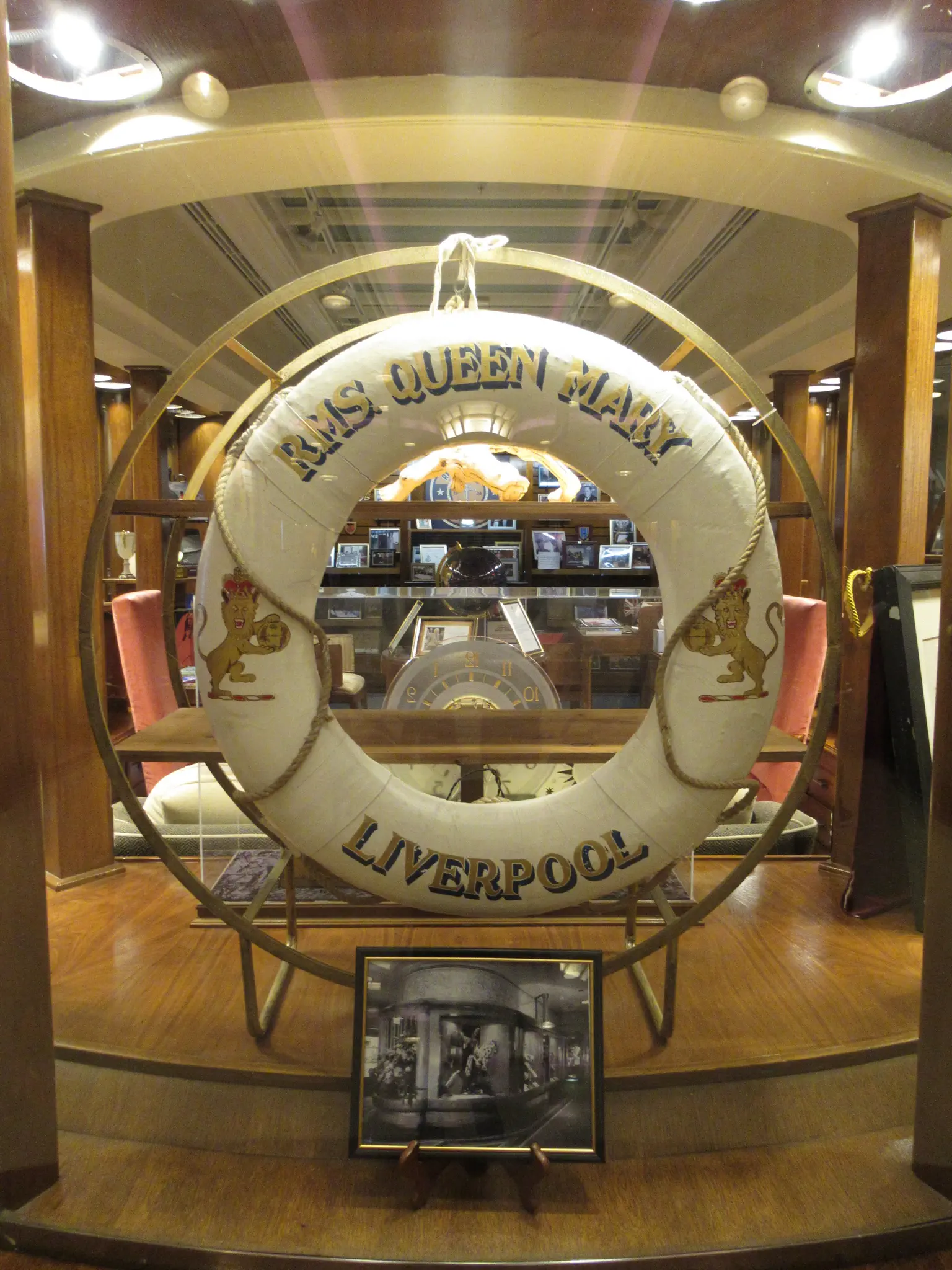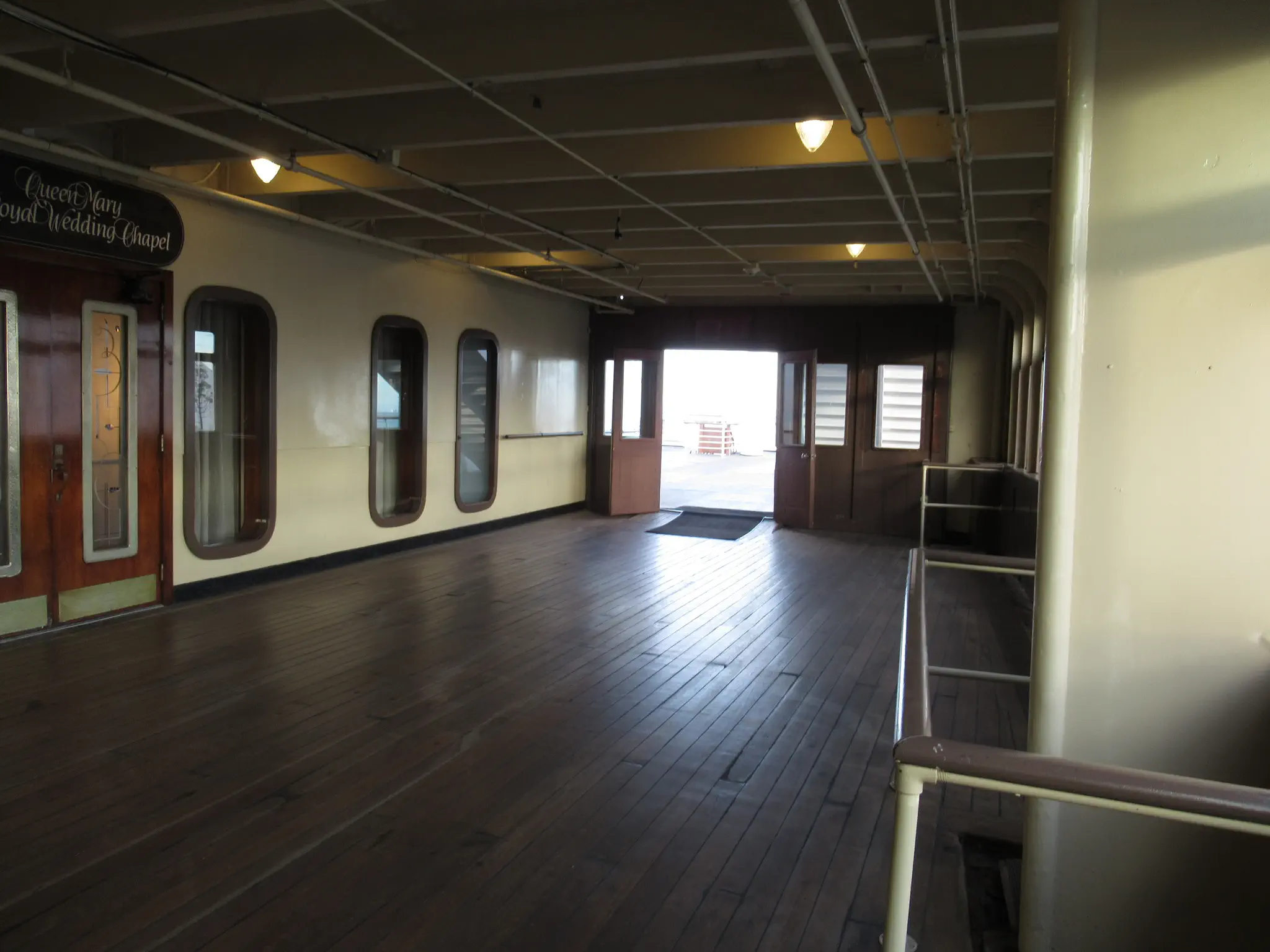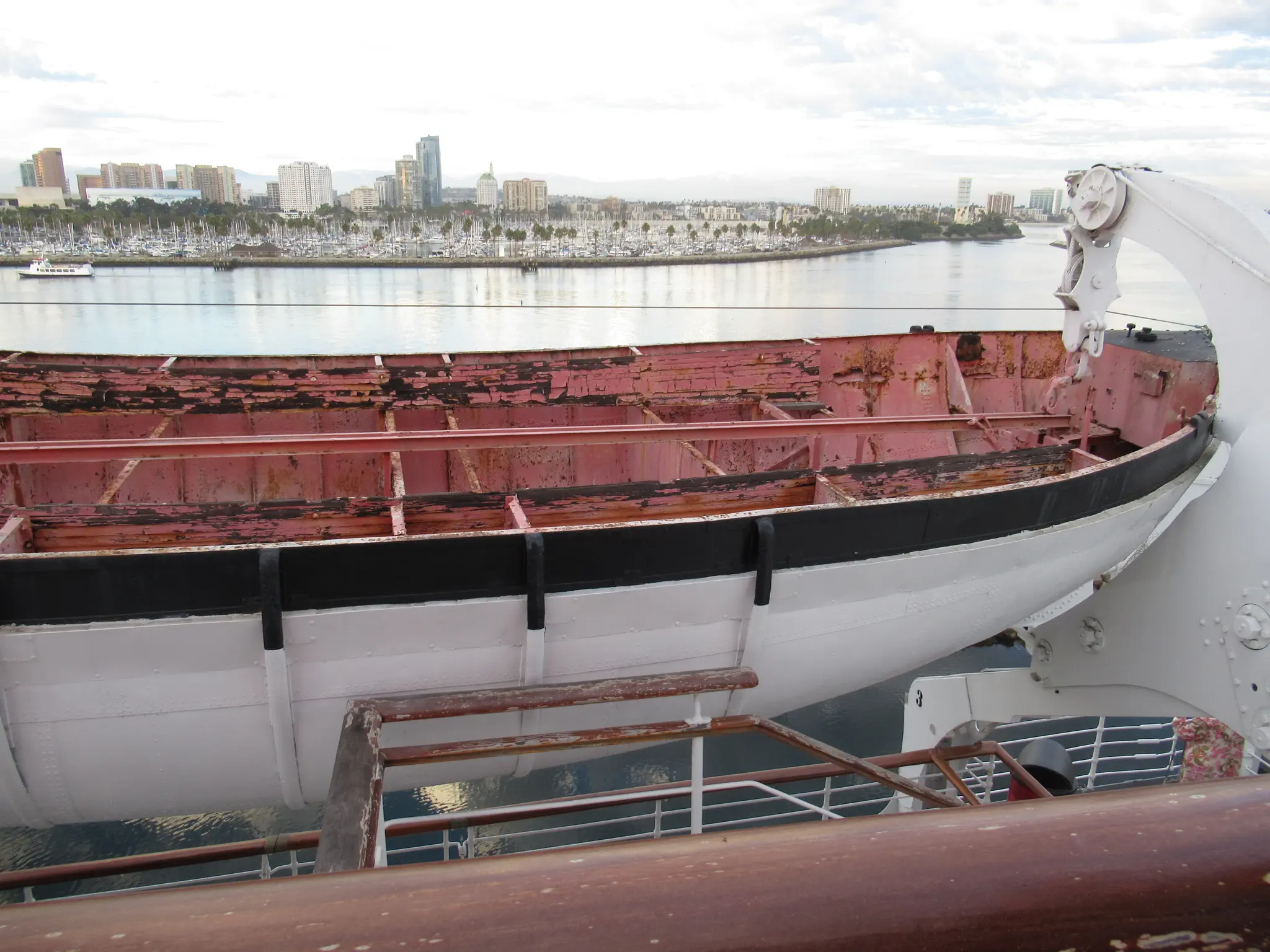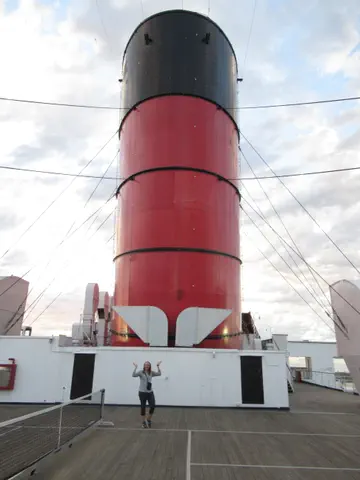 We continued our ship exploration the next day.The promenade. I liked this view out of a Queen Mary porthole of the Carnival dome cruise ship terminal with cool trees in front. Us with one of the funnels. This also shows the tennis court. An unrestored lifeboat.