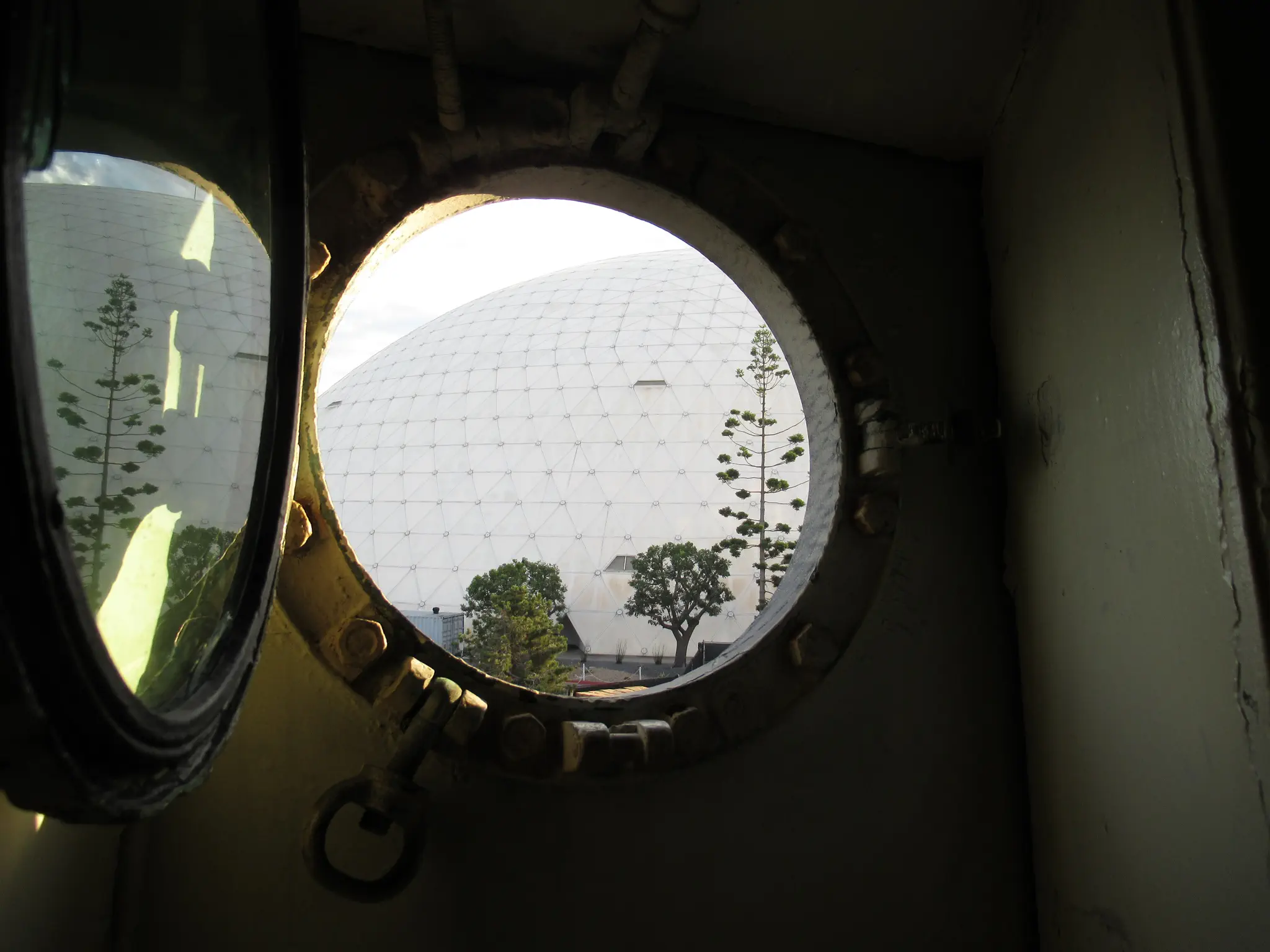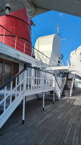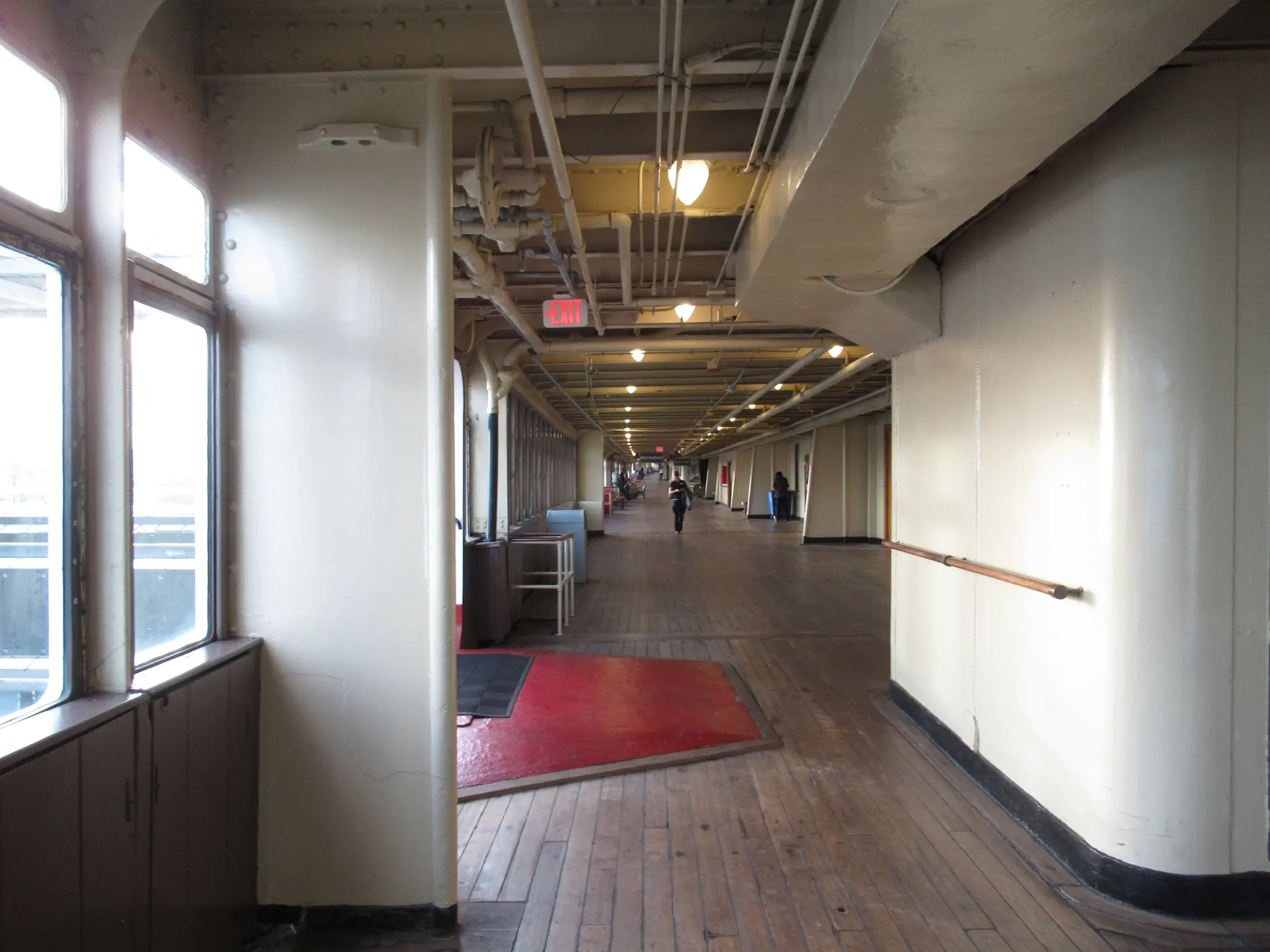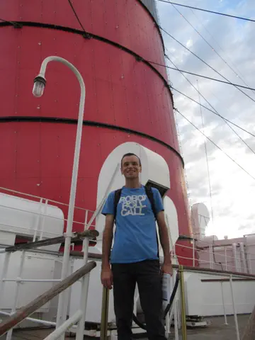 We continued our ship exploration the next day.The promenade. I liked this view out of a Queen Mary porthole of the Carnival dome cruise ship terminal with cool trees in front. Us with one of the funnels. This also shows the tennis court. An unrestored lifeboat.