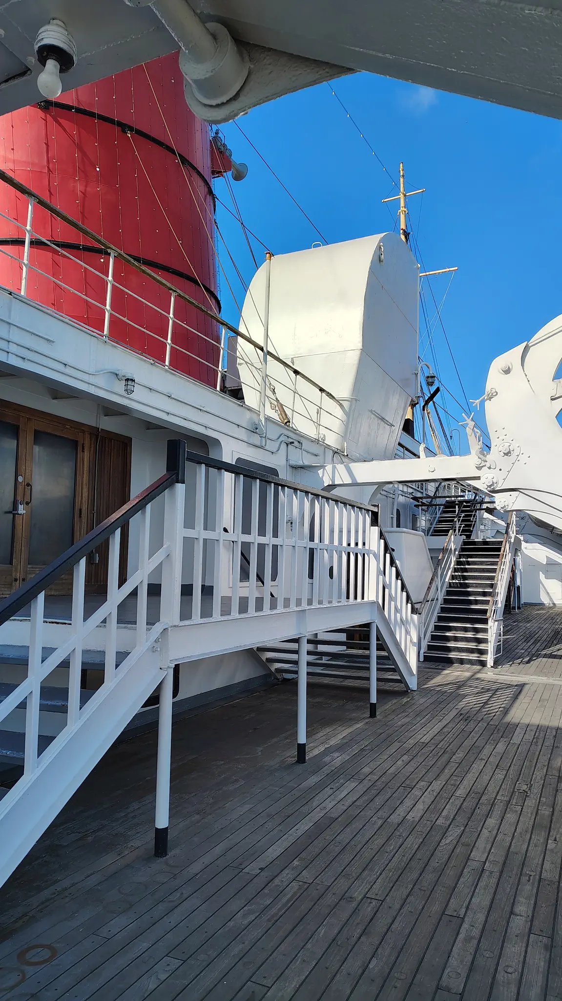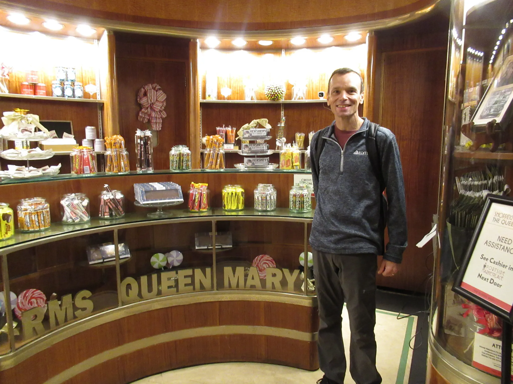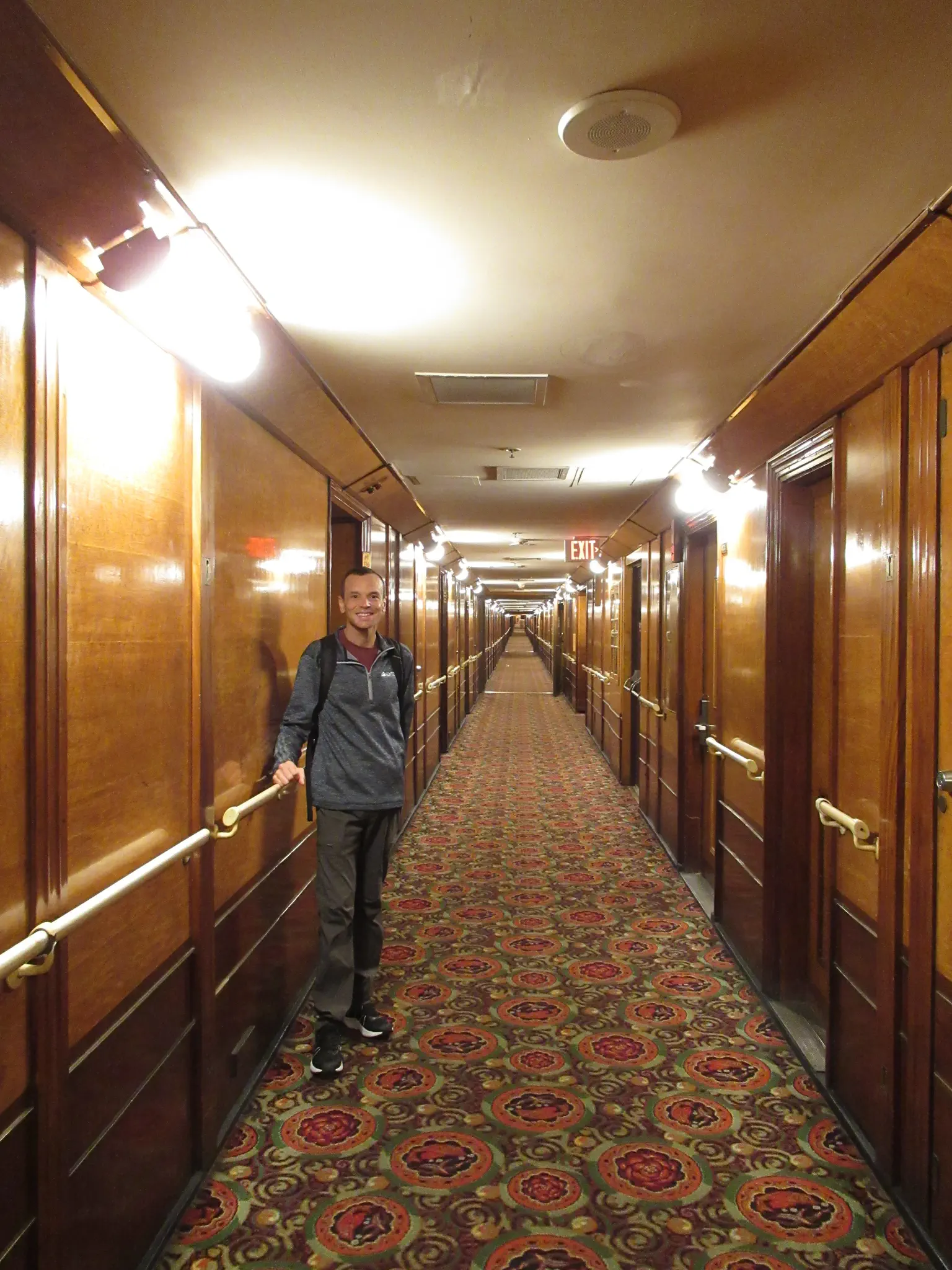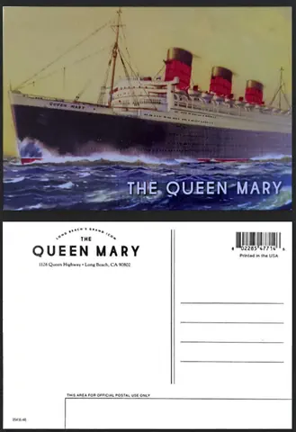 Hello, Queen Mary! She is looking more shiny now; they were still working on her when we saw her in 2023. The hotel entrance was the second covered area in the picture. They checked us off the list and let us enter for check in. We checked in, dropped our stuff in the room, and started exploring the exhibits. They closed at 5:30pm and reopened the next morning at 10am. Though not all displayed closed, some were visible from the normal hallways. At check in, they told us that the rooms did not have an A/C control. We used the provided blanket in the closet, but it was still cold. I was disappointed that the rooms did not look more like ship cabins today but looked more like a hotel room. However, the hallways were very stately with wood paneling. It was very roomy. They also noted thin walls on the rooms because when the ship's engines were running that provided white noise, and now we don't have that. They provided earplugs. It was not bad. Travis could hear my phone conversation form outside the room, but I did not hear others while we were in the room. We got an inside room for the king size bed instead of two twins. I booked the room with the 2024 Black Friday sale. I did not get a picture of the bathroom, but here is the room. The bathroom was spacious with a good sized shower, though no shelves to put stuff. They provided bar soap and body wash. A postcard that they gave us with the room.