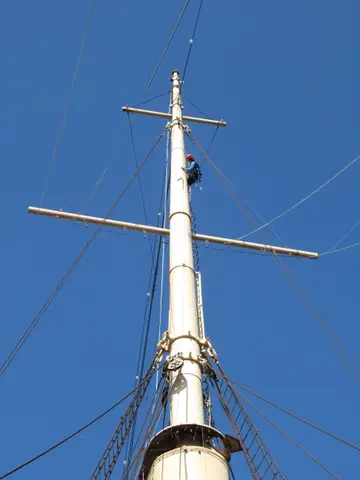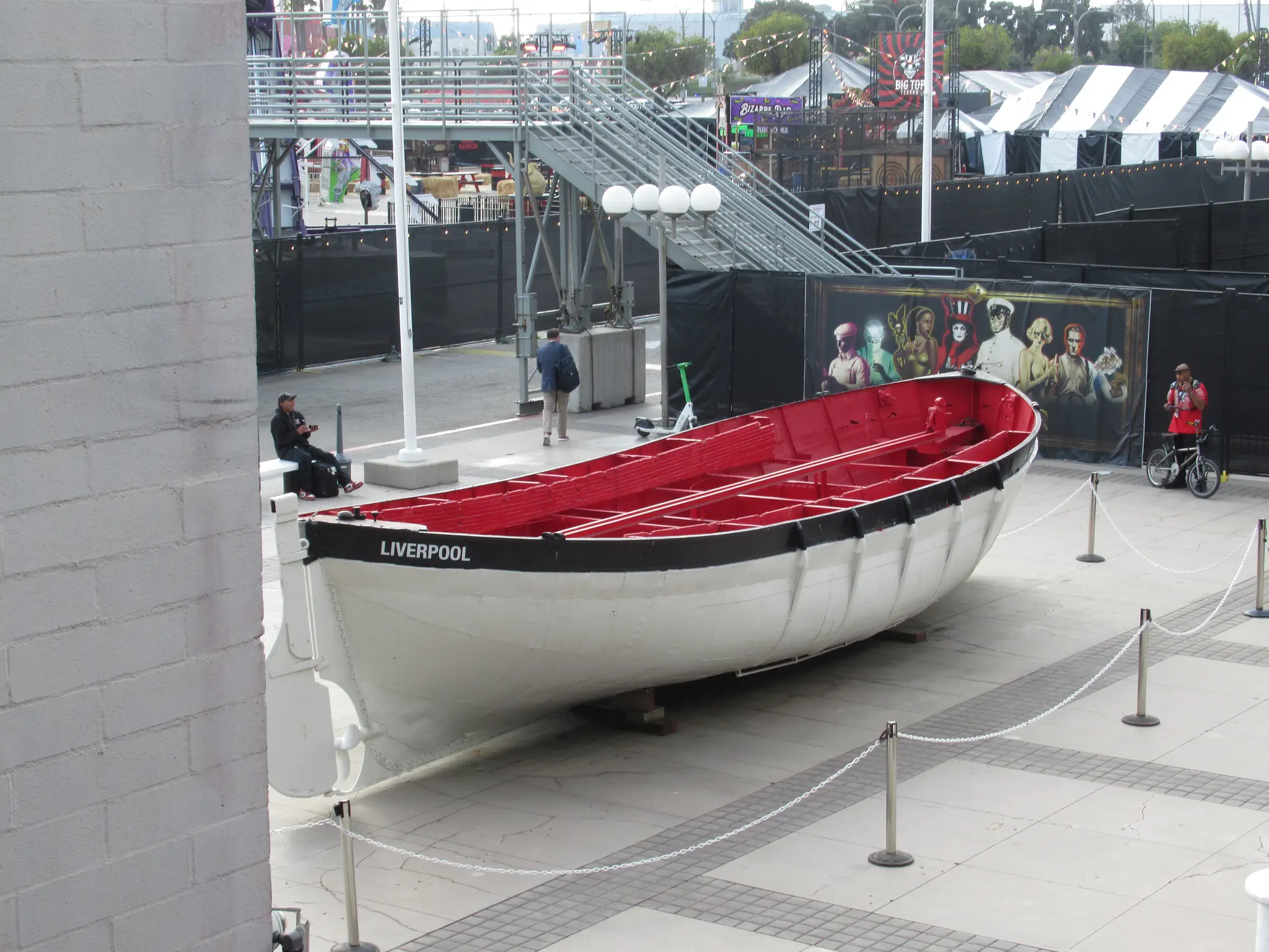 More around the ship pictures. An empty lifeboat holder, a man working very high up the mast, and the Halloween event. We did not go to this; the tickets were about $46 each. We looked at it at night; it had strobe lights and fire shooting up. There were a haunted house and rides.