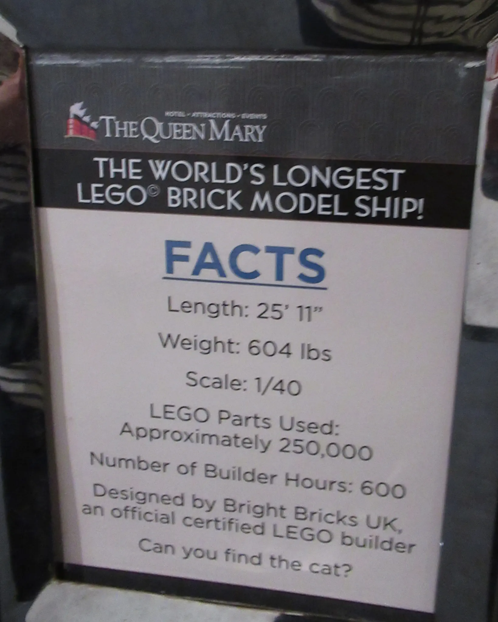 We then found the Lego Queen Mary; that is one big Lego set -- look at the facts (but now that I read it again, it is very qualified). Very cool; no, we did not find the cat.