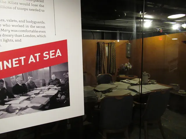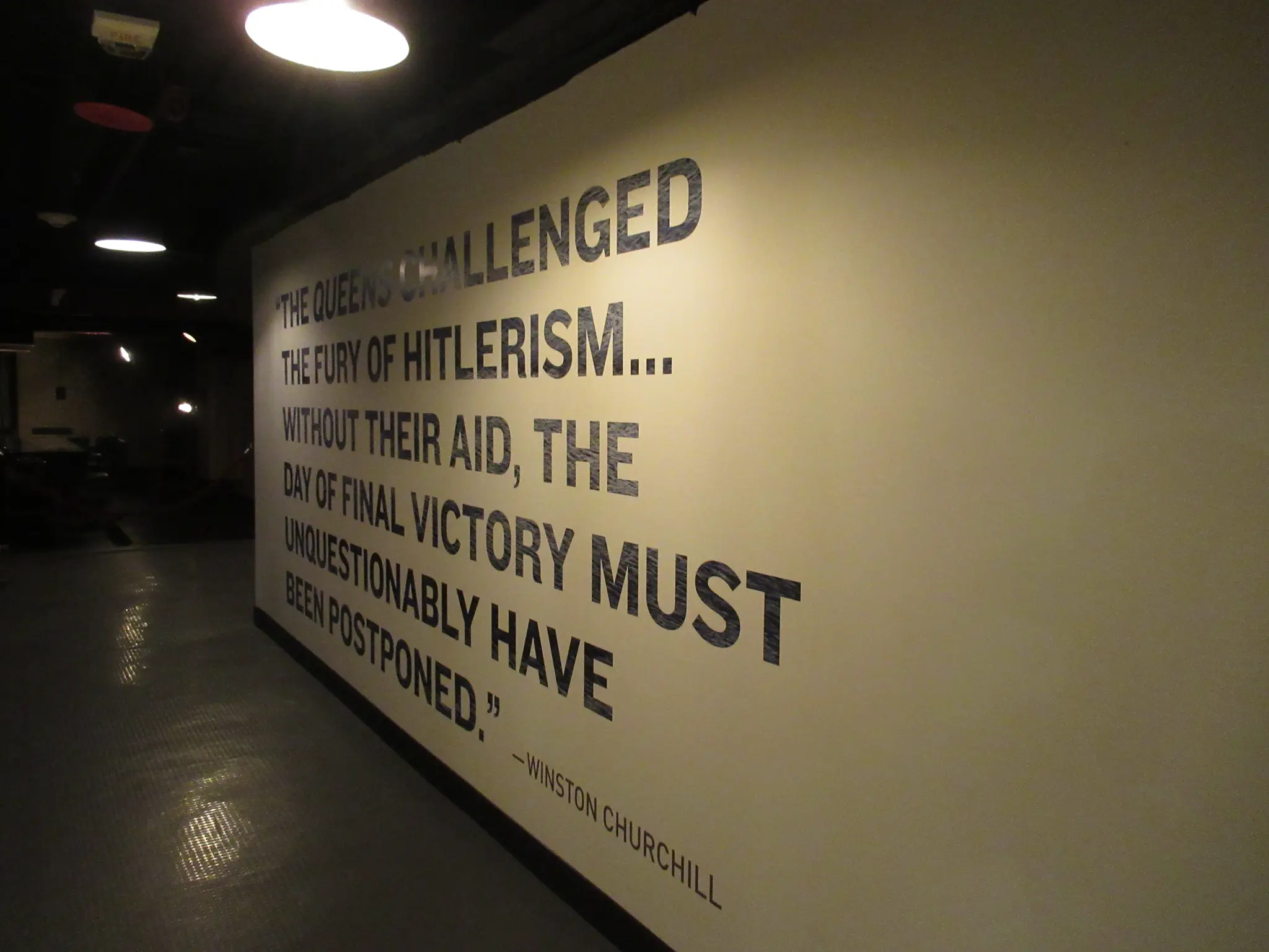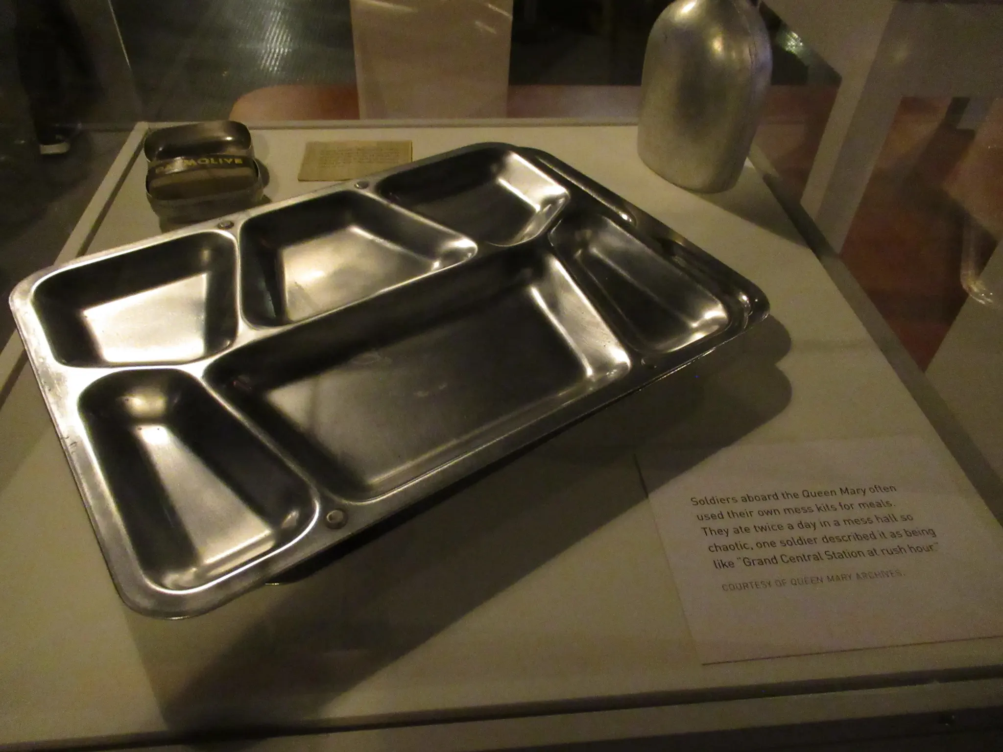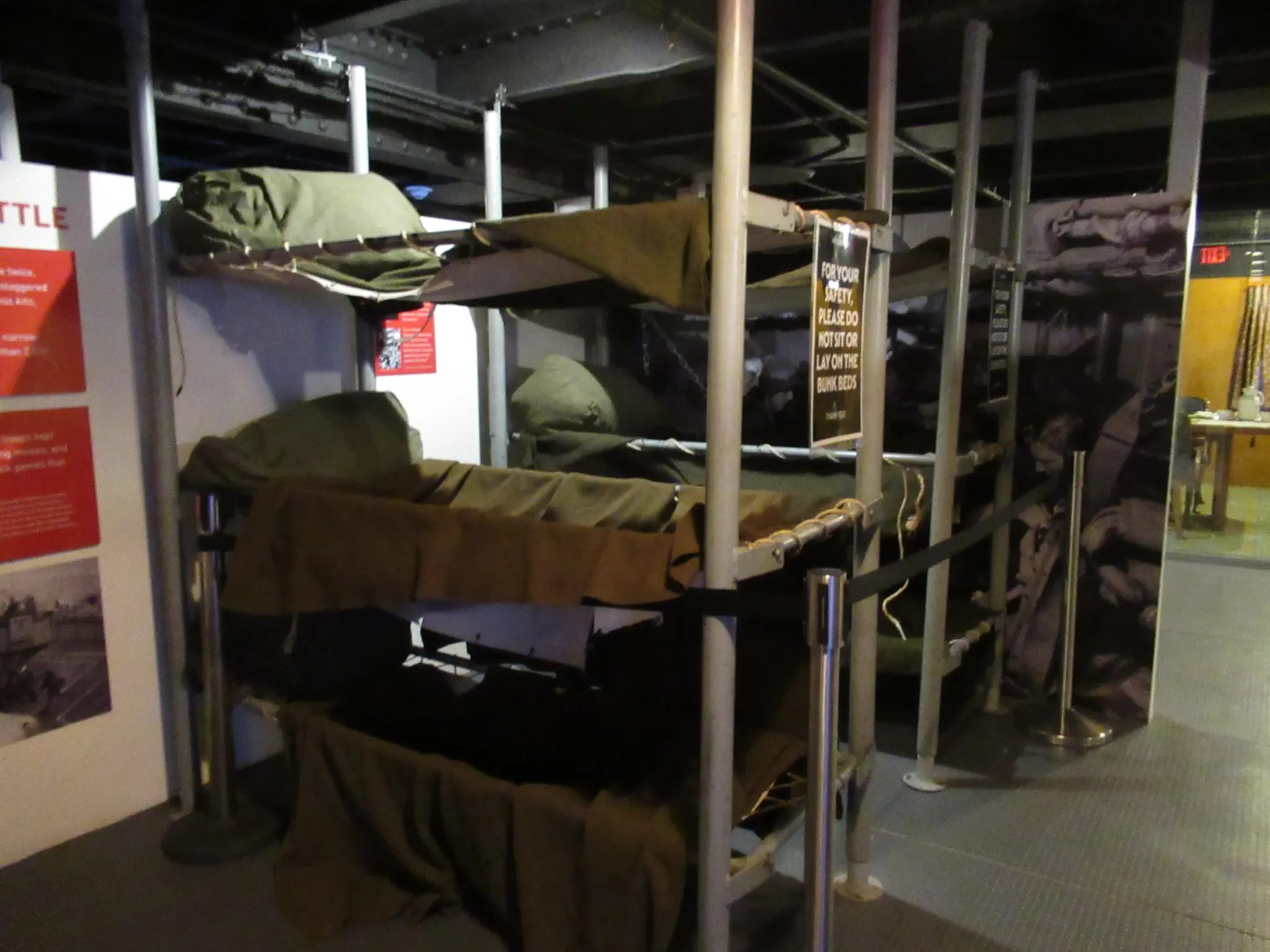 The print room for printing the list of daily activities. Then the display went outside the ship to see the propellers. Next, we learned about Queen Mary's (and other Queens) help during WWII. She transported many soldiers to the battle zone. Here is Winston Churchill's planning and meeting room; he also had a cabin on the ship. The soldier's bunks and self-supplied mesh kit. The guns on the bow.